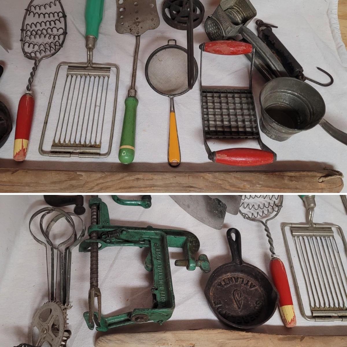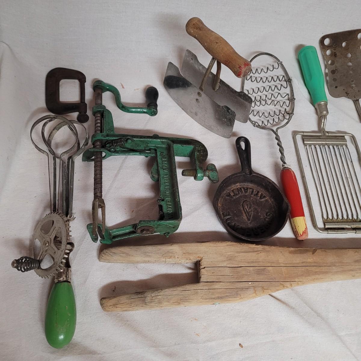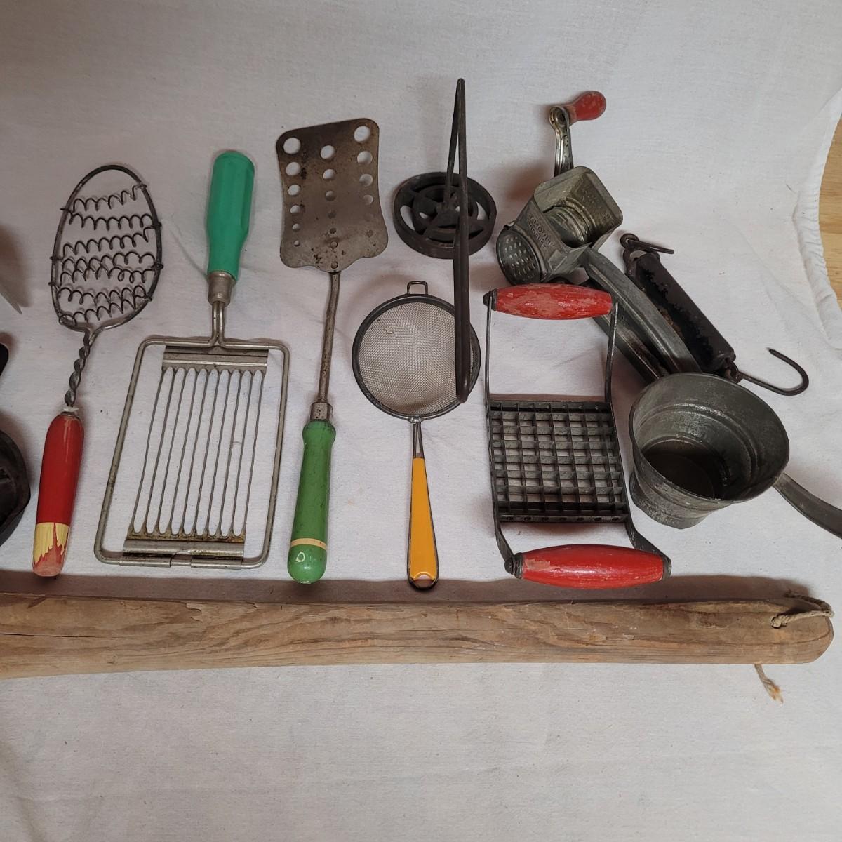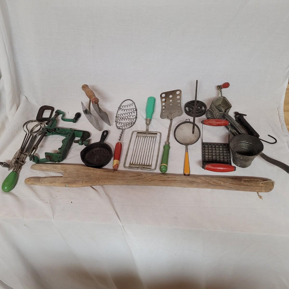 This lot includes 15 pieces of vintage/ antique kitchen utensils and tools. Items include hand mixer, countertop clamps, pastry cutter, miniature cast iron, cheese slicer, spatula, strainers, fry cutter, cheese grater, wooden stirrer, and hanging scale. See photos for individual items.