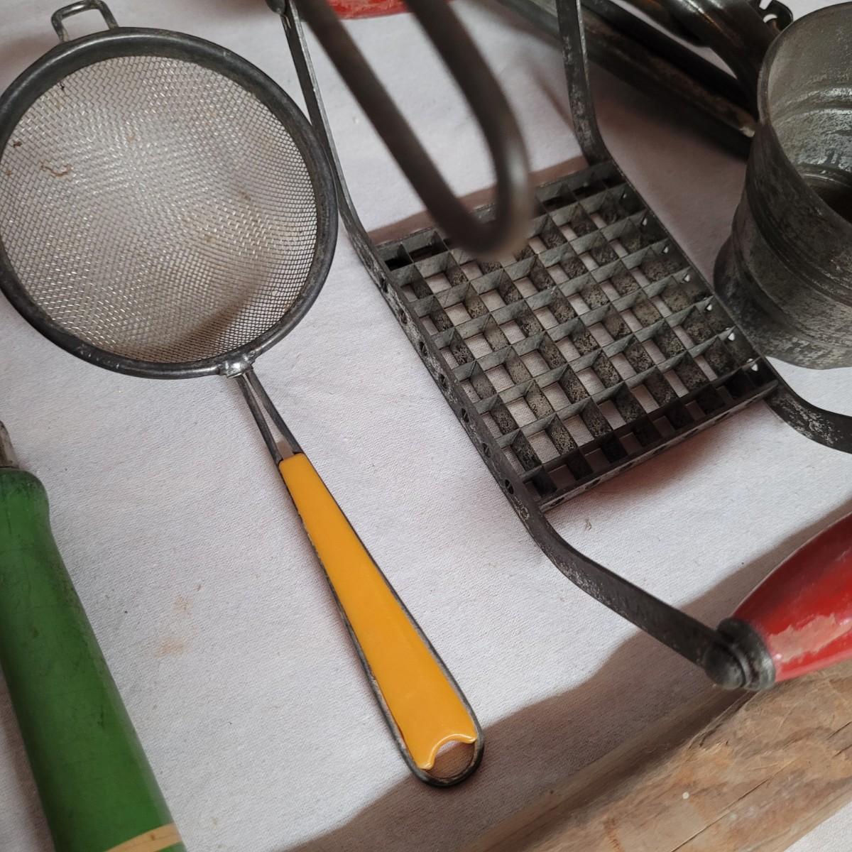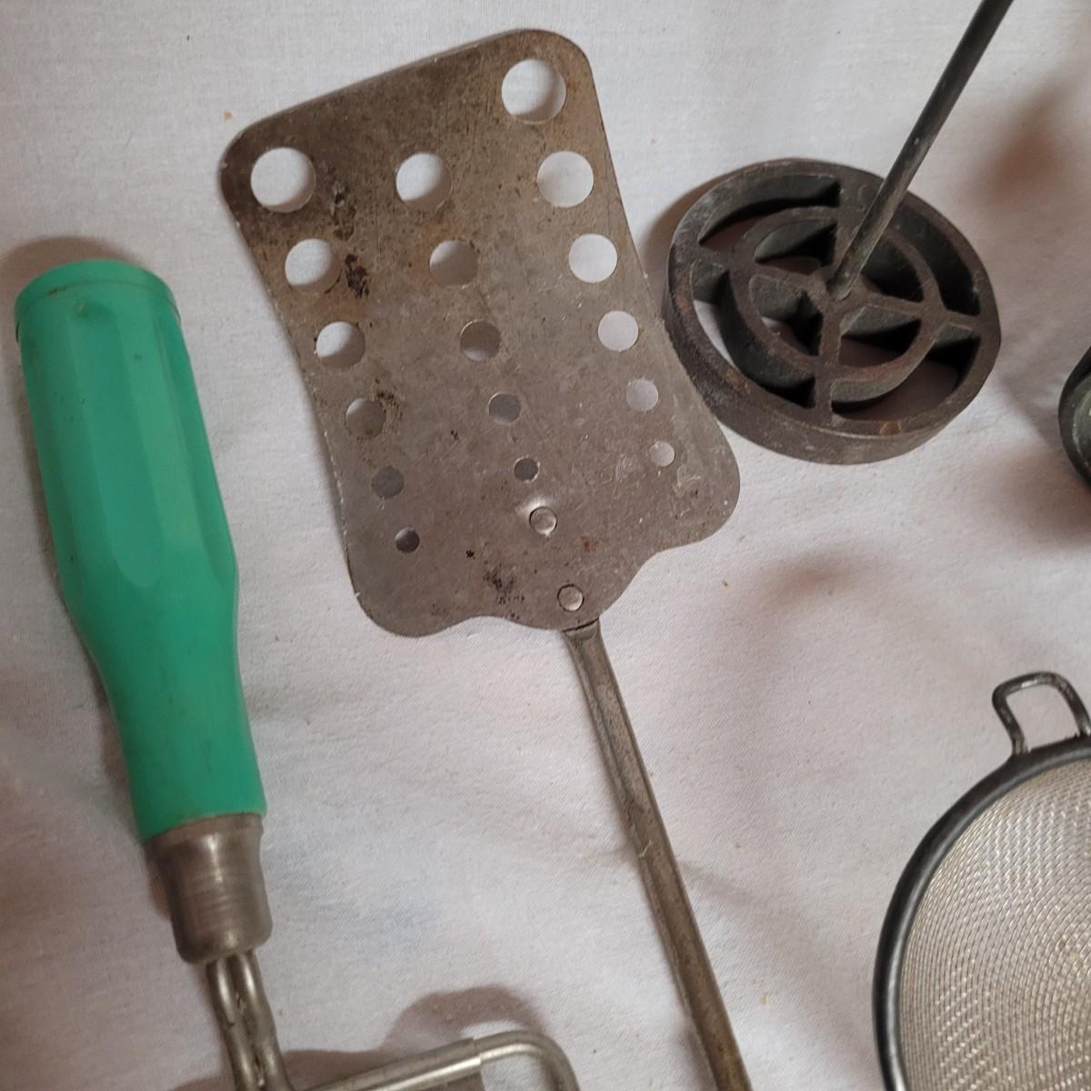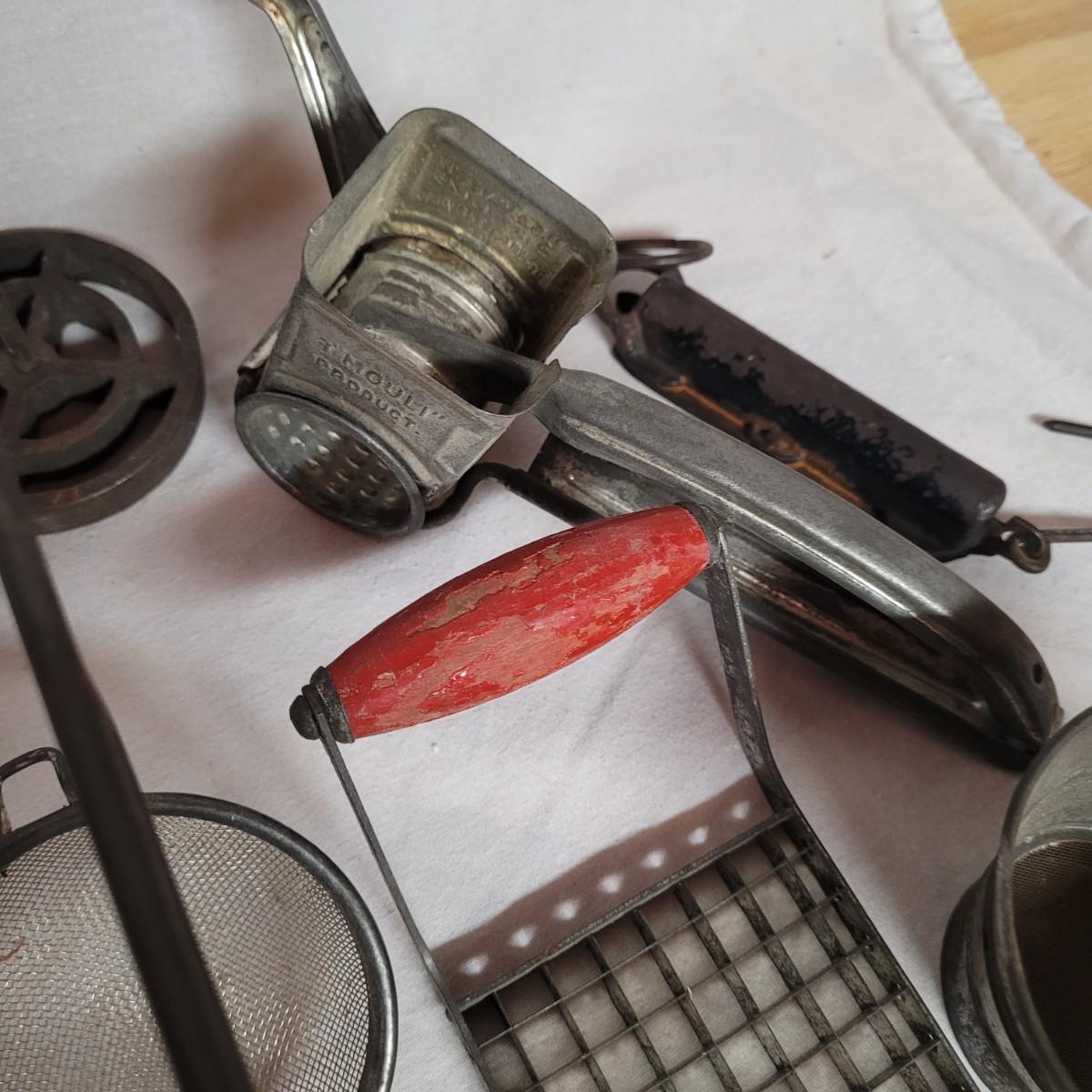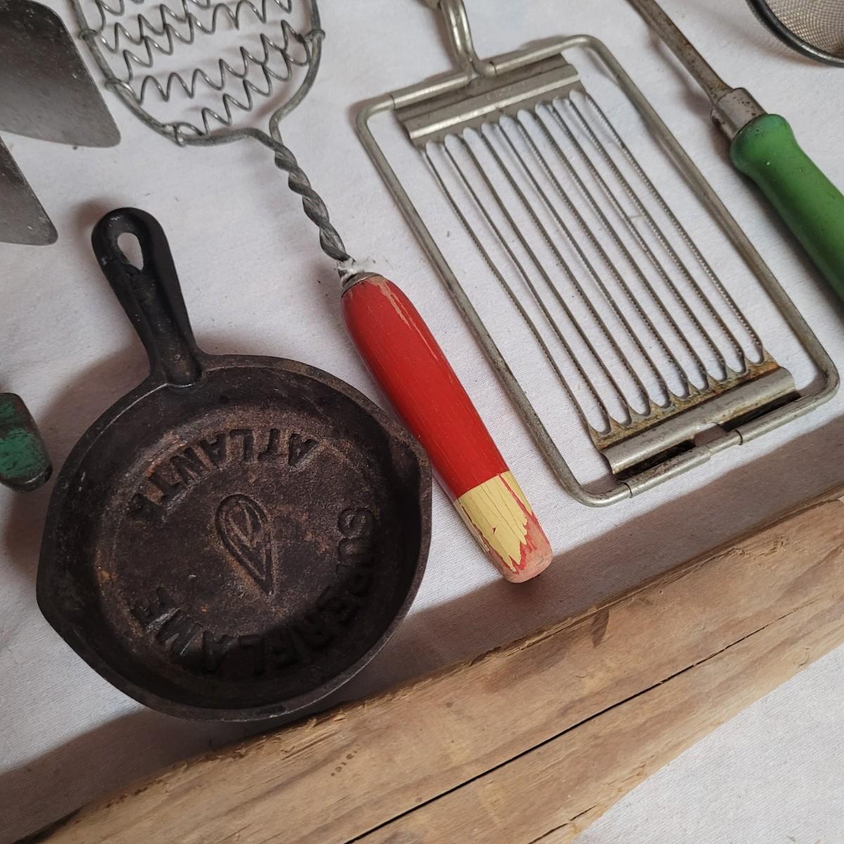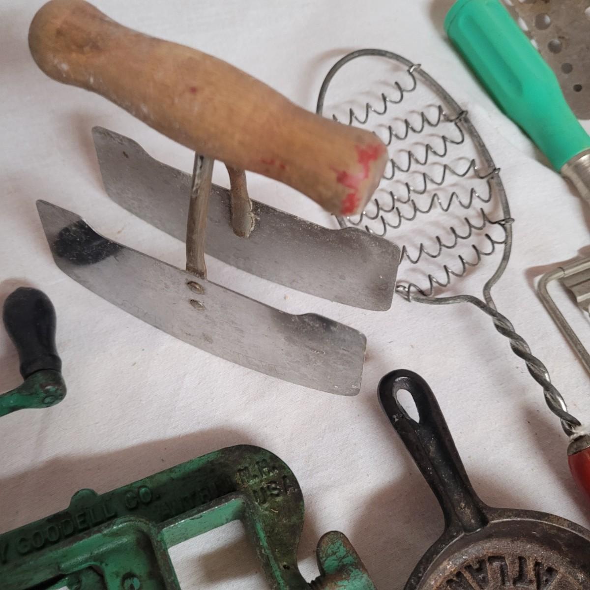 This lot includes 15 pieces of vintage/ antique kitchen utensils and tools. Items include hand mixer, countertop clamps, pastry cutter, miniature cast iron, cheese slicer, spatula, strainers, fry cutter, cheese grater, wooden stirrer, and hanging scale. See photos for individual items.