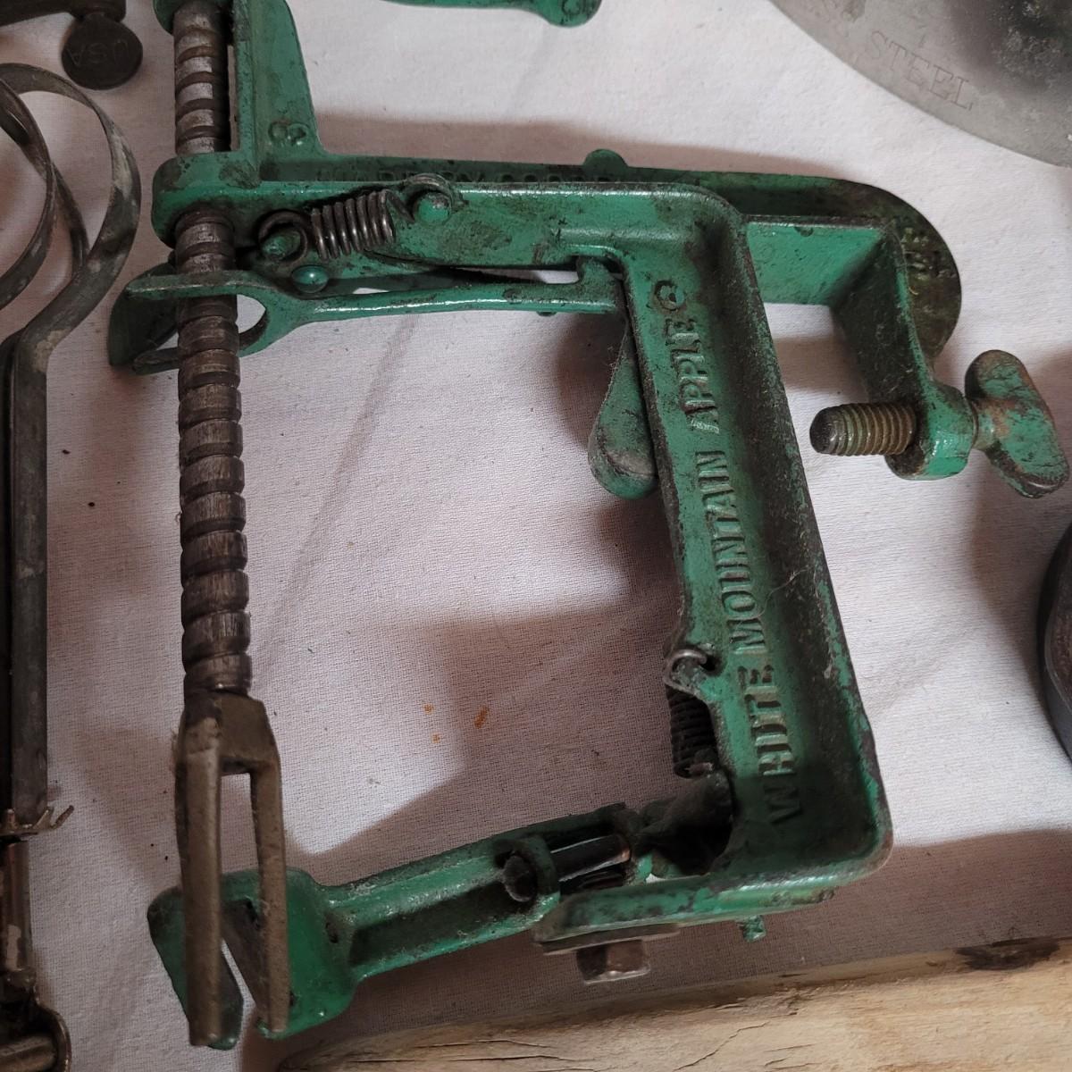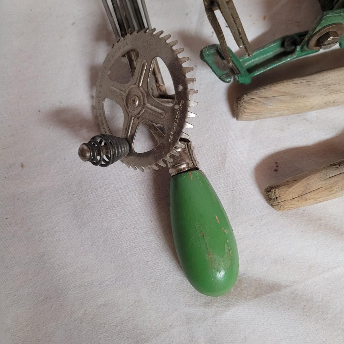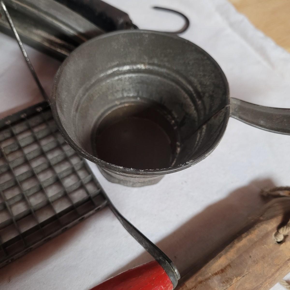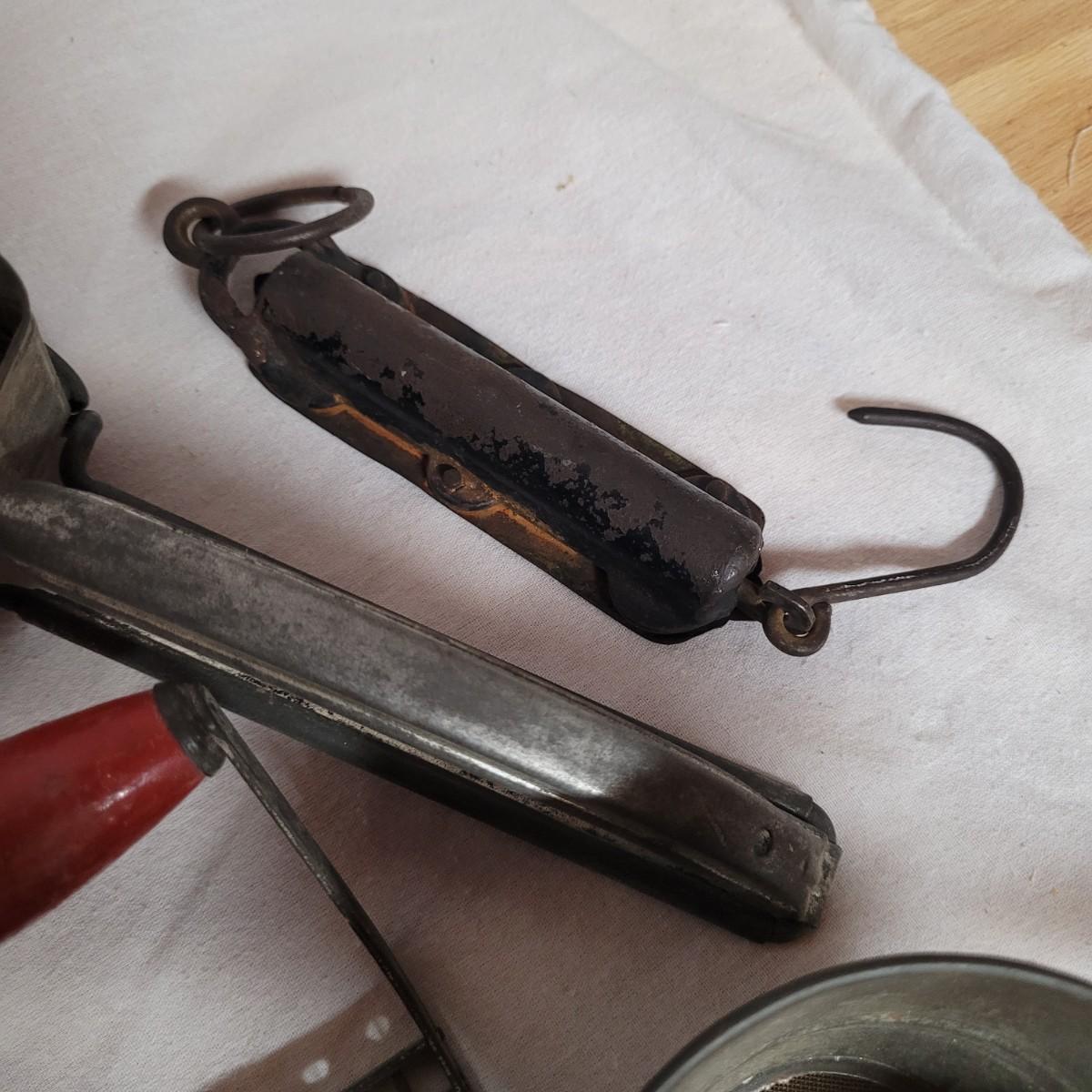 This lot includes 15 pieces of vintage/ antique kitchen utensils and tools. Items include hand mixer, countertop clamps, pastry cutter, miniature cast iron, cheese slicer, spatula, strainers, fry cutter, cheese grater, wooden stirrer, and hanging scale. See photos for individual items.