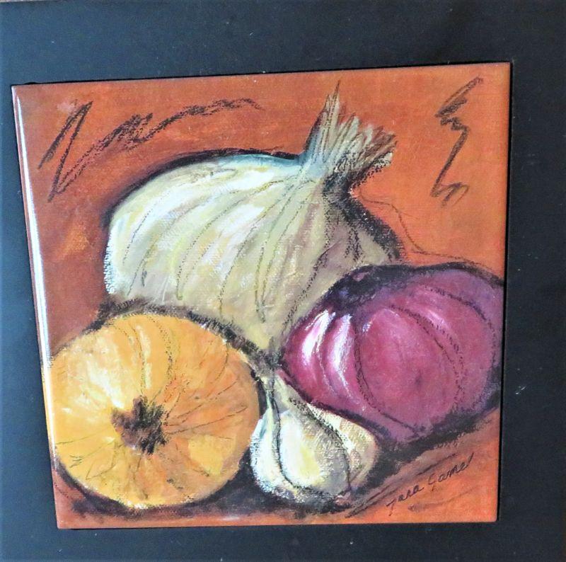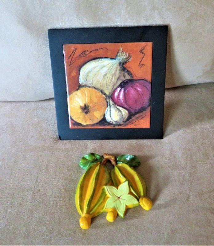 Vintage Kitchen Wall Art Vegetables LOT. Black framed on Tile signed. Cute Ceramic wall hanging. In Good Condition for its age.