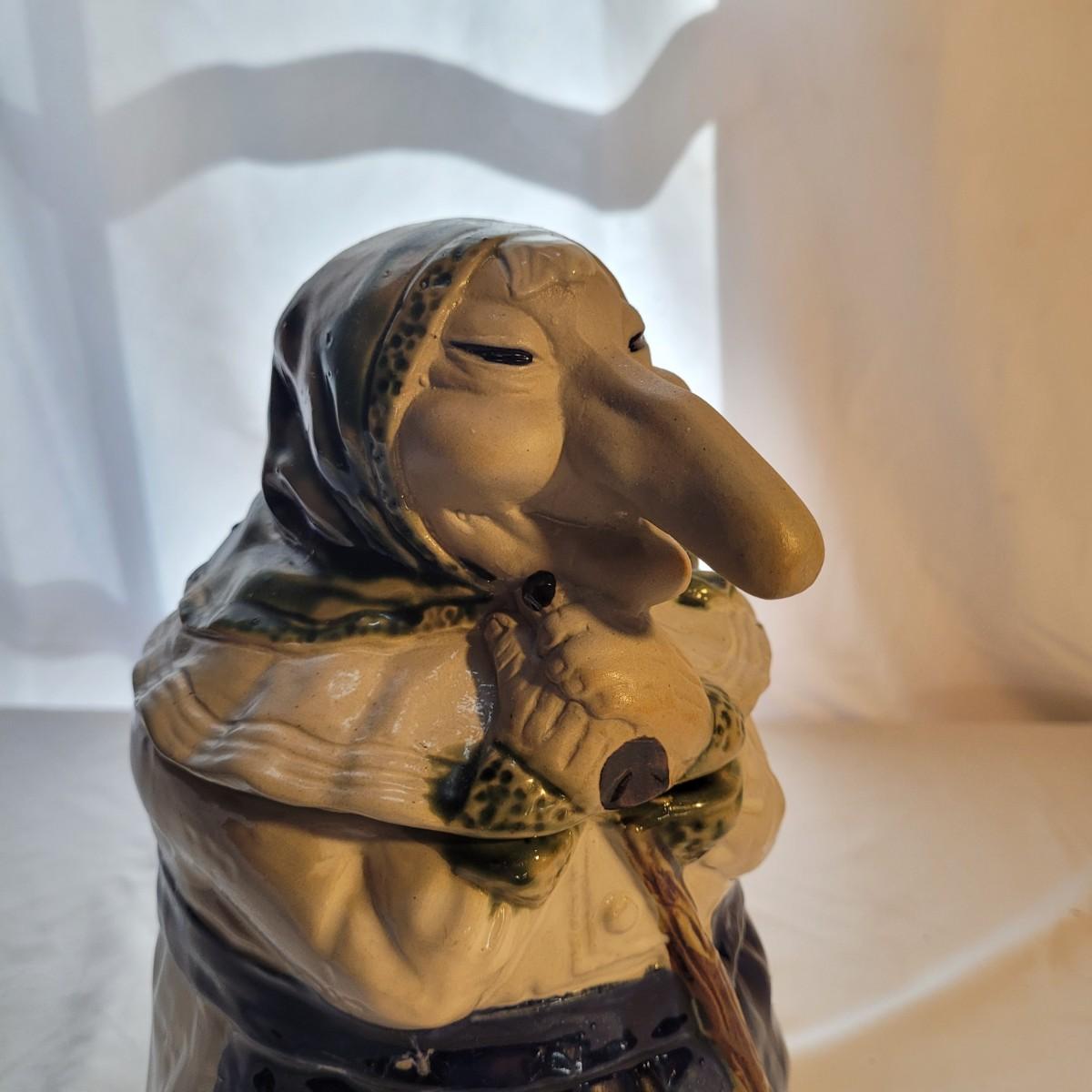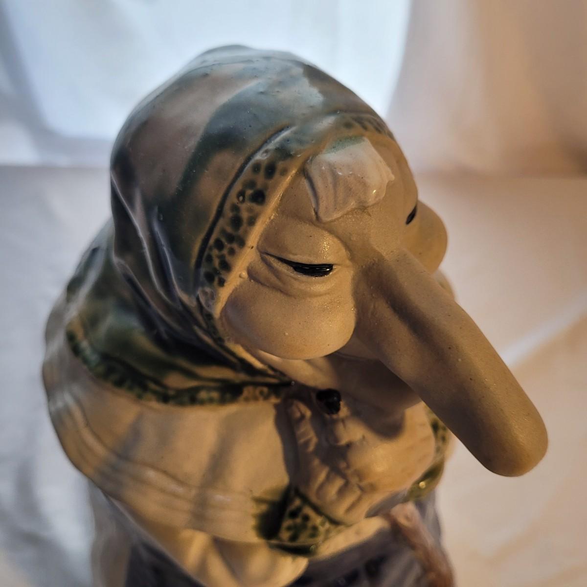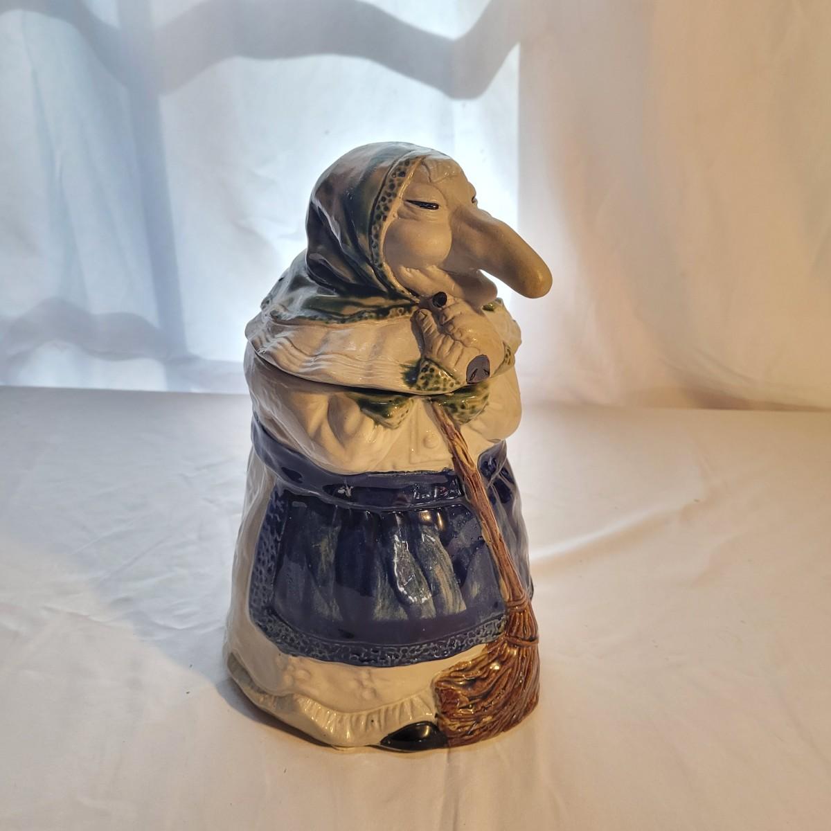 This ceramic vintage witch cookie jar is whimsical and endearing, with a smiling old witch with her broom. Looks similar to Strega Nona character. Measures approximately 12”H. Shipping available.