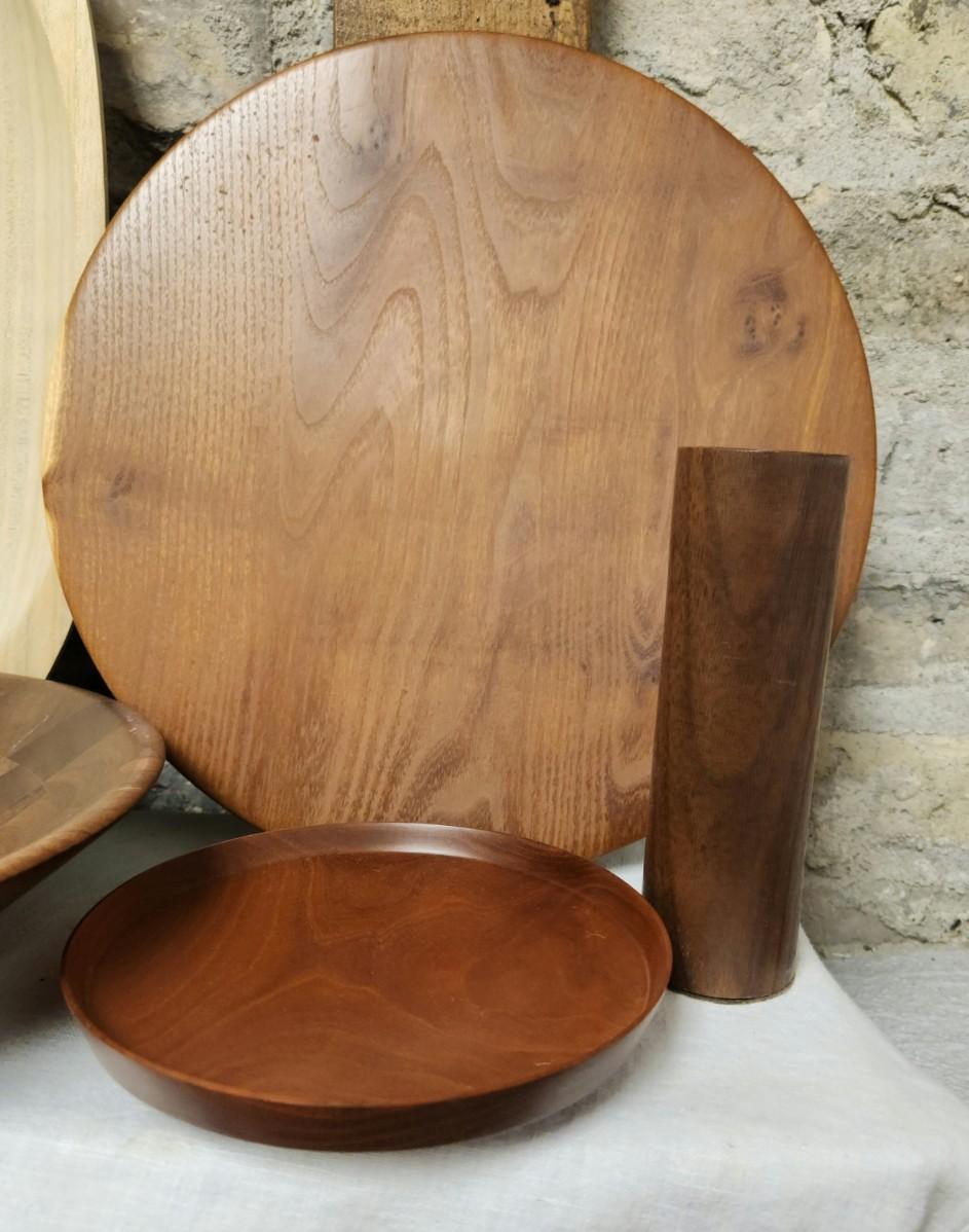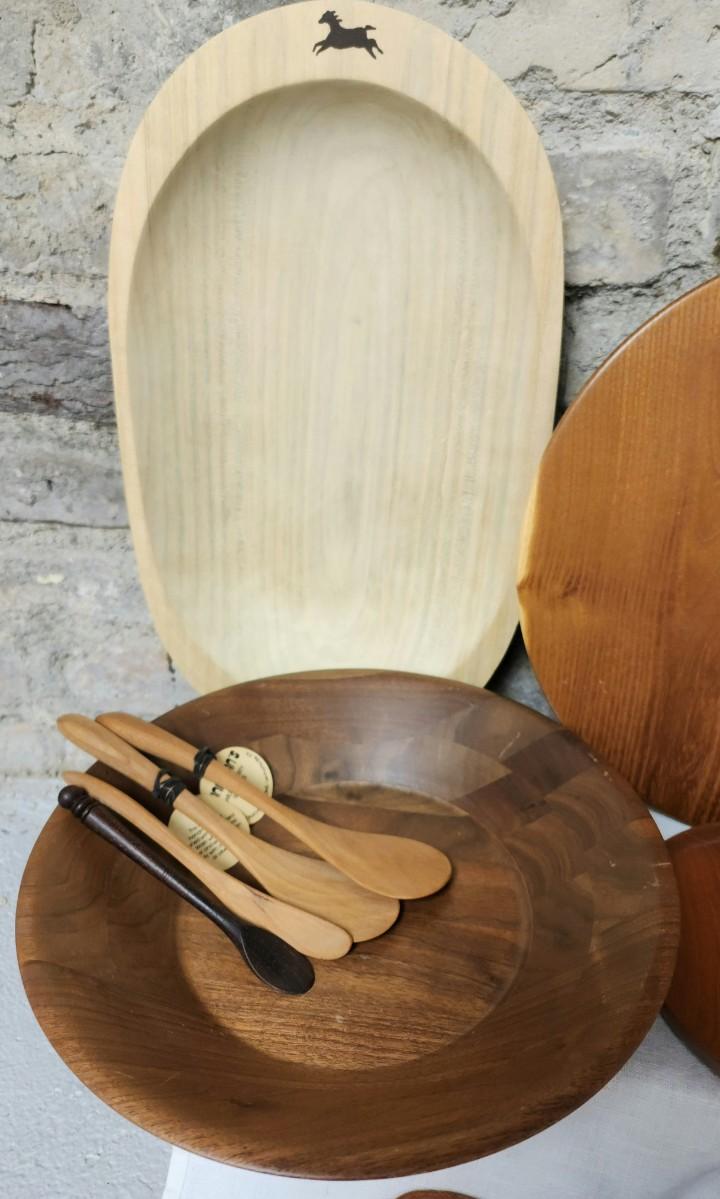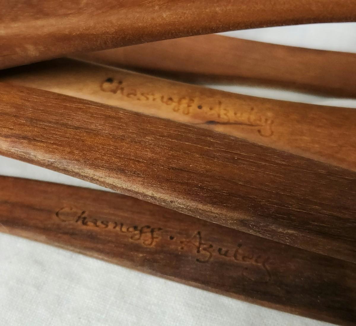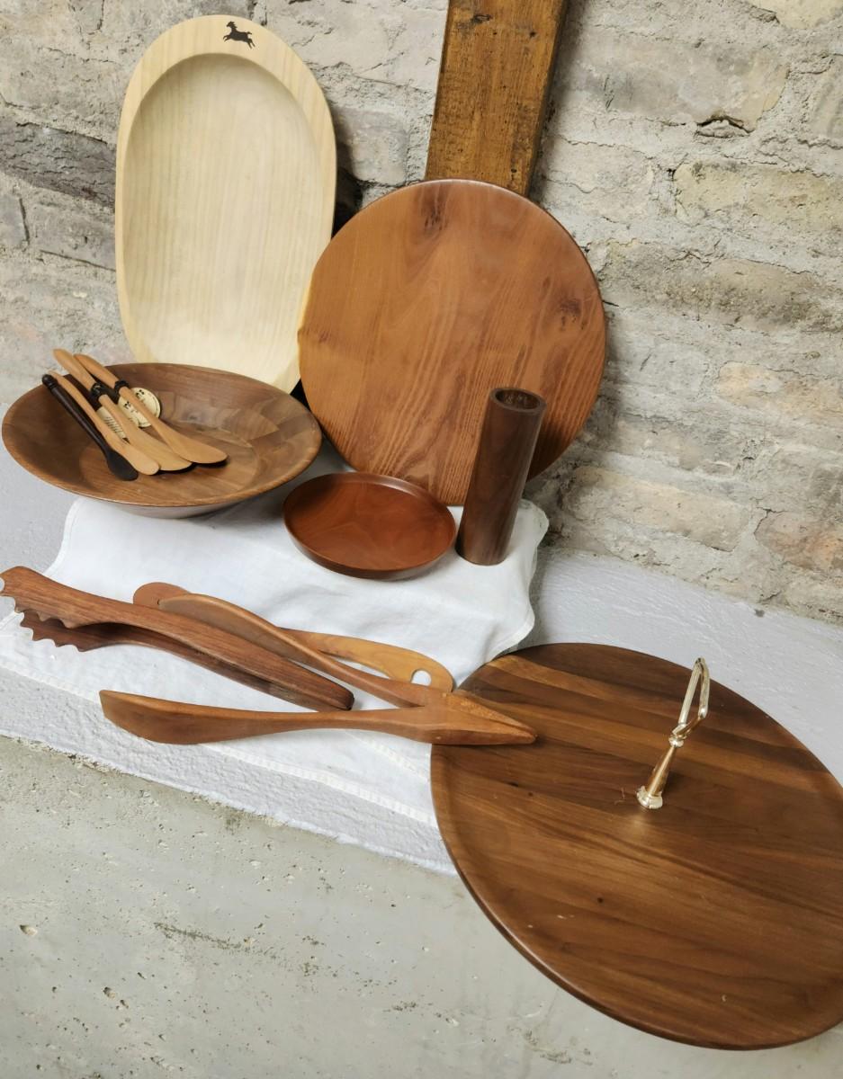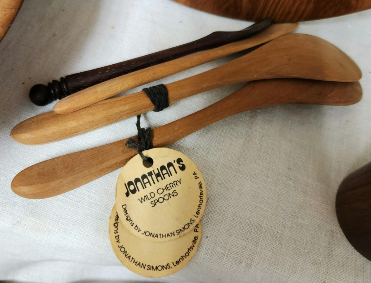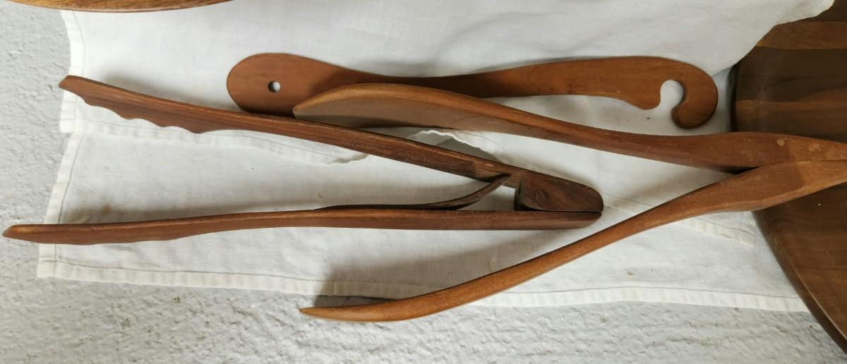 Interesting mix of wooden kitchen items. The two salad tongs are particularly unusual...notice the signature and the "springs" on each of them. 13 pieces