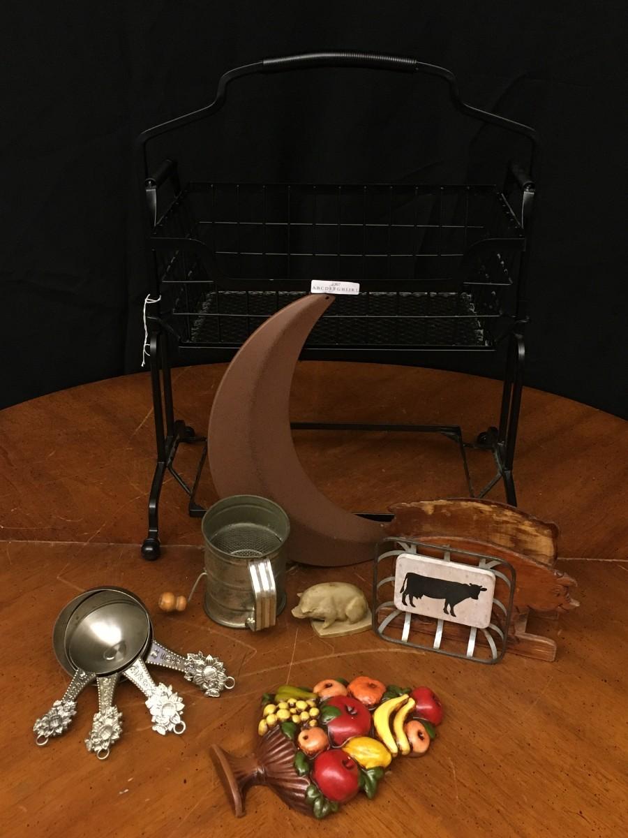 vintage kitchenware: vintage kitchenware and decorative items w/ wired basket;