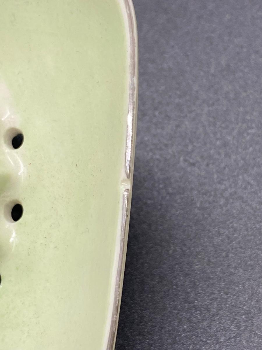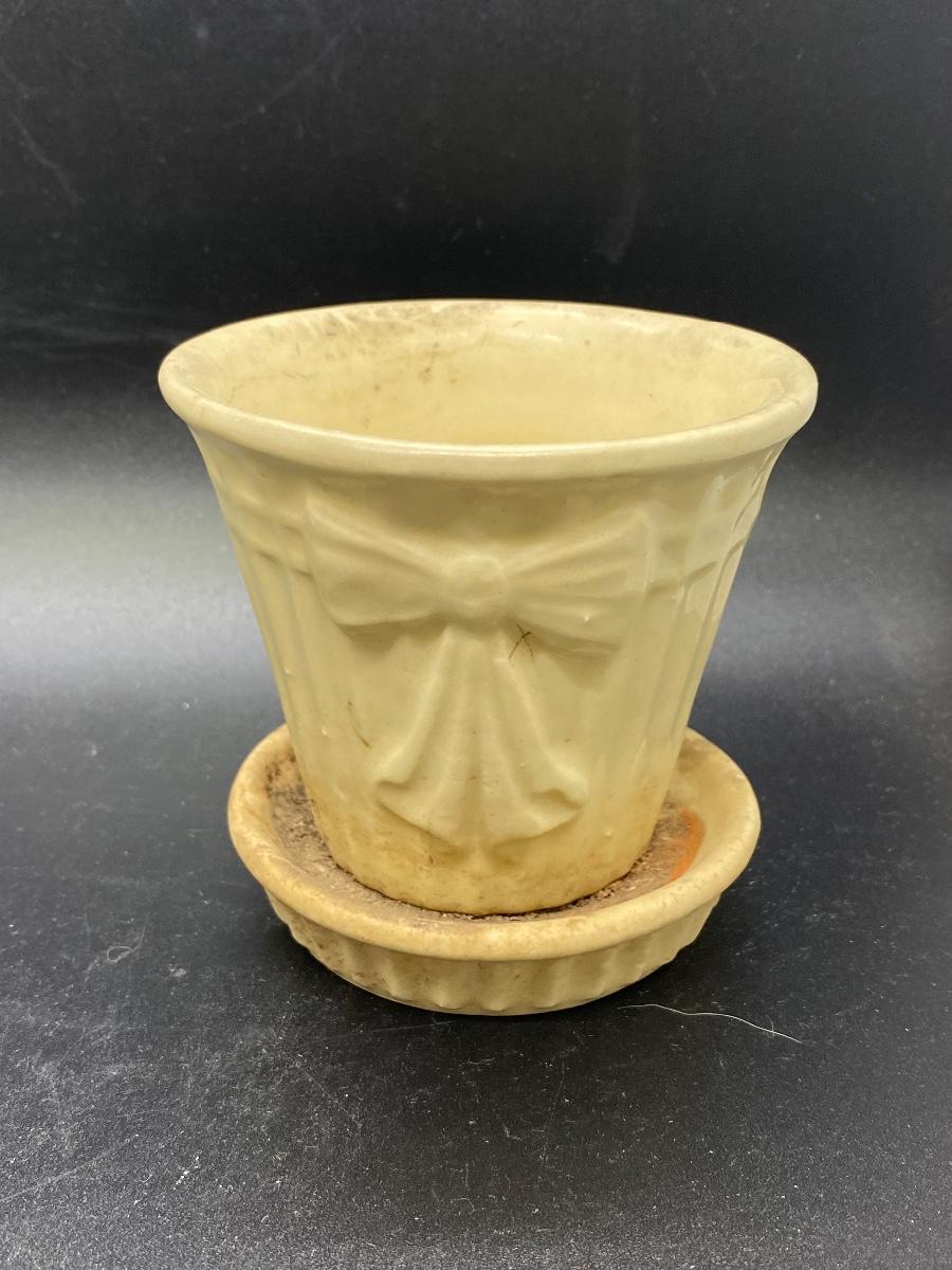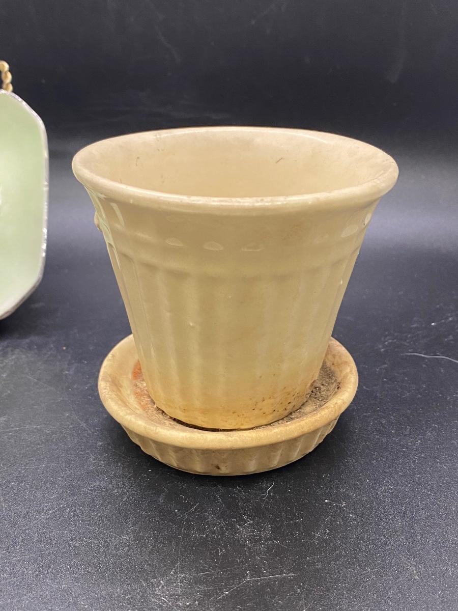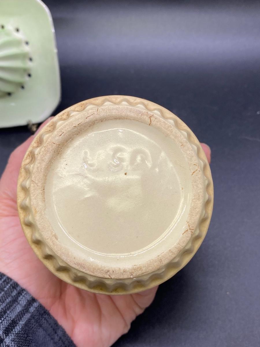 Vintage kitchenware lot. 4 piece lot includes two enameled metalware saucers, they have some scratches, dents, signs of age, a ceramic citrus fruit juicer, and a small planter pot. Planter marked USA on the bottom, needs to be cleaned. No major chips or damage to the juicer or pot.