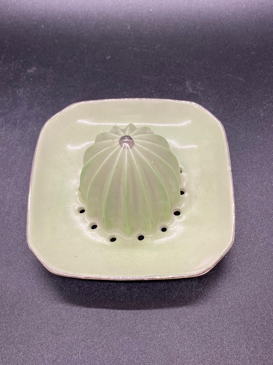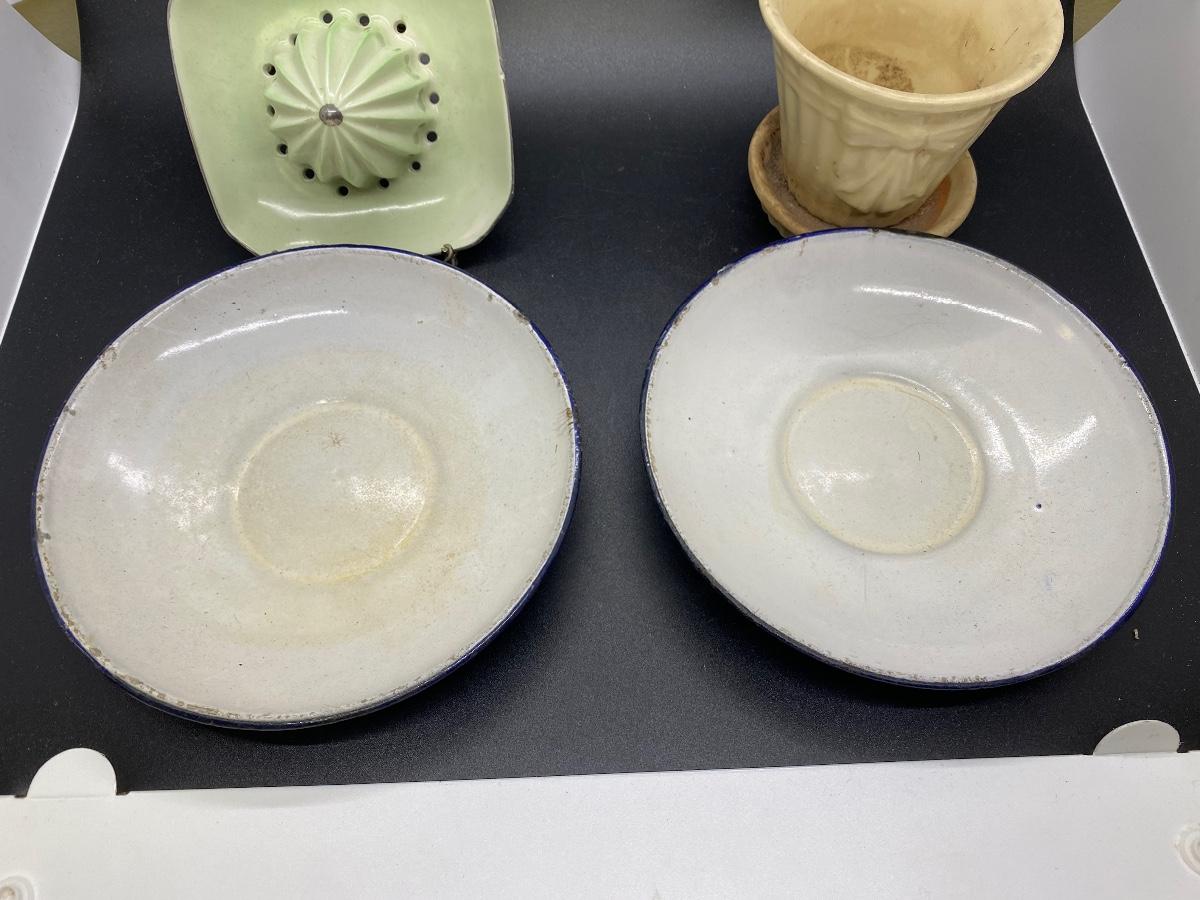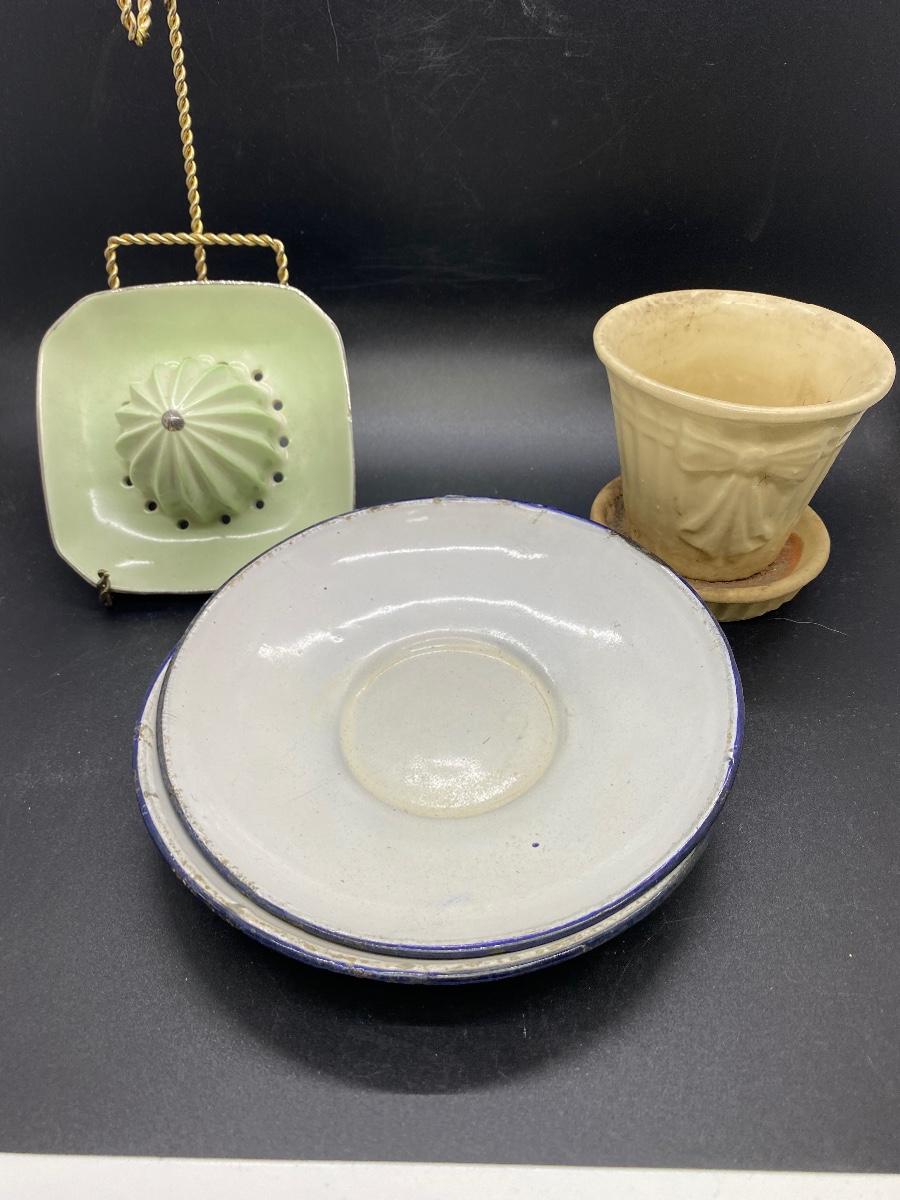 Vintage Kitchenware Enamel Saucers Pottery Planter Citrus Reamer Juicer