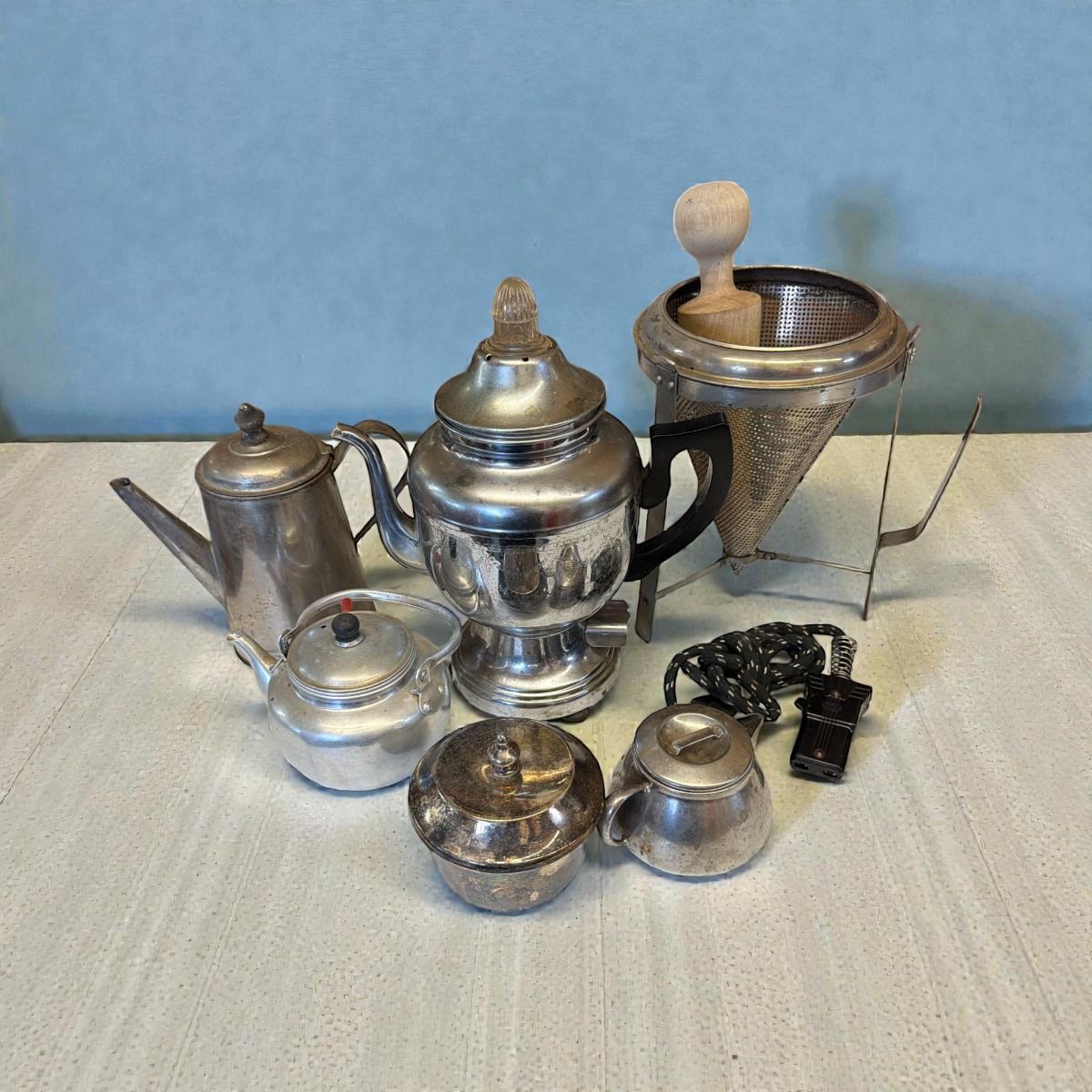 Vintage Kitchenware items, coffee pot, ricer, more little pots