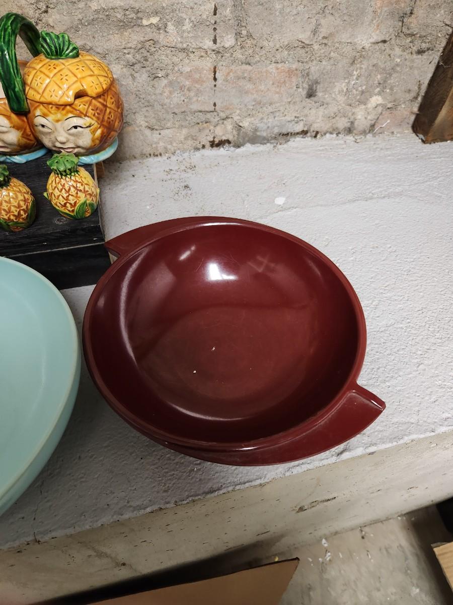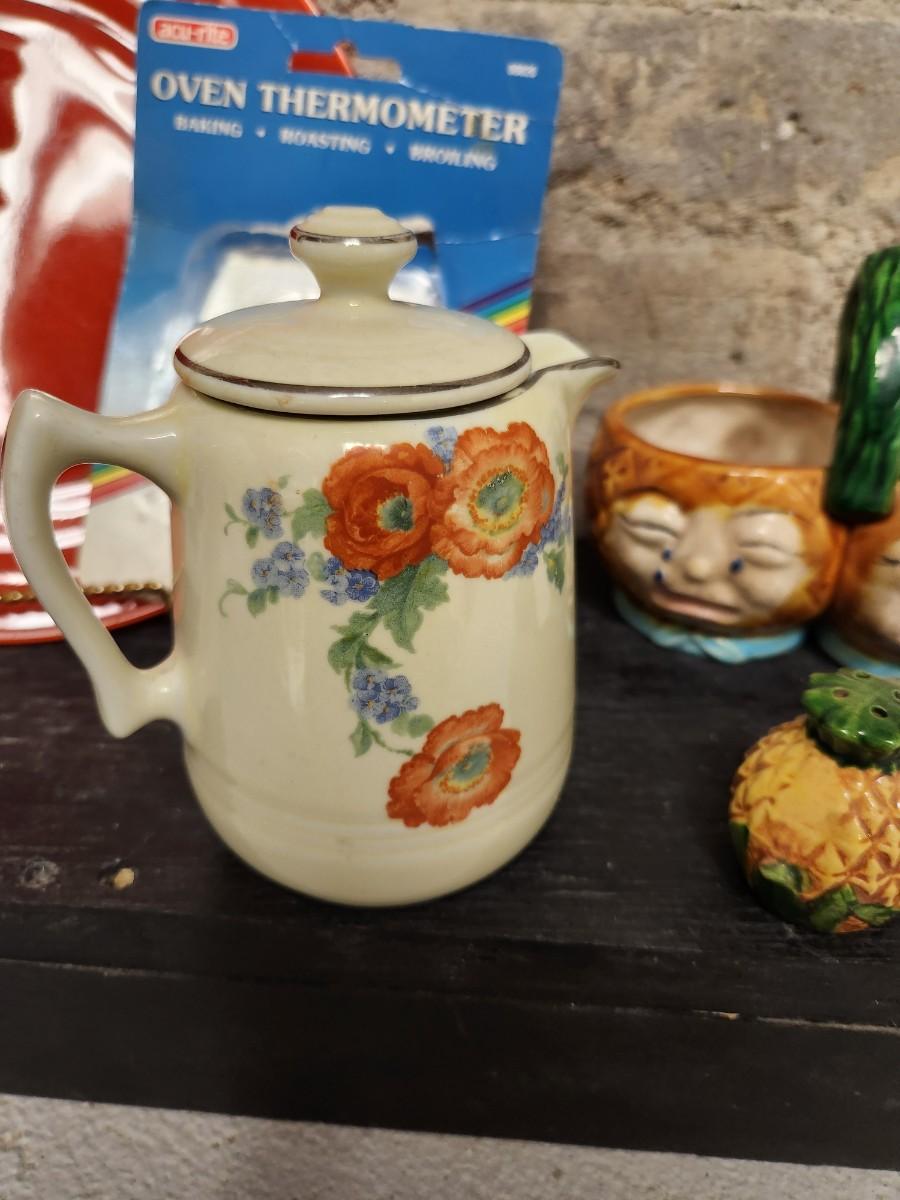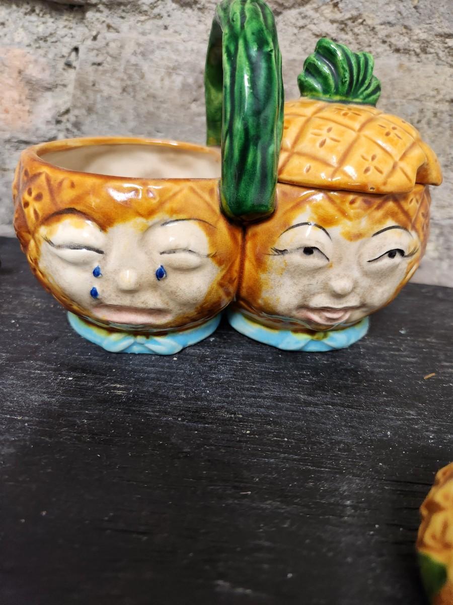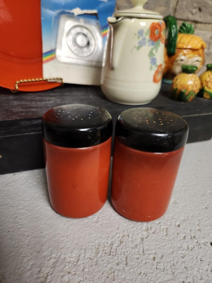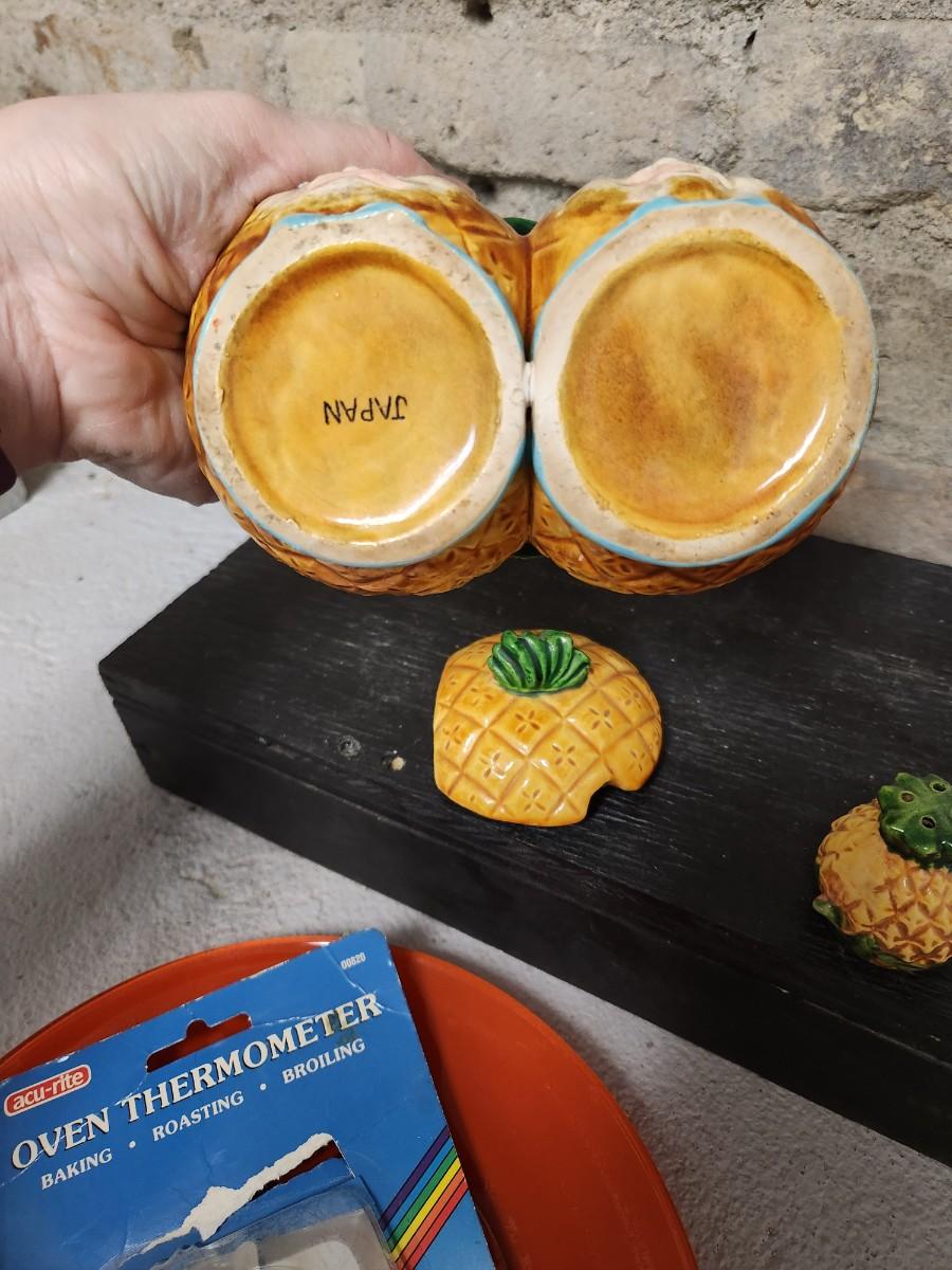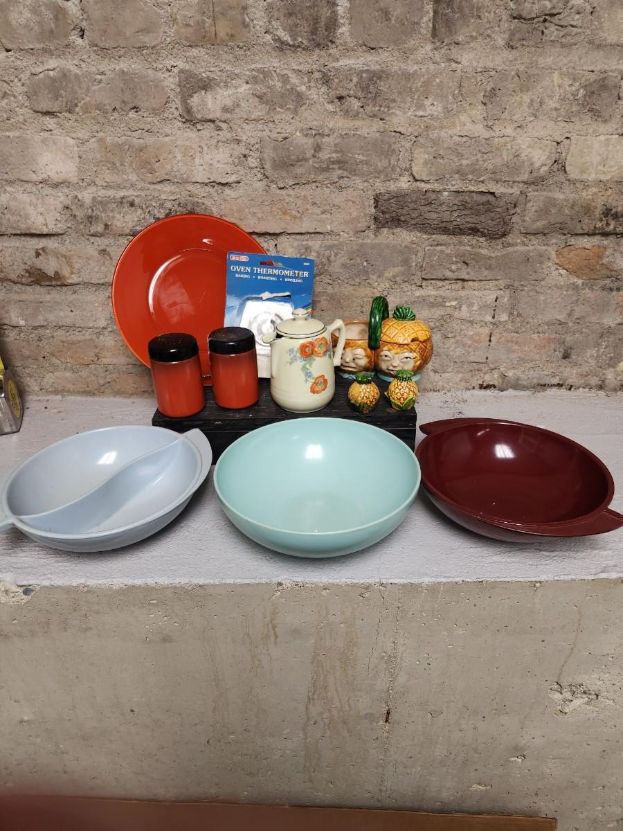 That anapomorphic pineapple condiment set cracks me up. Orange glass plate, orange aluminum salt and pepper shakers, Hall small teapot and 3 vintage Melamine bowls