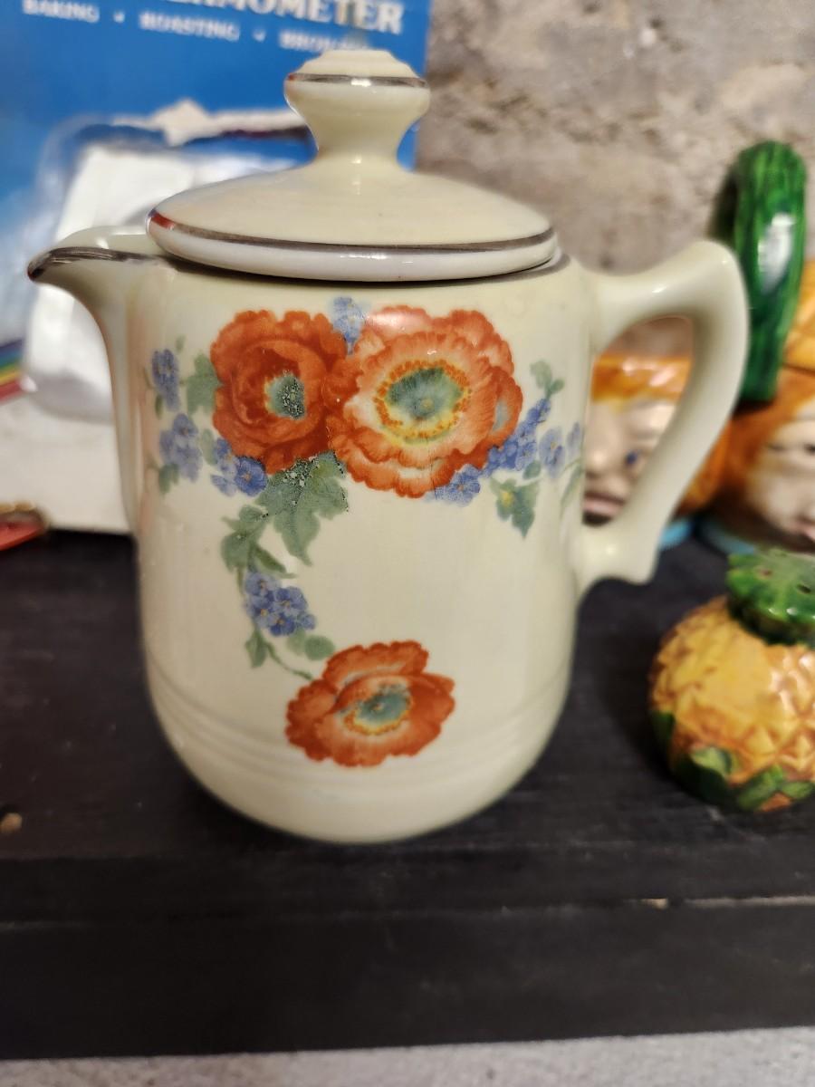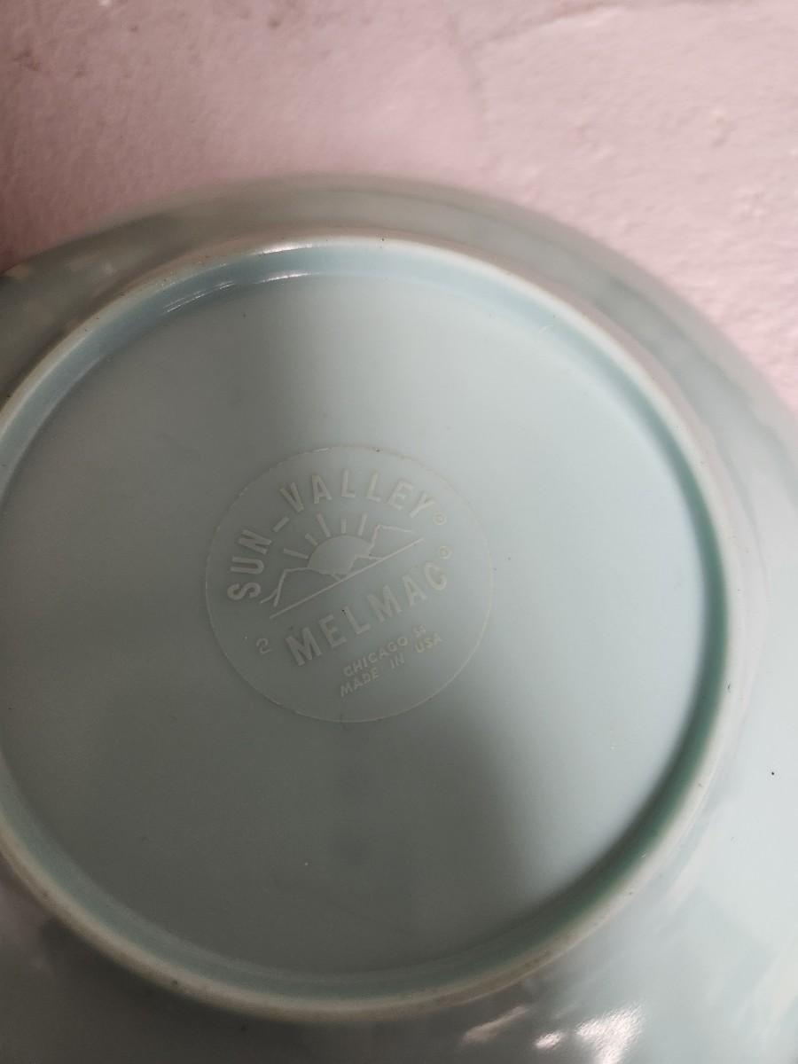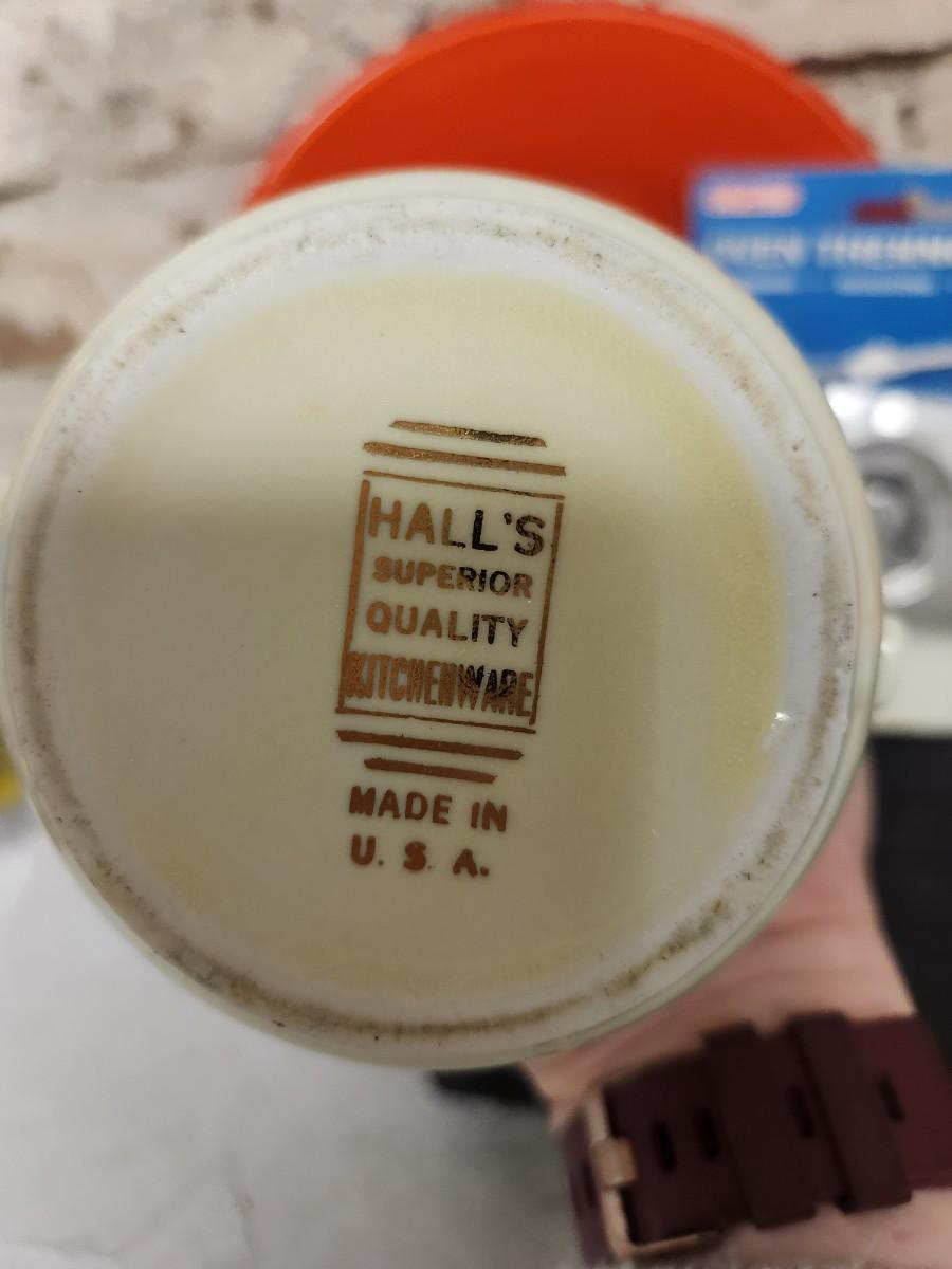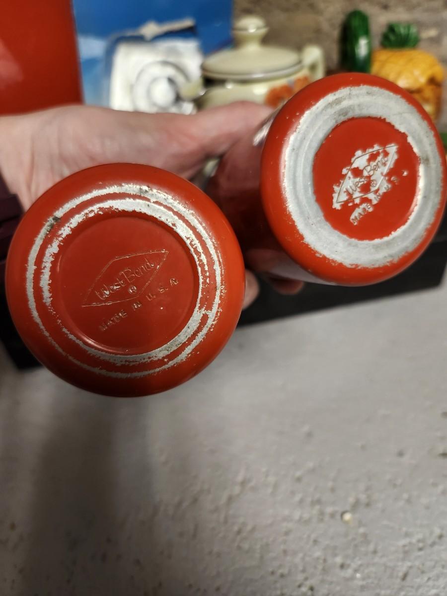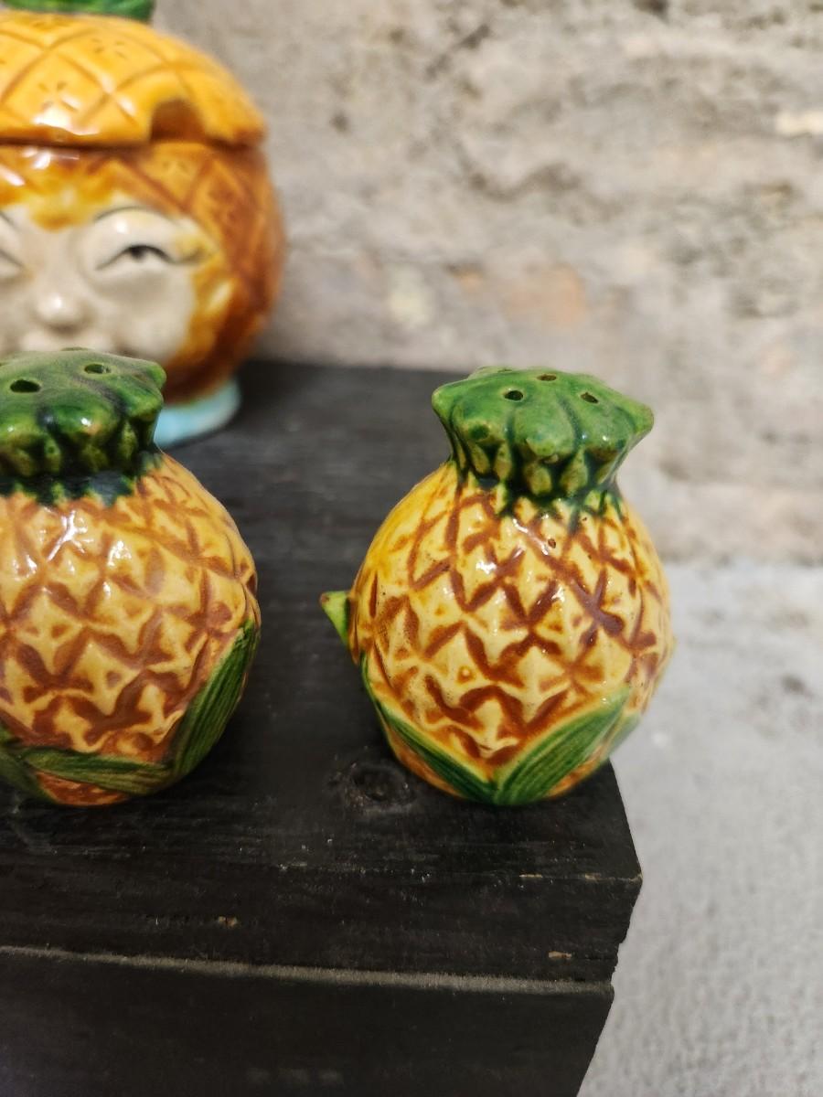 That anapomorphic pineapple condiment set cracks me up. Orange glass plate, orange aluminum salt and pepper shakers, Hall small teapot and 3 vintage Melamine bowls