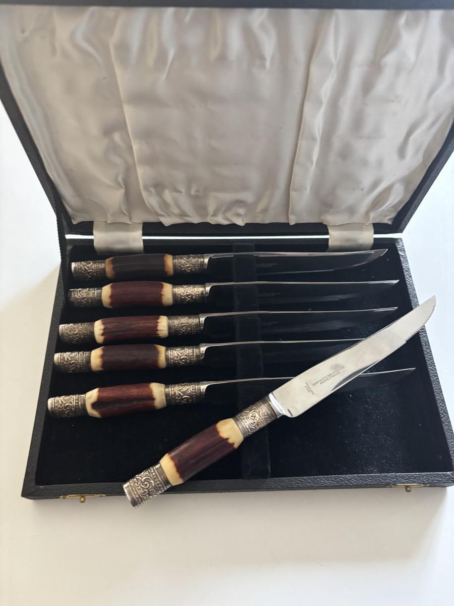 This is a vintage knife set with stag antler handles, made in Sheffield, England.