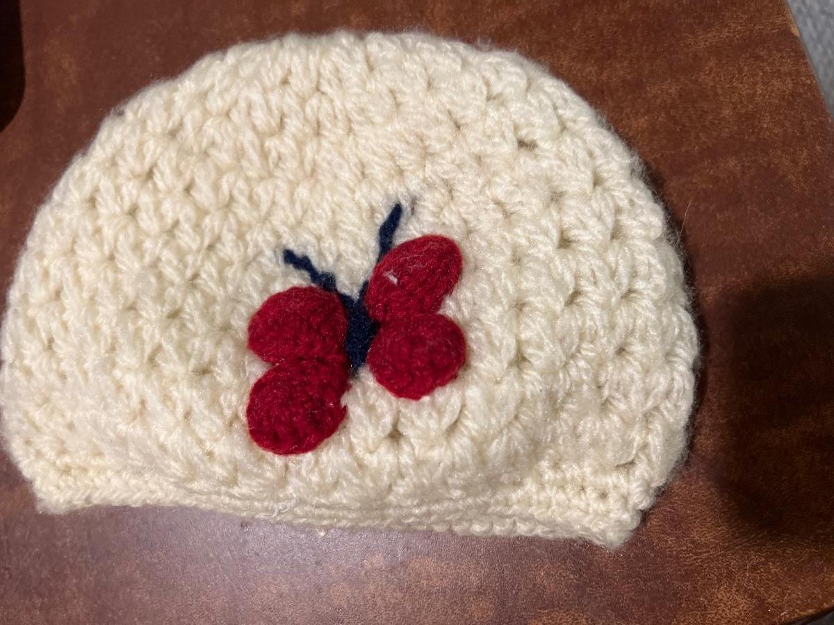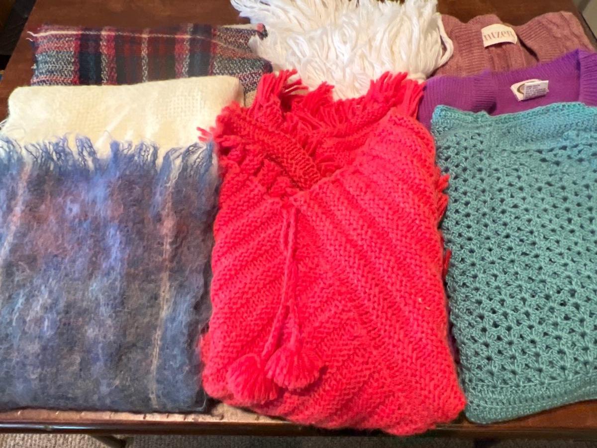 3 scarves, 1 poncho,1 shawl, 3 sweaters 1 knitted cap w/ butterfly