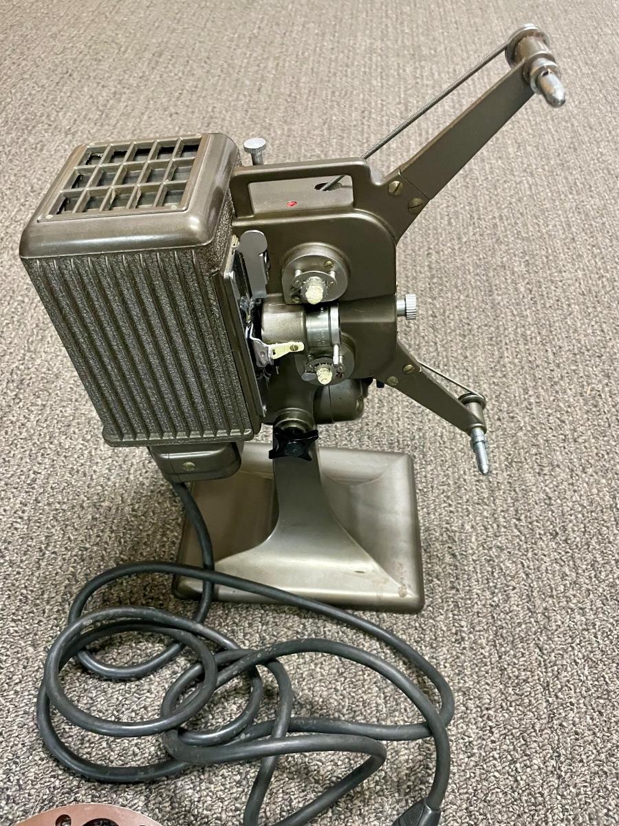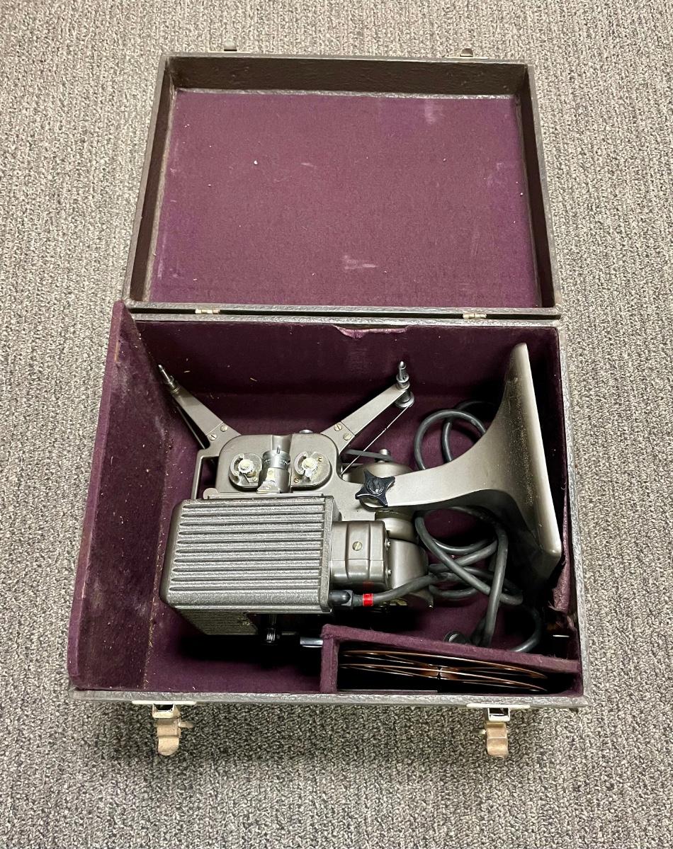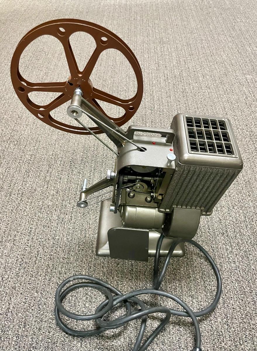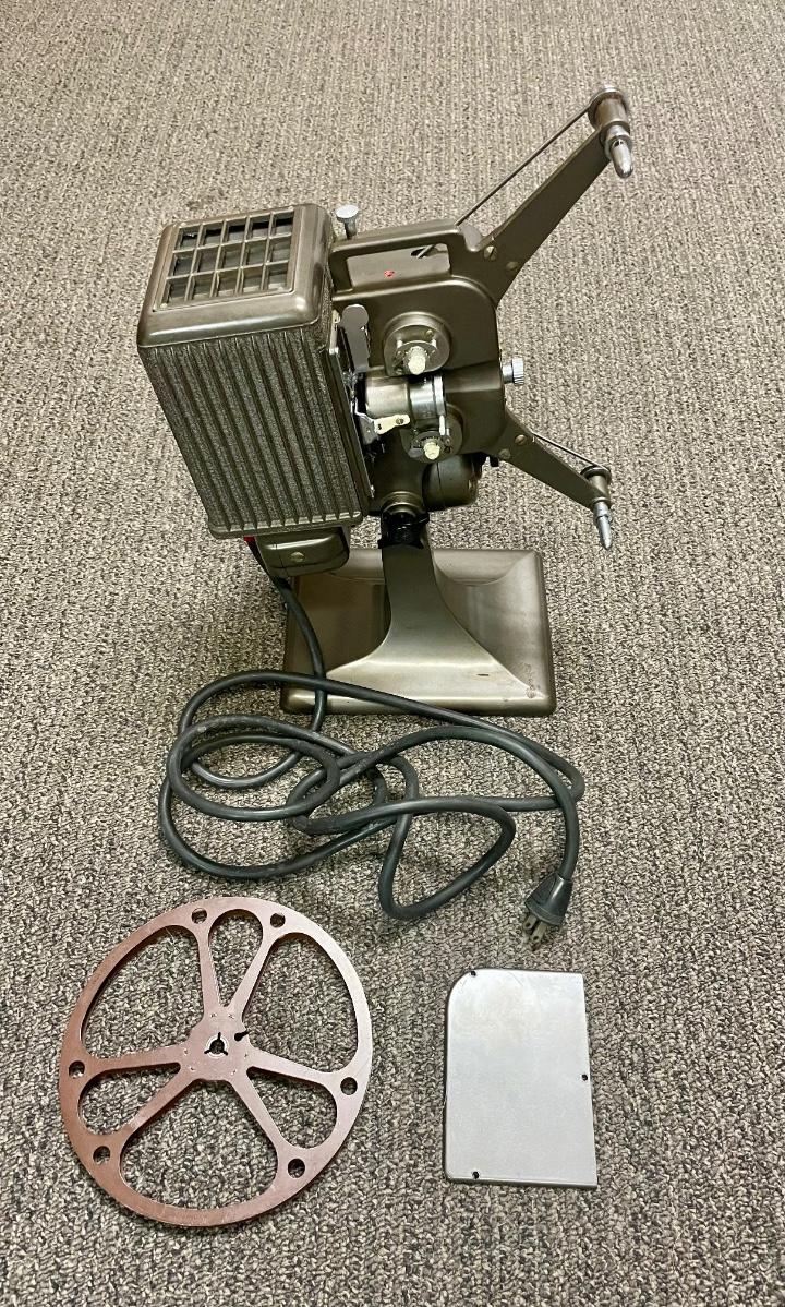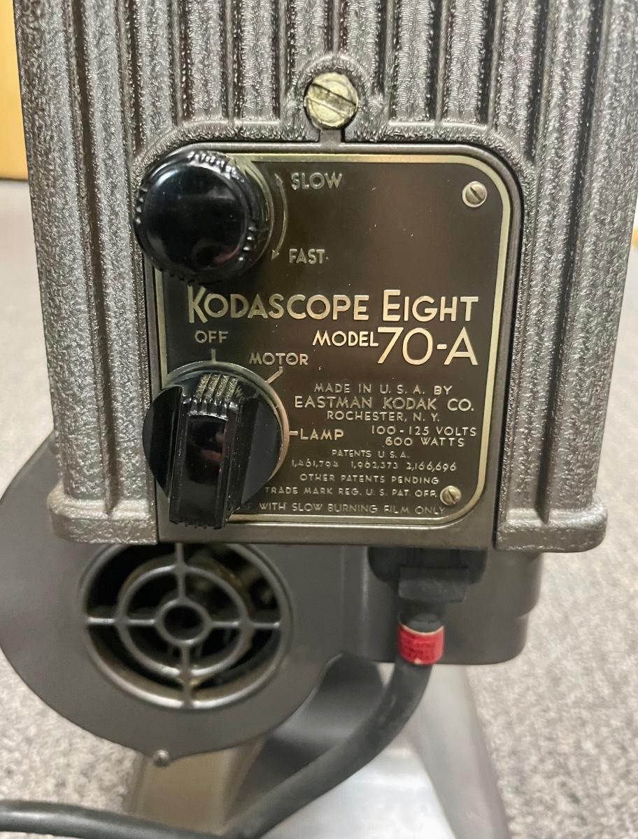 Kodascope Eight Model 70-A, likely from the late 1930's. Powers up when plugged in, but unable to perform a thorough test. Access cover was removed, screws are missing. Has 1 reel. May only be good for display or parts.