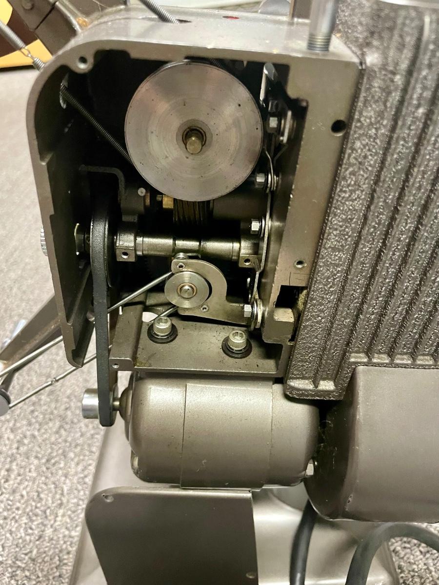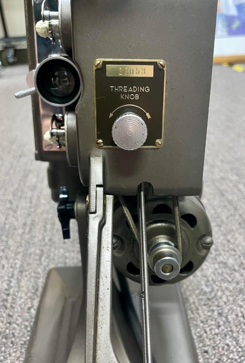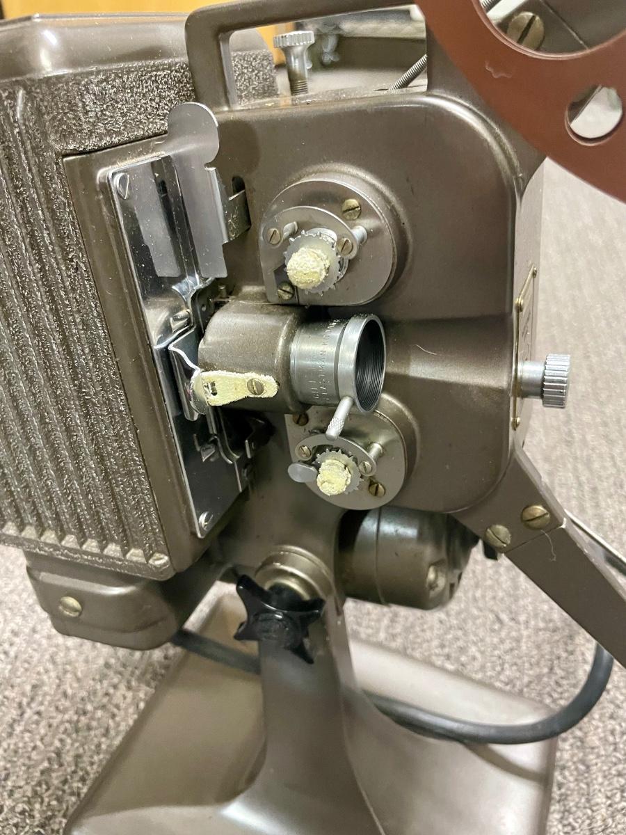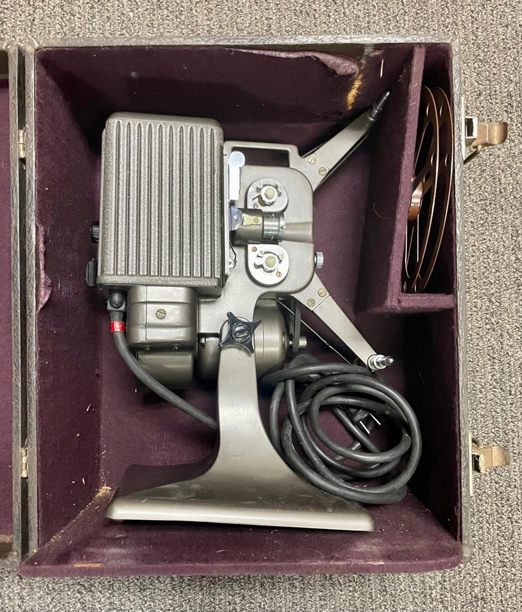 Kodascope Eight Model 70-A, likely from the late 1930's. Powers up when plugged in, but unable to perform a thorough test. Access cover was removed, screws are missing. Has 1 reel. May only be good for display or parts.