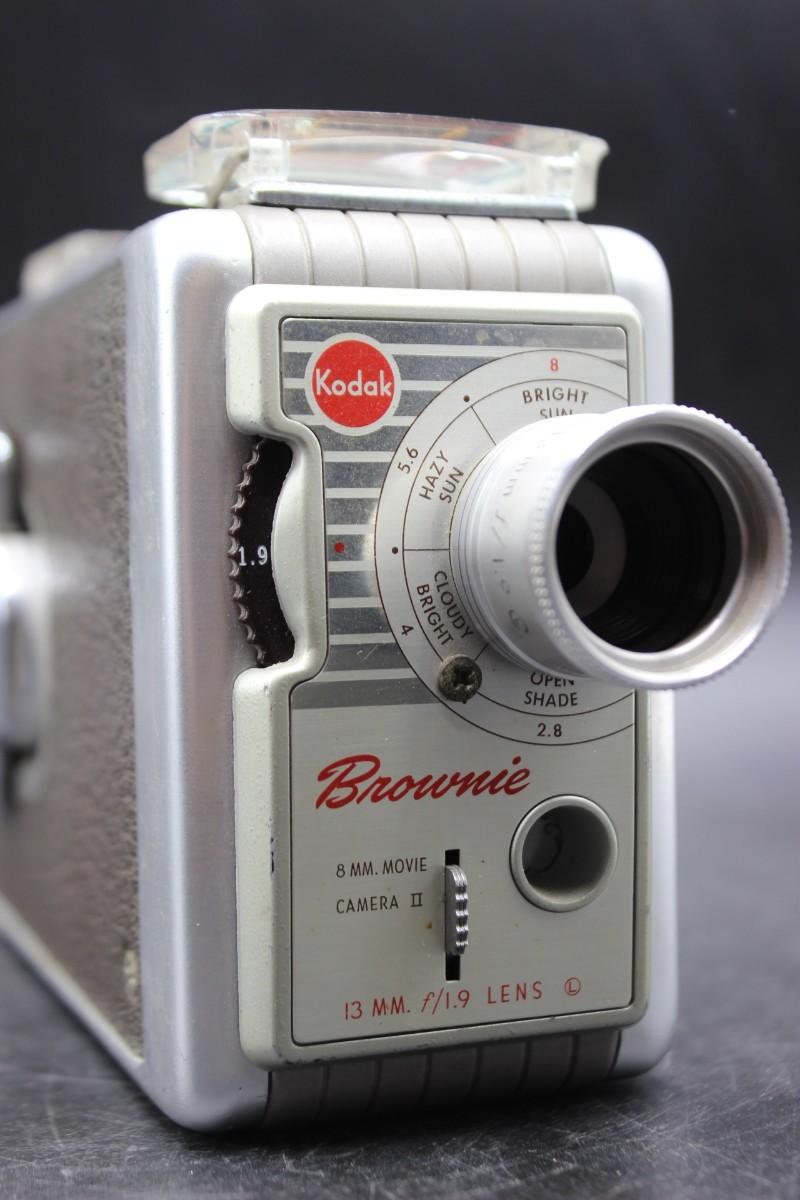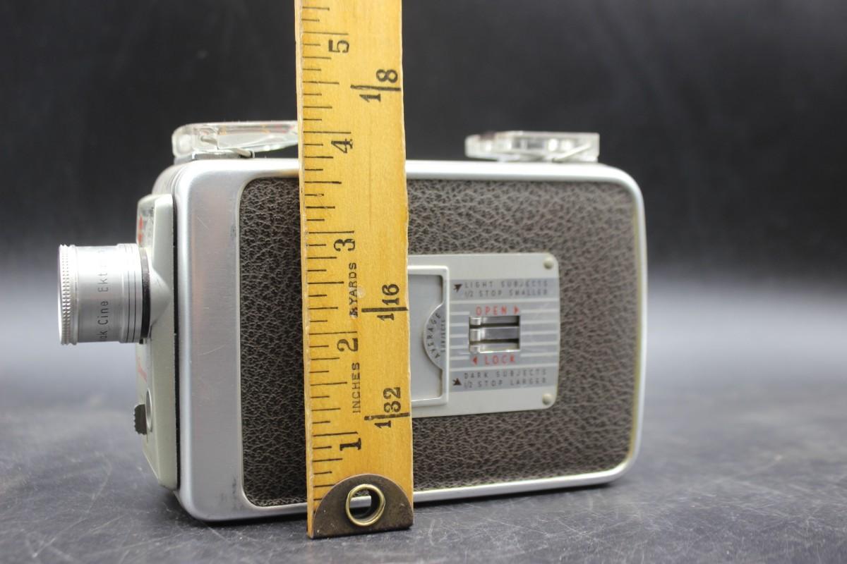 Vintage Kodak Brownie 8 mm Movie Camera II, there is no significant damage to the body of the camera and is in good vintage condition. Has not been tested, check pictures for more details and for sizing