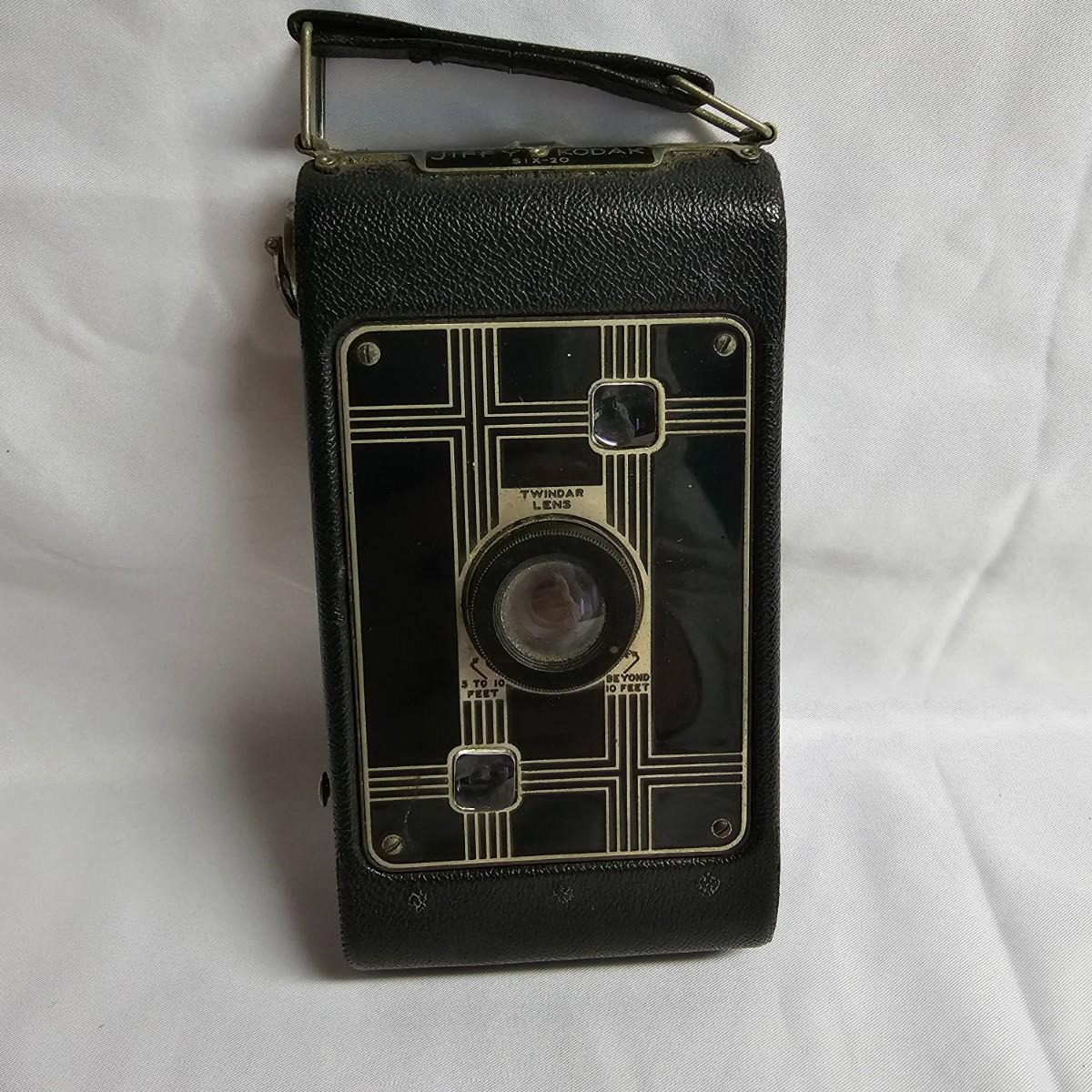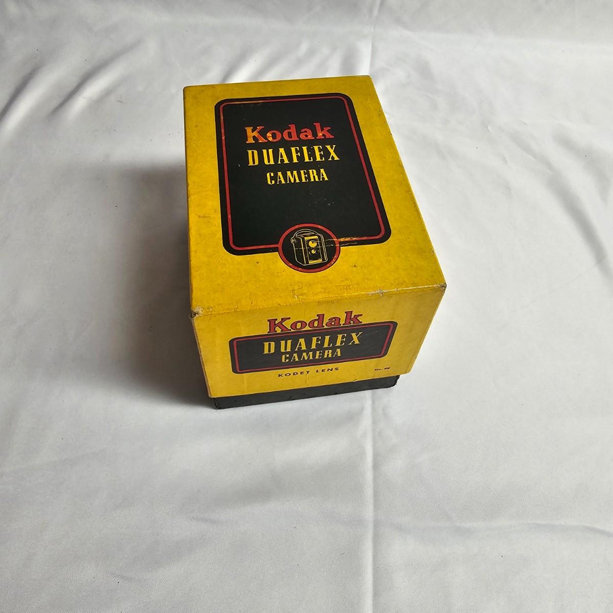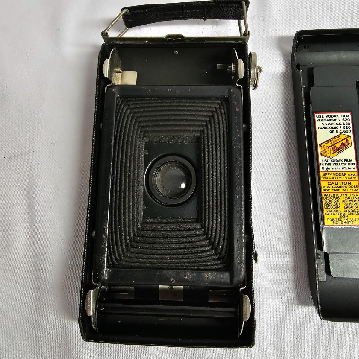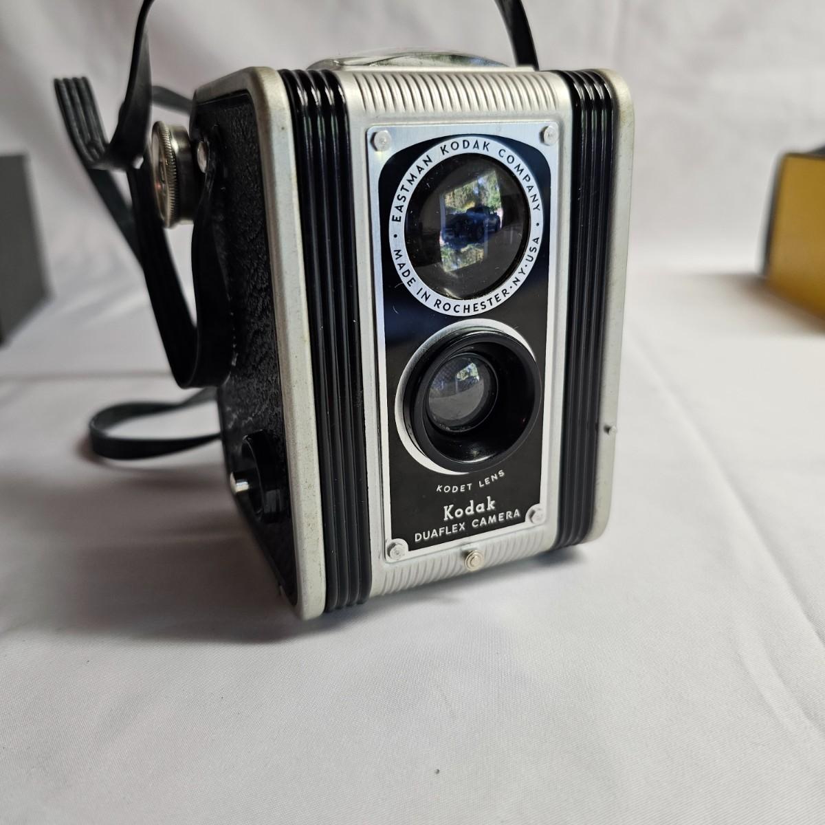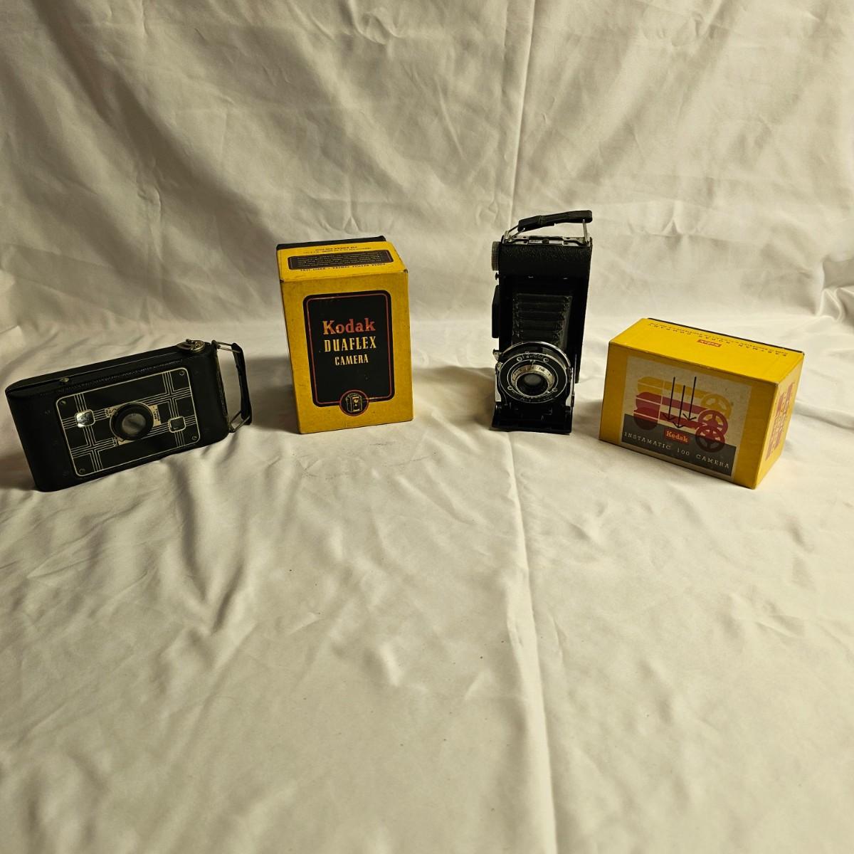 Four vintage Kodak cameras. One Kodak Senior Six-20 fold up with an Anastigmat f:6.3 105mm lens. Uses 620 film, has crack on top viewfinder. Also one Jiffy Kodak Six-20 with Twindar lens, also uses 620 film. One Kodak Dualflex camera with strap in original box, uses 620 film. Lastly a Kodak Instamatic 100 camera, uses Kodak film cartridge. See photos for details. Shipping available.