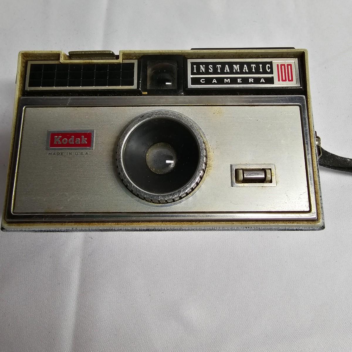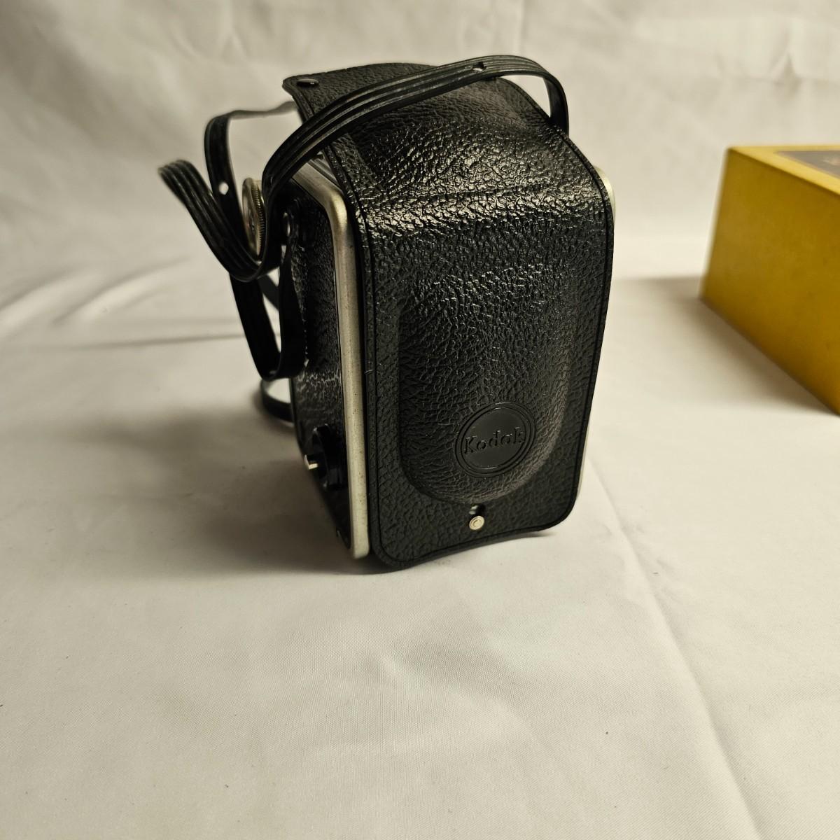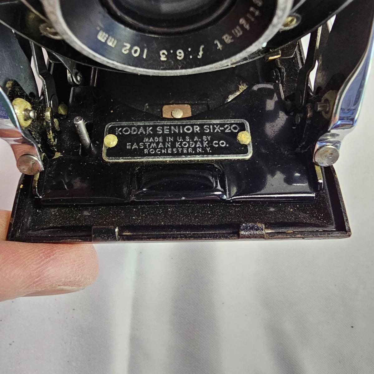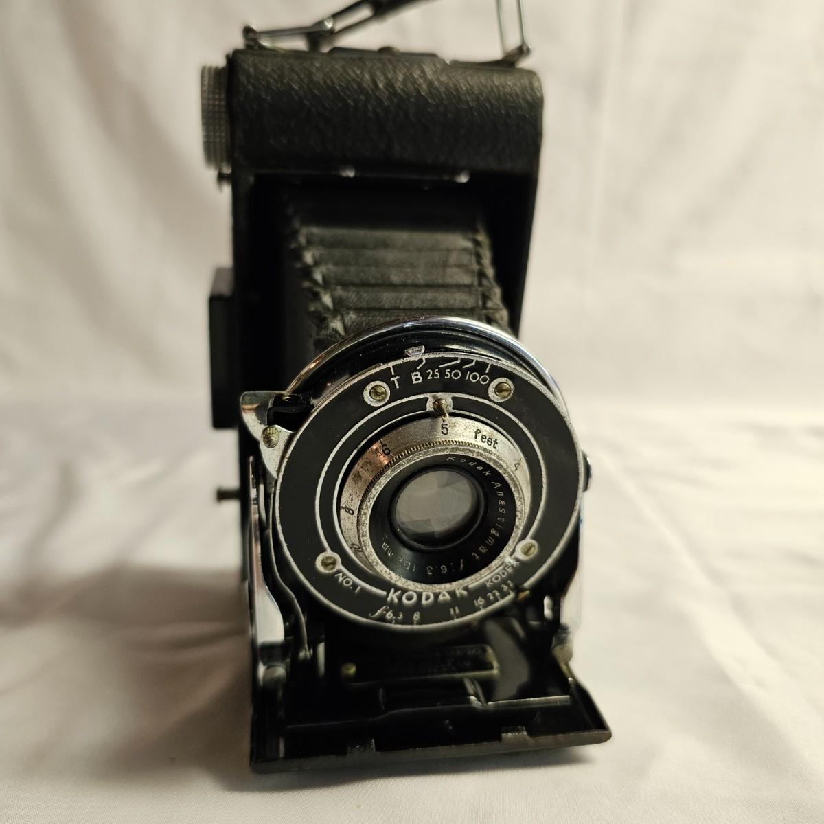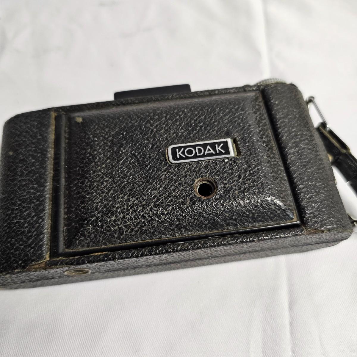 Four vintage Kodak cameras. One Kodak Senior Six-20 fold up with an Anastigmat f:6.3 105mm lens. Uses 620 film, has crack on top viewfinder. Also one Jiffy Kodak Six-20 with Twindar lens, also uses 620 film. One Kodak Dualflex camera with strap in original box, uses 620 film. Lastly a Kodak Instamatic 100 camera, uses Kodak film cartridge. See photos for details. Shipping available.