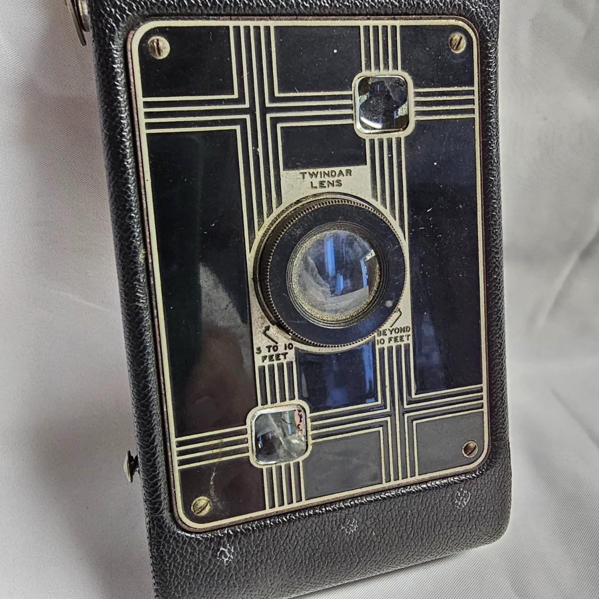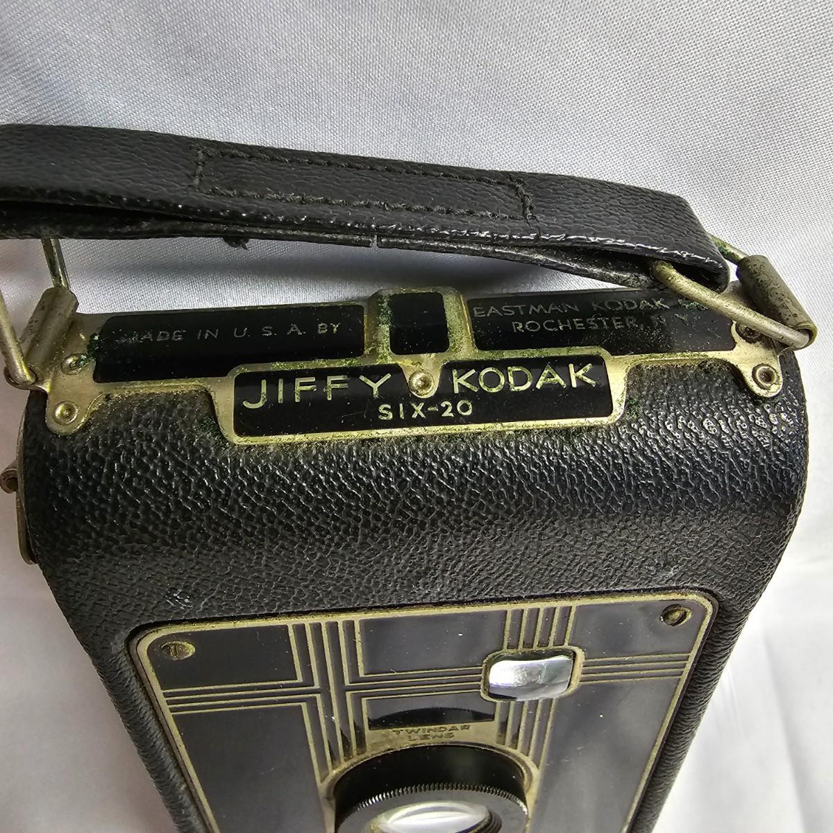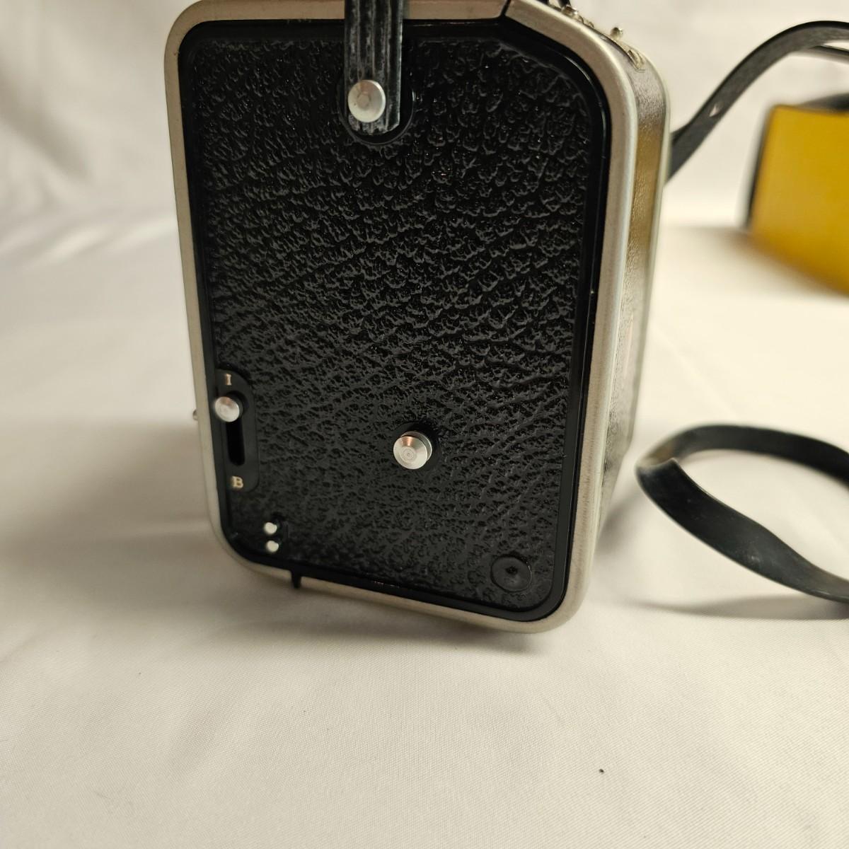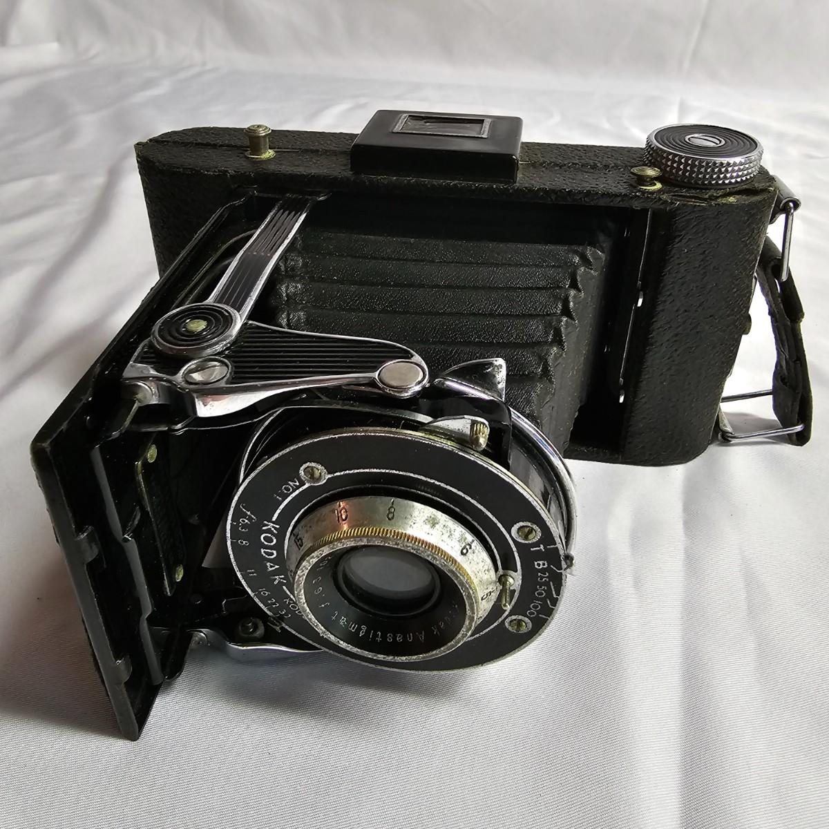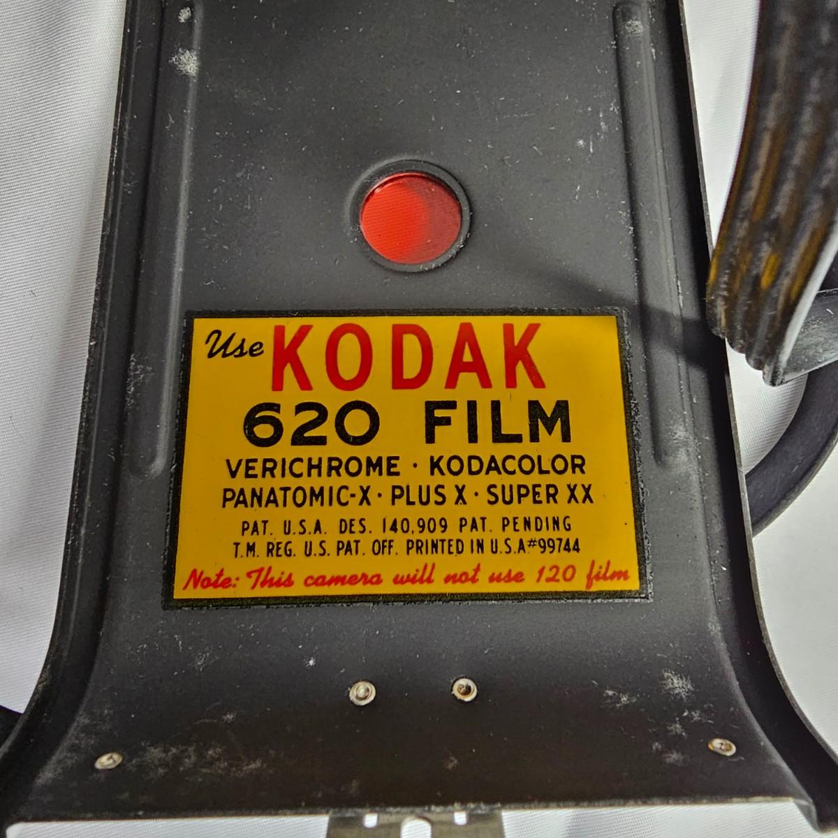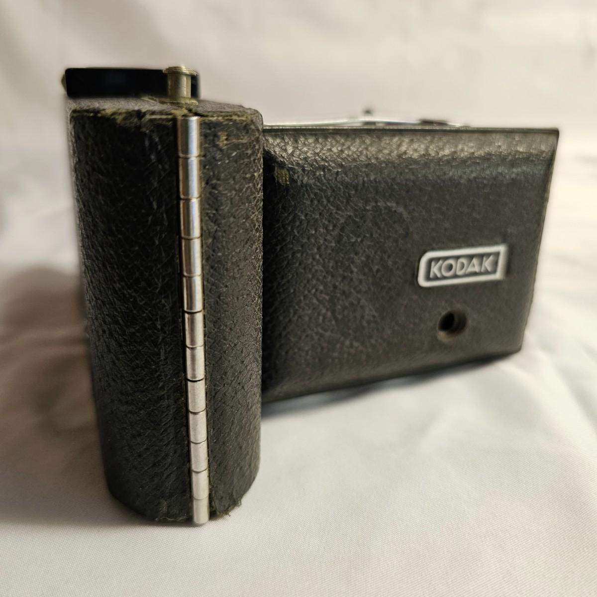 Four vintage Kodak cameras. One Kodak Senior Six-20 fold up with an Anastigmat f:6.3 105mm lens. Uses 620 film, has crack on top viewfinder. Also one Jiffy Kodak Six-20 with Twindar lens, also uses 620 film. One Kodak Dualflex camera with strap in original box, uses 620 film. Lastly a Kodak Instamatic 100 camera, uses Kodak film cartridge. See photos for details. Shipping available.