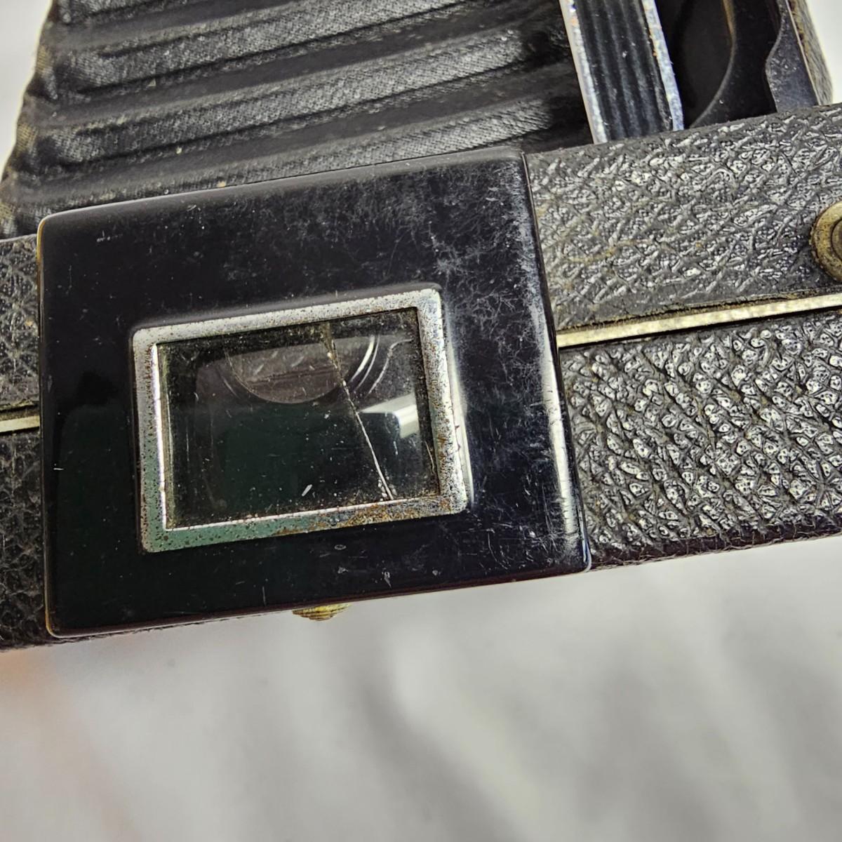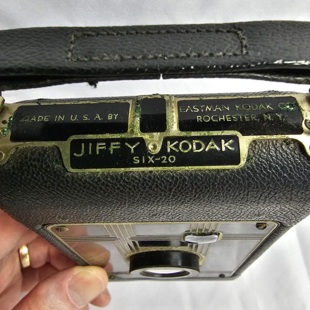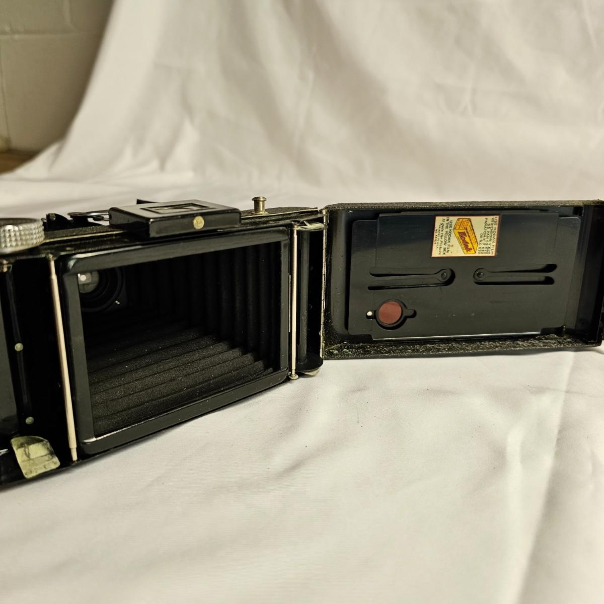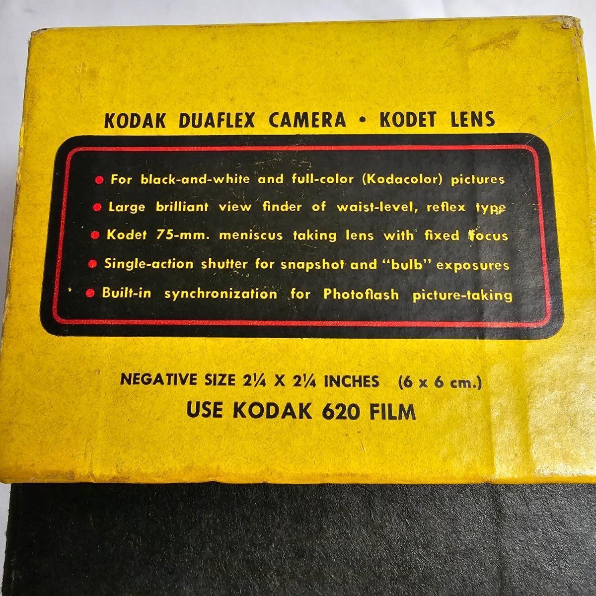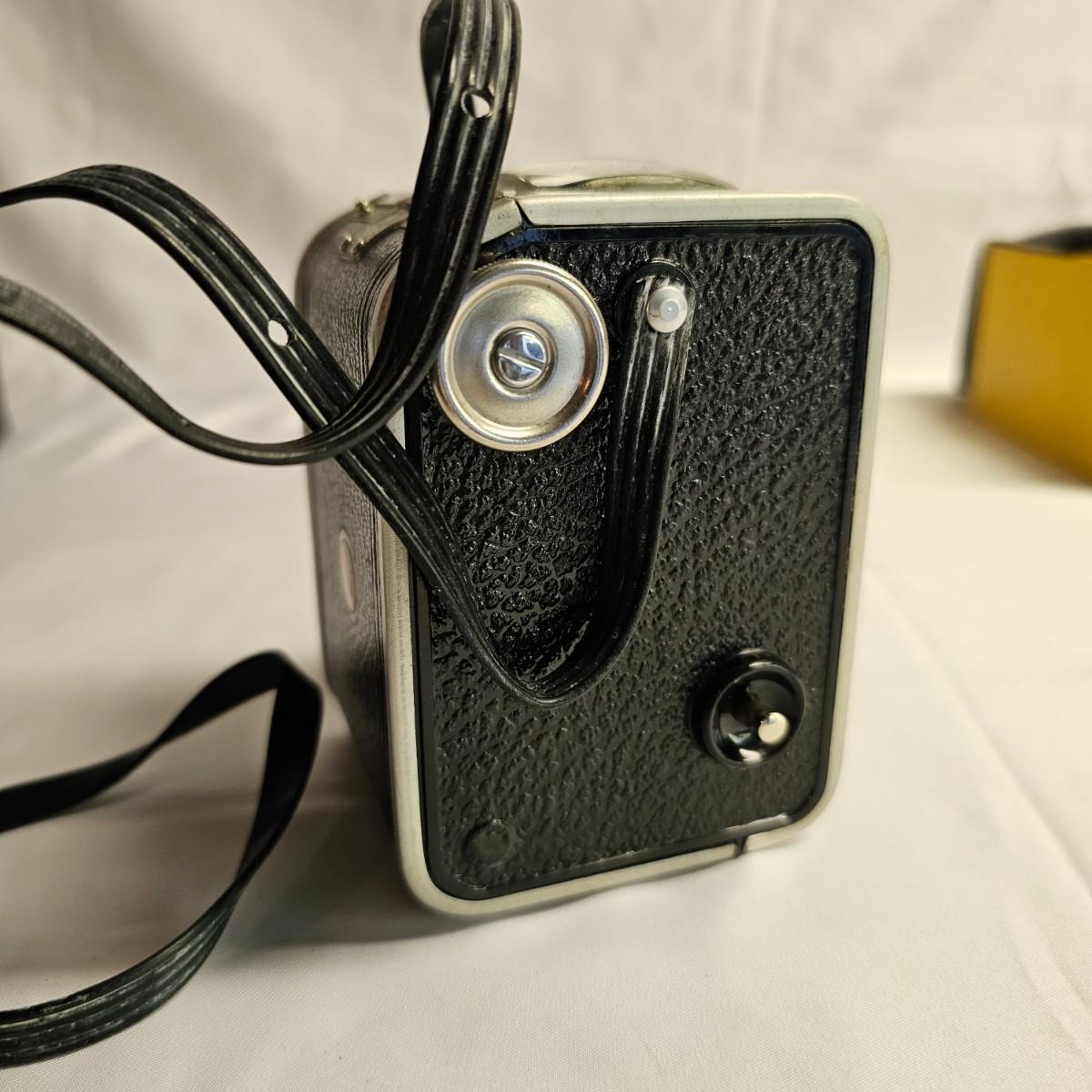 Four vintage Kodak cameras. One Kodak Senior Six-20 fold up with an Anastigmat f:6.3 105mm lens. Uses 620 film, has crack on top viewfinder. Also one Jiffy Kodak Six-20 with Twindar lens, also uses 620 film. One Kodak Dualflex camera with strap in original box, uses 620 film. Lastly a Kodak Instamatic 100 camera, uses Kodak film cartridge. See photos for details. Shipping available.