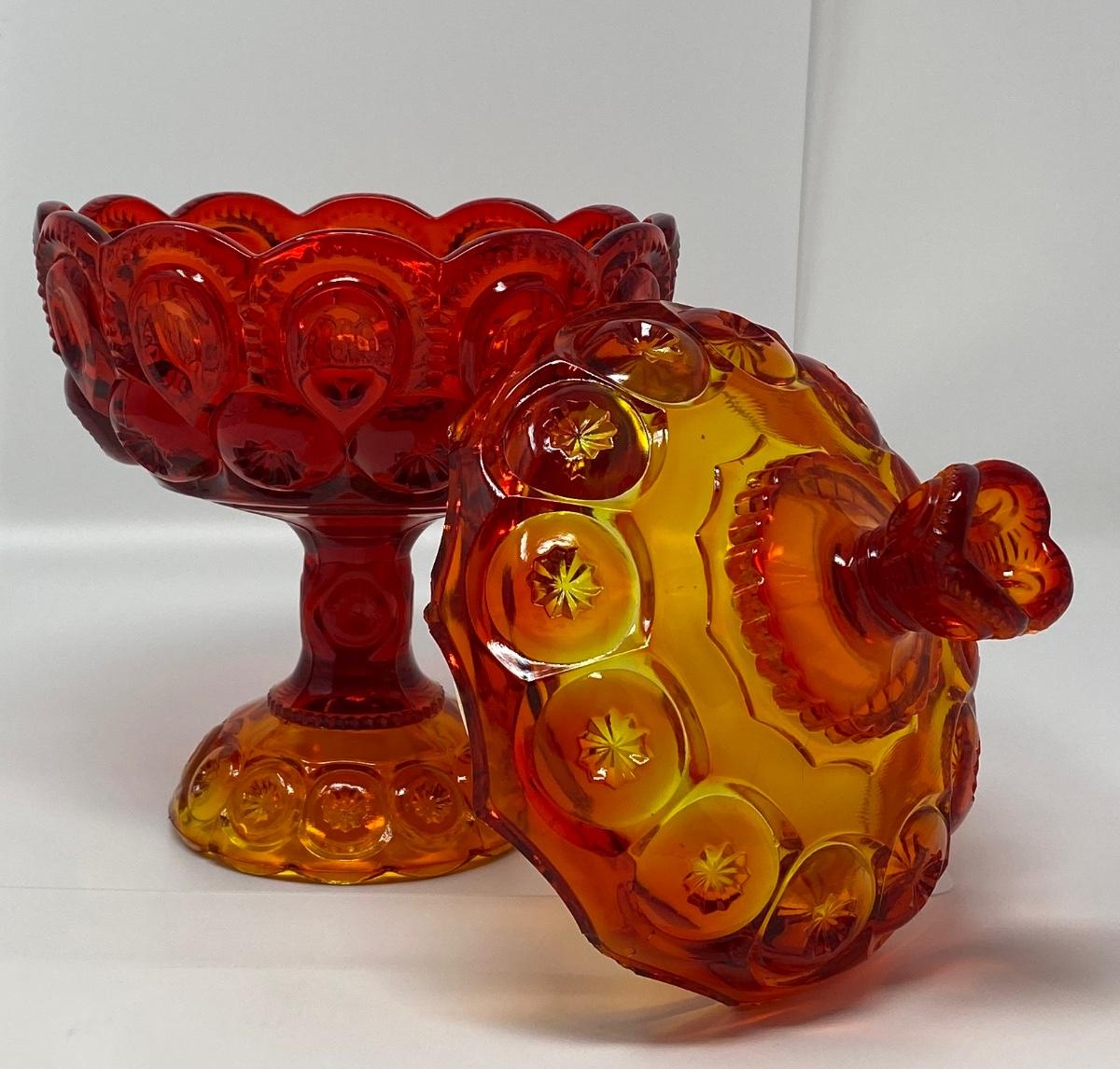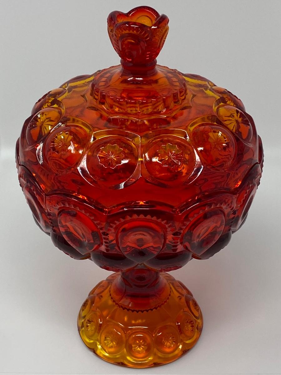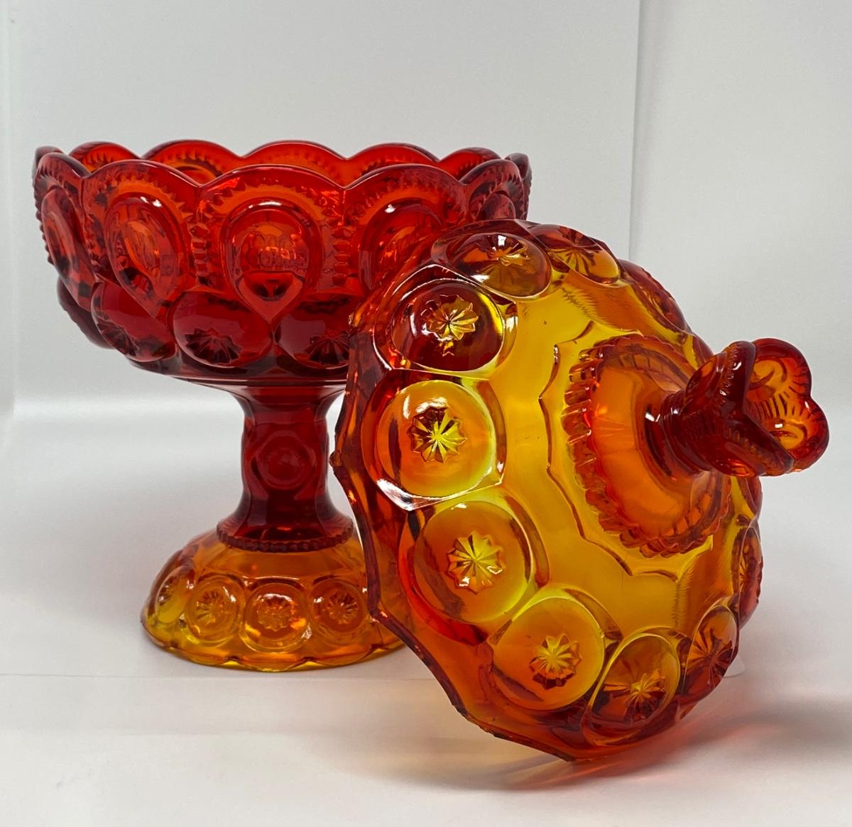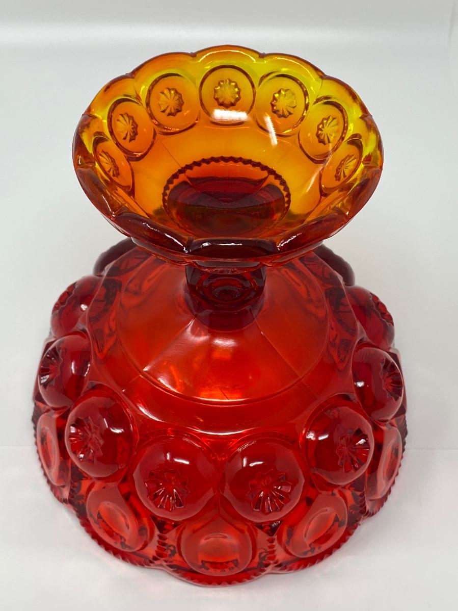 Vintage L. E. Smith Amberina Glass Moon and Stars Amberina Glass Dish with Lid in Red, Orange, and Yellow Flame Color LE Smith Covered Compote. 6" W x 6" L x 9.5" T