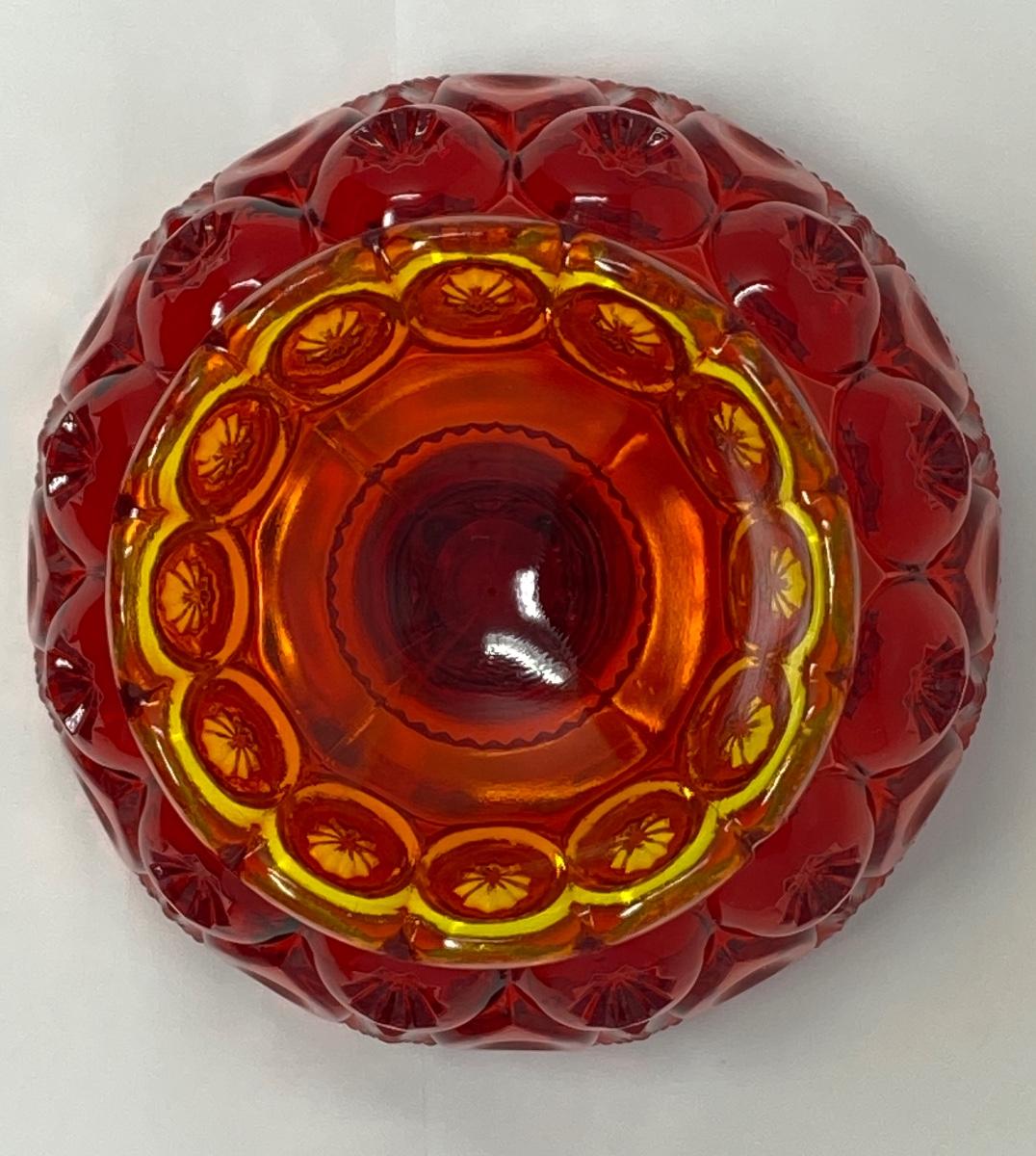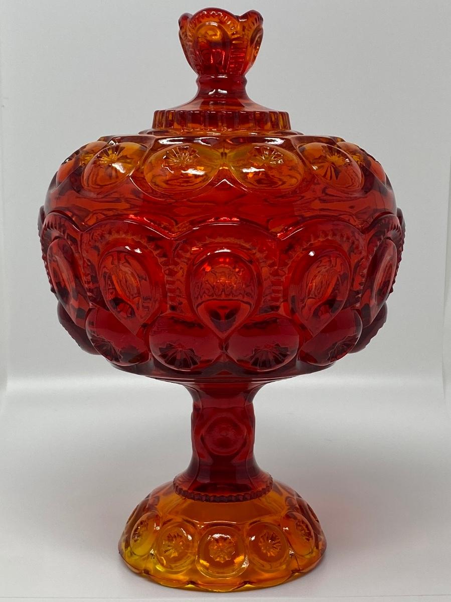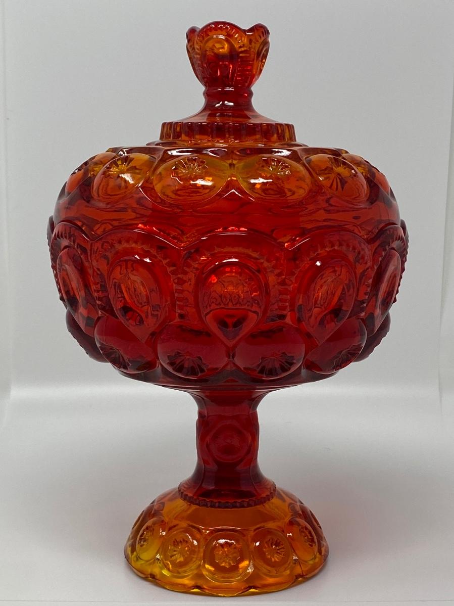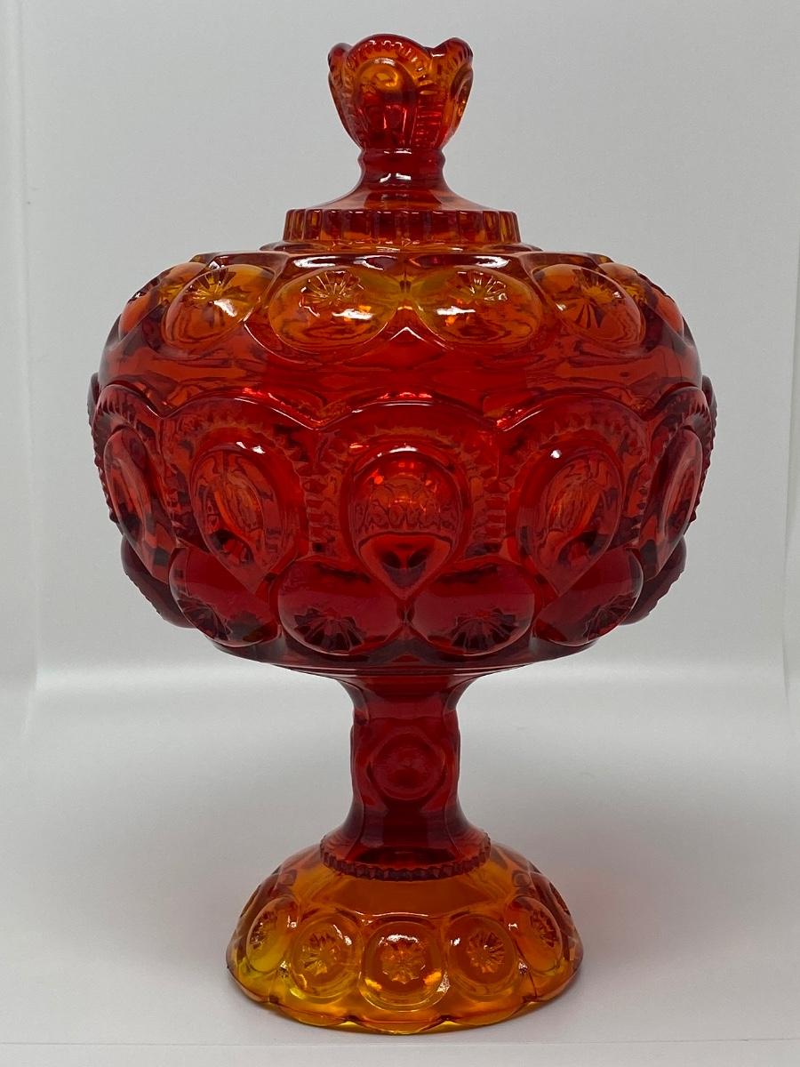 Vintage L. E. Smith Amberina Glass Moon and Stars Amberina Glass Dish with Lid in Red, Orange, and Yellow Flame Color LE Smith Covered Compote. 6" W x 6" L x 9.5" T