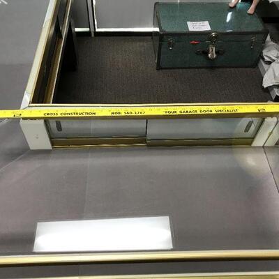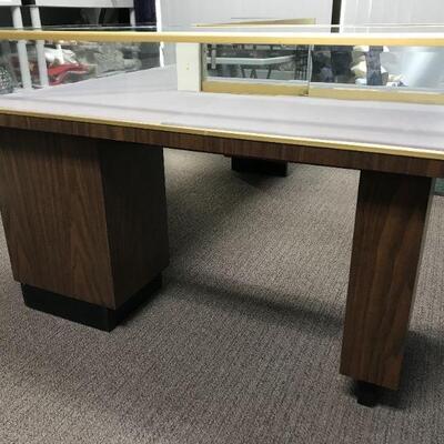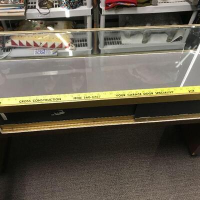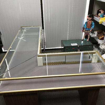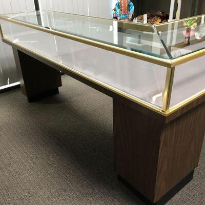 Very good condition. We've had it for about 5 years. We bought it from a jeweler who was retiring. We don't have a need for it anymore. 32”tall, short part is 50”, long part is 70” long. Interior felt is new and easy to replace.