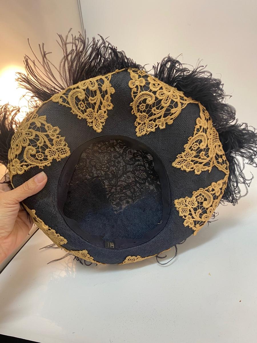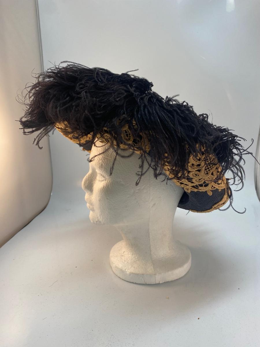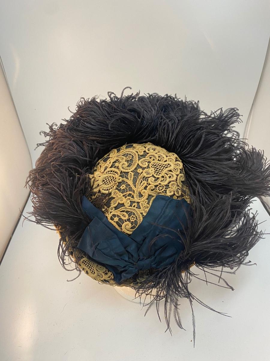 Vintage Lace & Ostrich Feather Covered Woven Straw Hat. Dark blue hat with dark ostrich feathers and tatted lace applique. In overall good vintage condition.