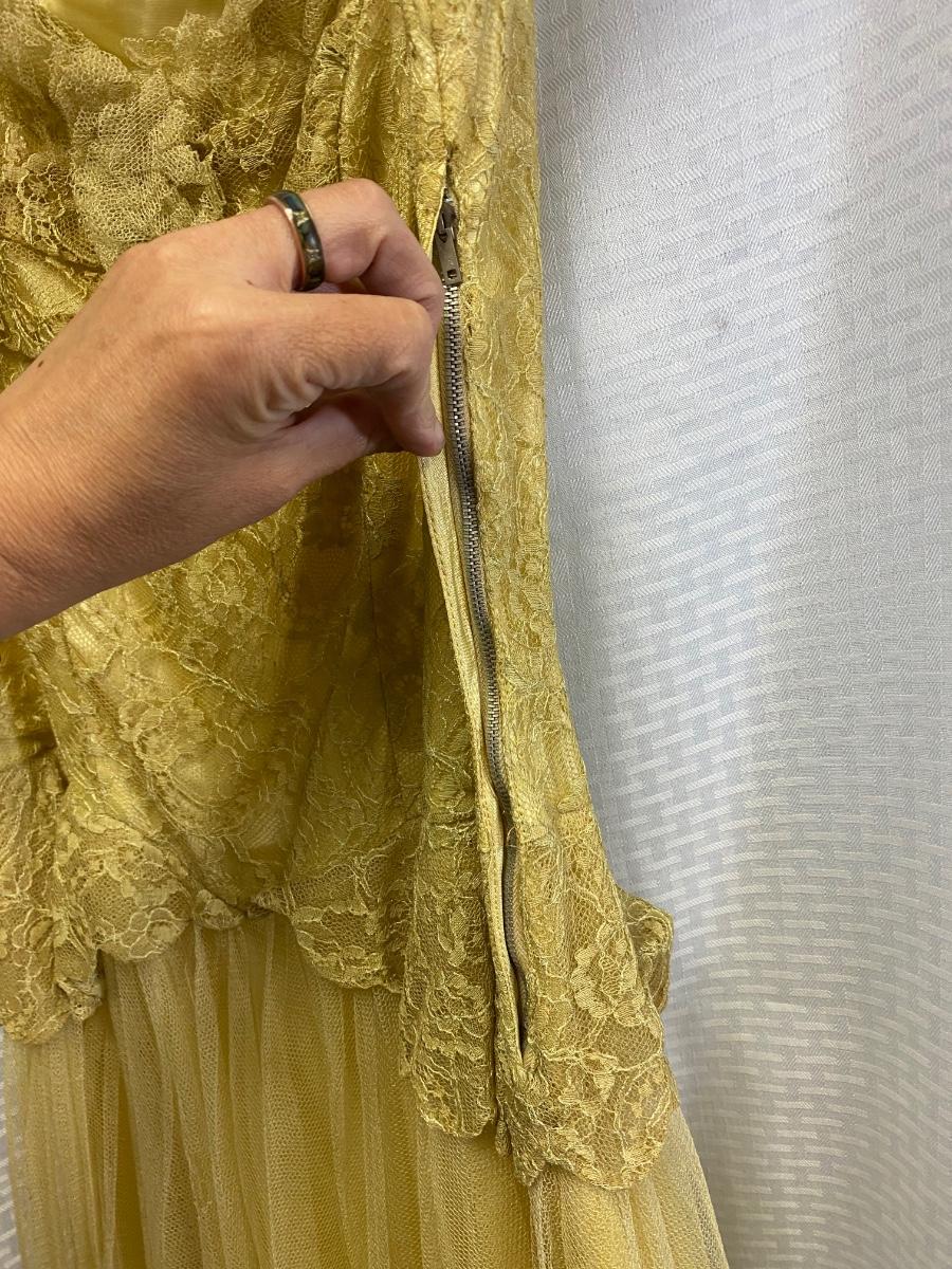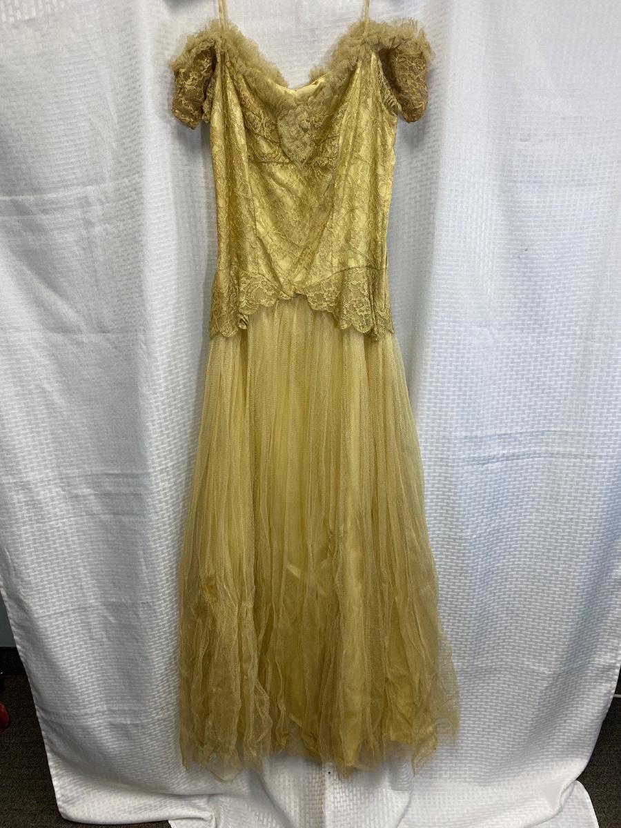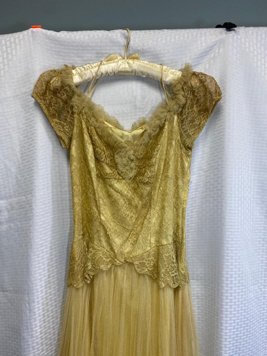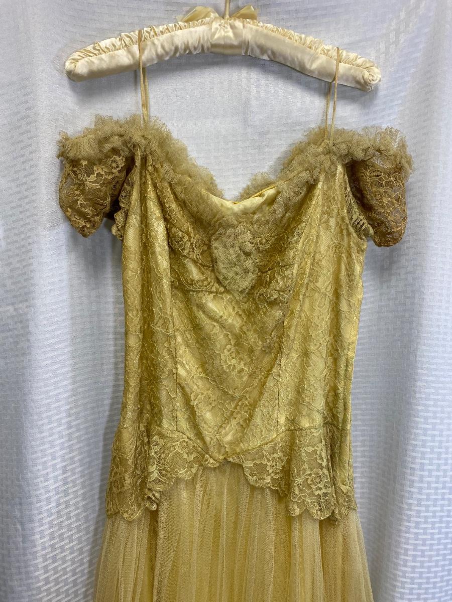 Vintage Lace & Tulle Party Prom Bridesmaid Dress Gold Yellow. In vintage condition, a bit discolored from age. Side zipper for a nice fit. Did not find any holes in fabric. About 13" across the waist, 15" armpit to armpit and 57" from shoulder to hem.