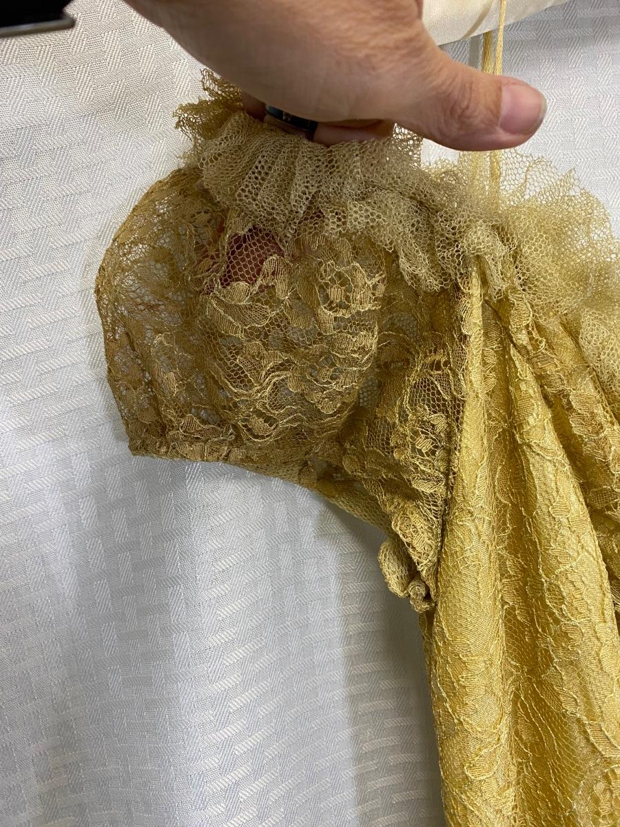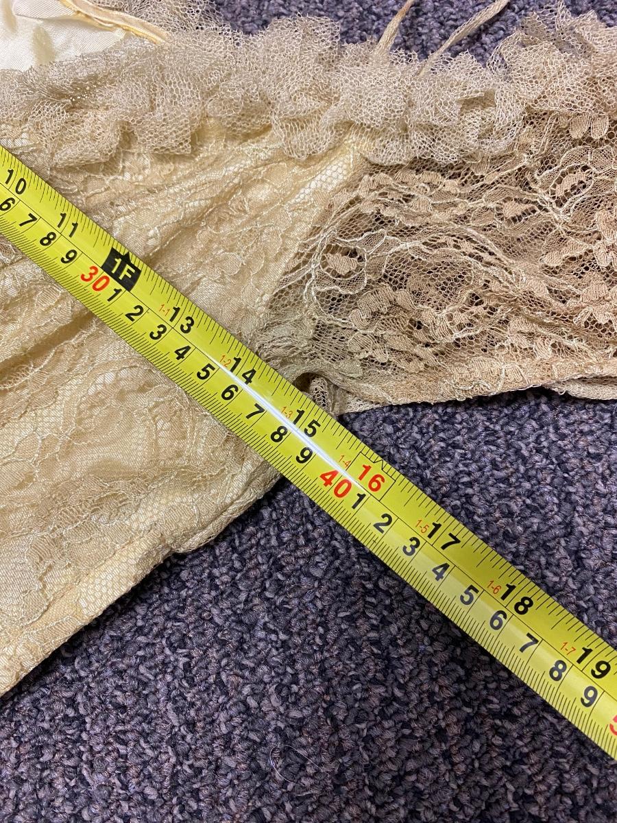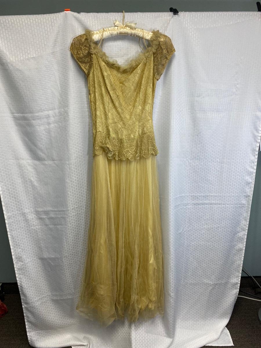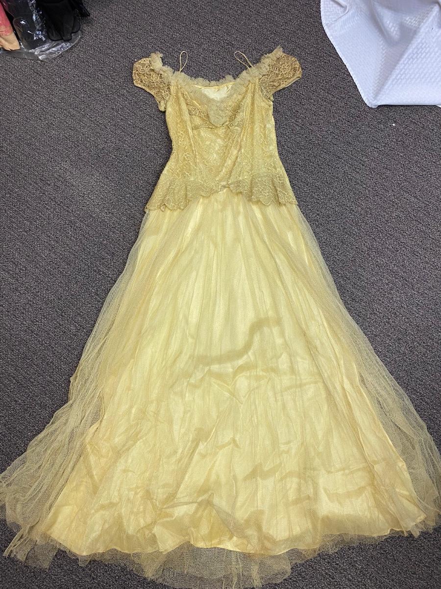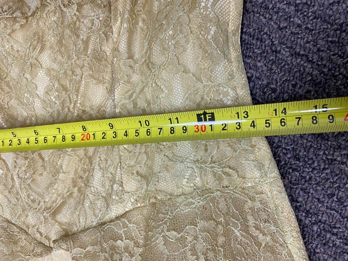 Vintage Lace & Tulle Party Prom Bridesmaid Dress Gold Yellow. In vintage condition, a bit discolored from age. Side zipper for a nice fit. Did not find any holes in fabric. About 13" across the waist, 15" armpit to armpit and 57" from shoulder to hem.