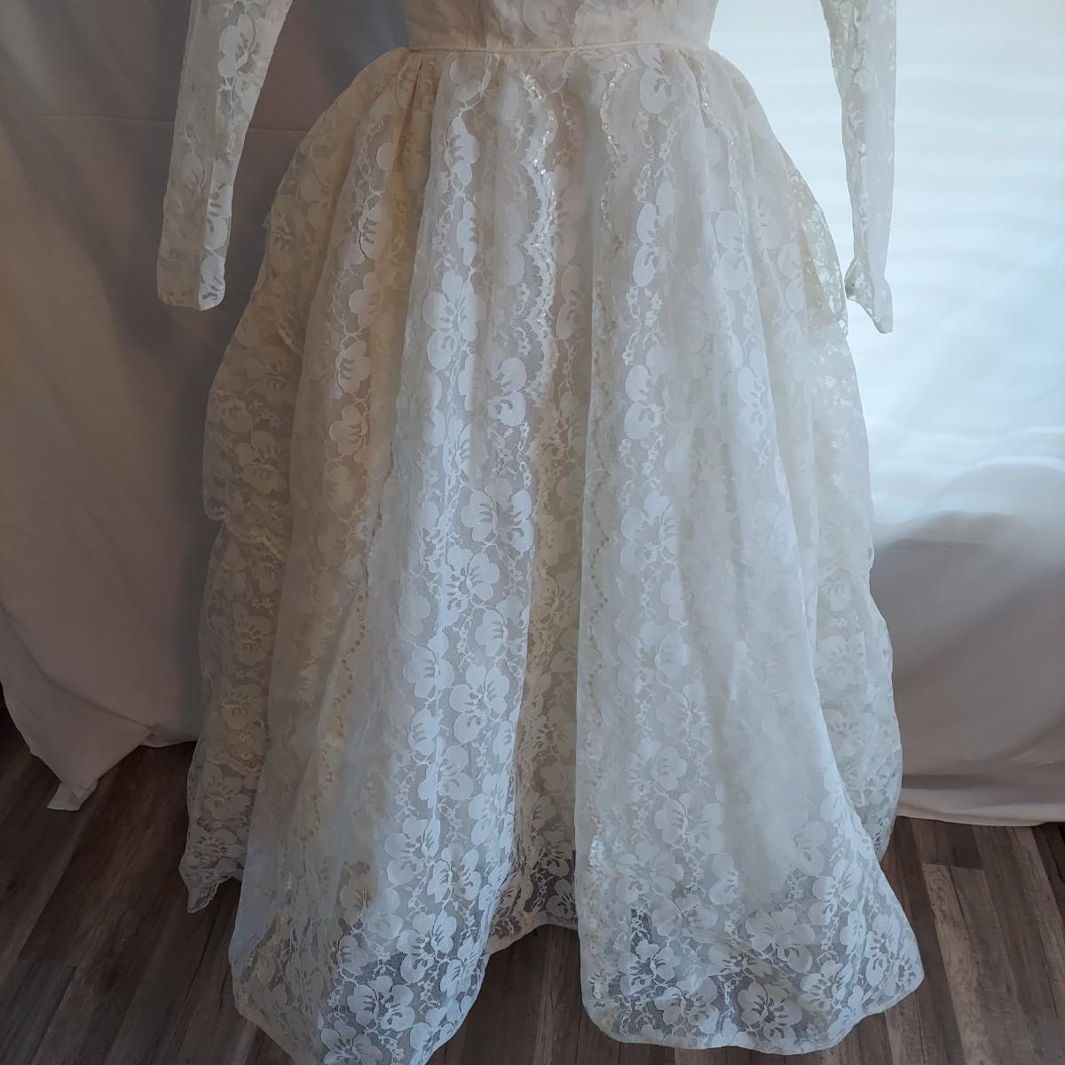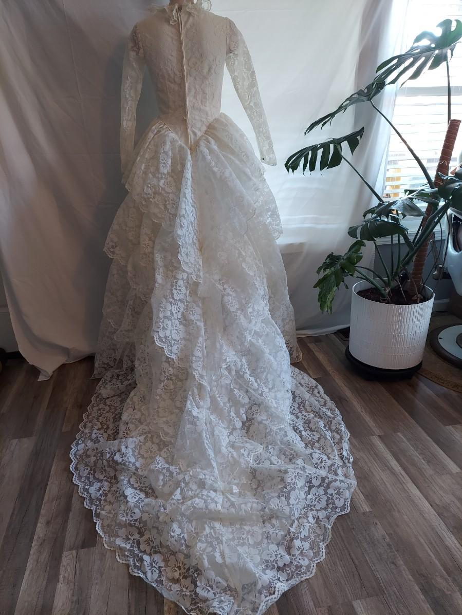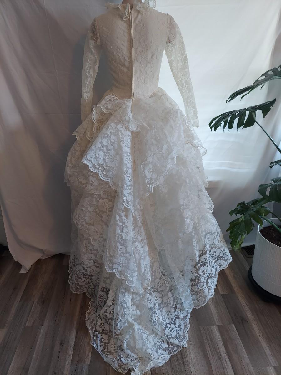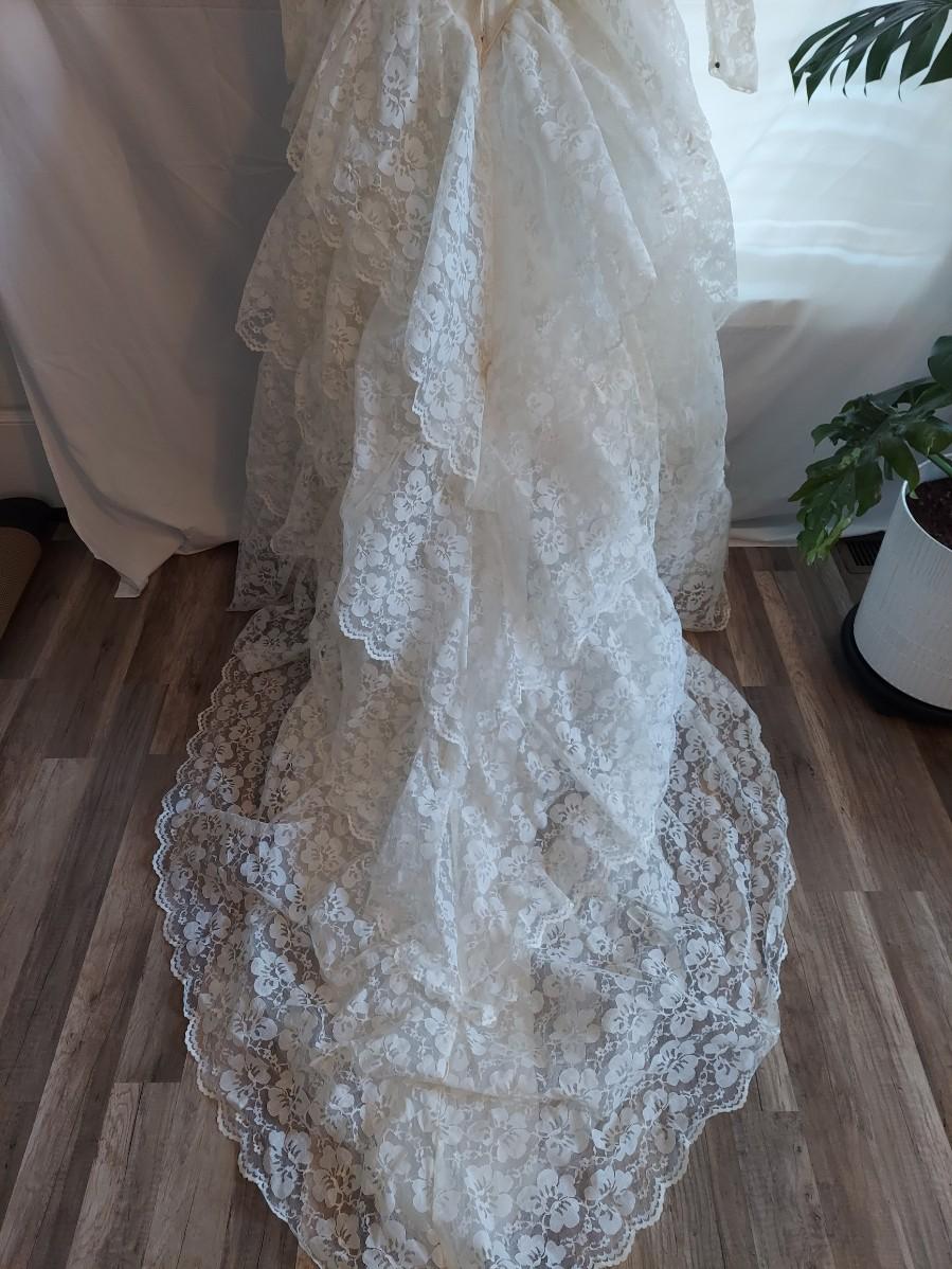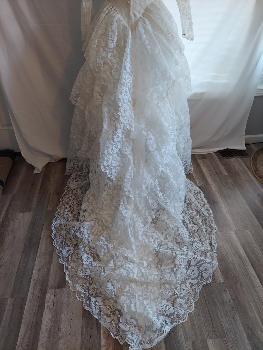 All lace vintage wedding dress. Appears to be synthetic materials. Has light beading and sequins. Train with two bustles. Abbot metal zipper. Approximate measurements are: Chest-33-34” Waist-25-26” Shoulder to cuff- 24” Train from bustle button to tip- 81”. Please see photos for details. Shipping available