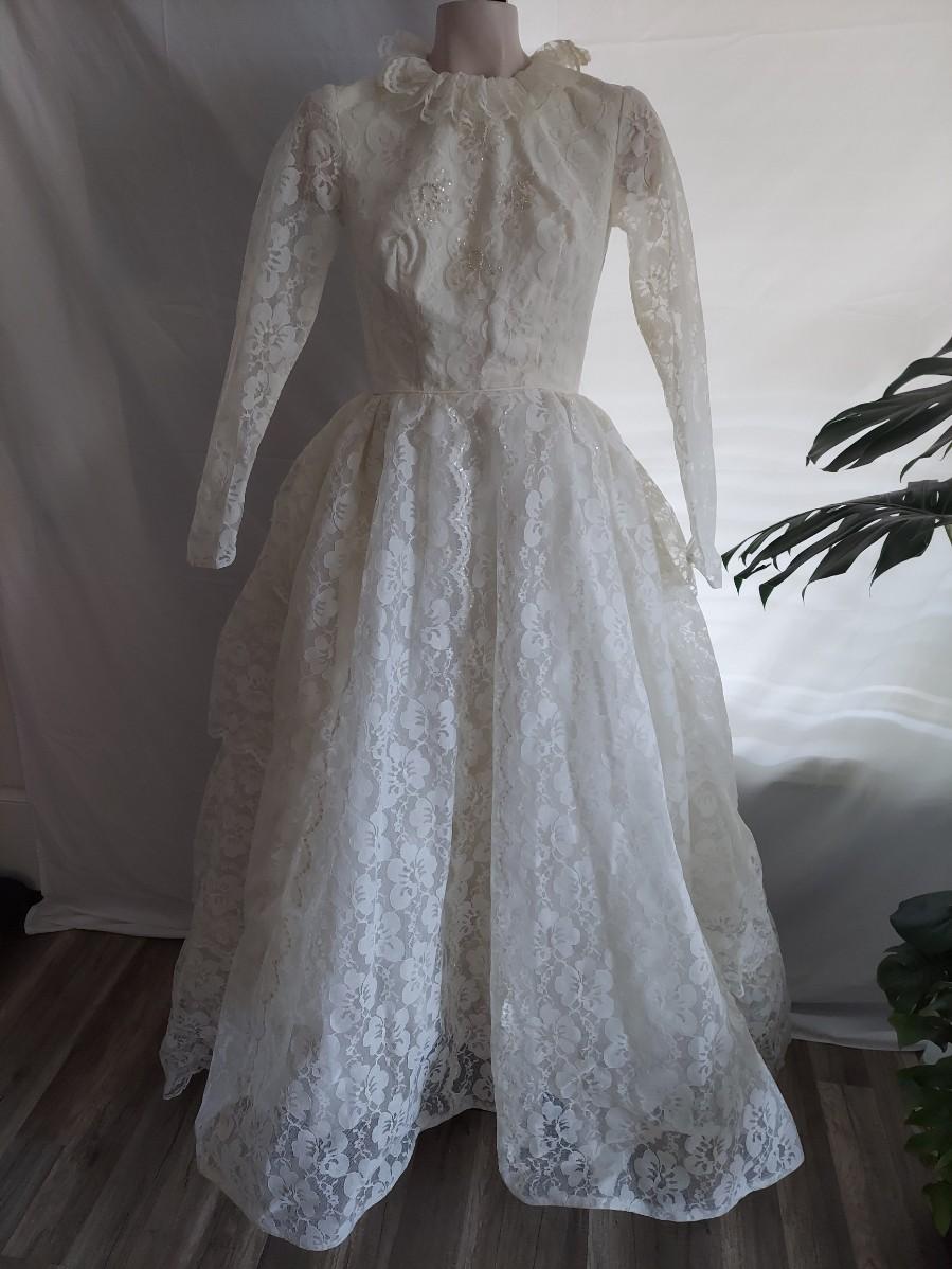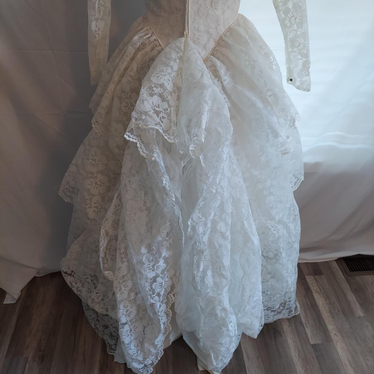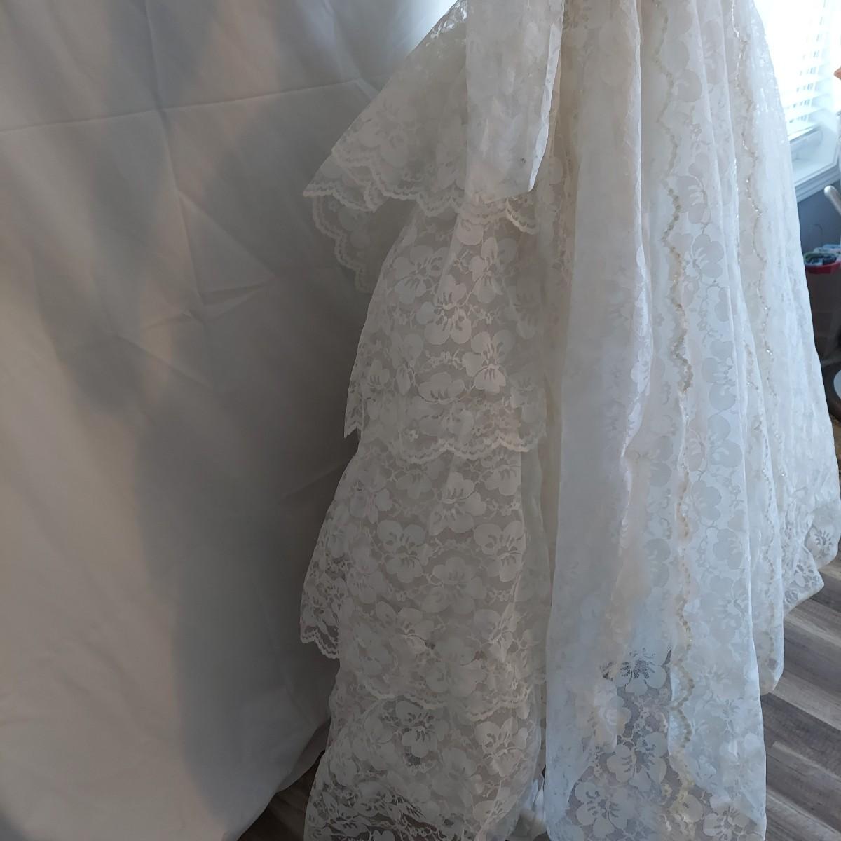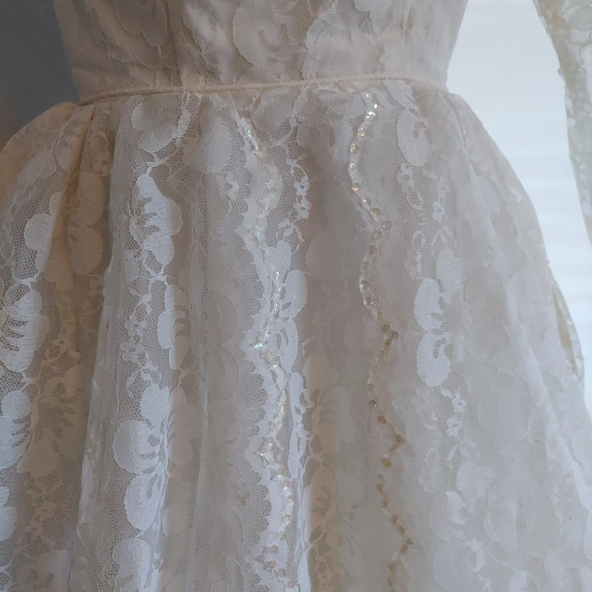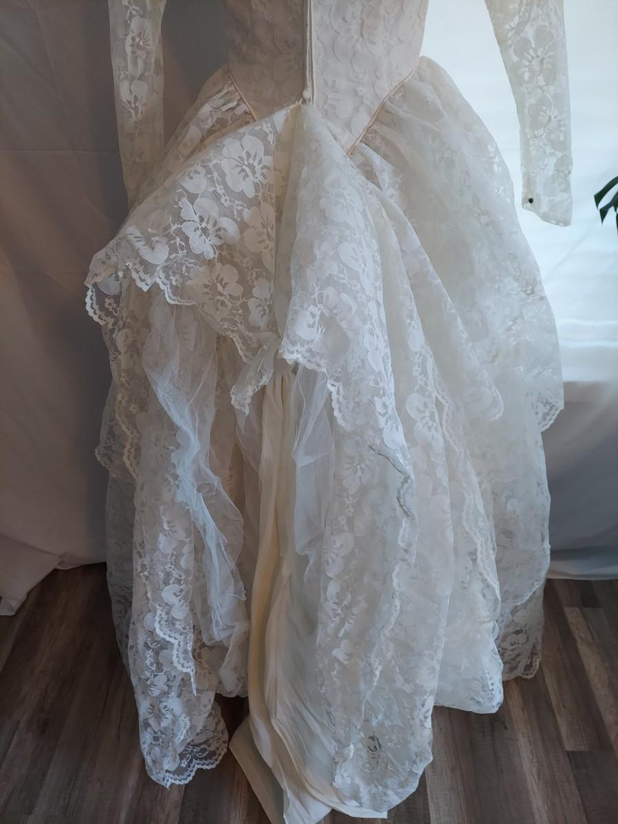 All lace vintage wedding dress. Appears to be synthetic materials. Has light beading and sequins. Train with two bustles. Abbot metal zipper. Approximate measurements are: Chest-33-34” Waist-25-26” Shoulder to cuff- 24” Train from bustle button to tip- 81”. Please see photos for details. Shipping available
