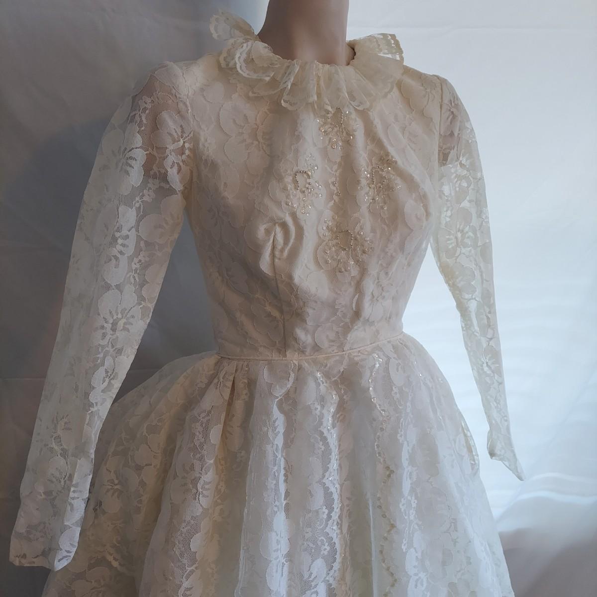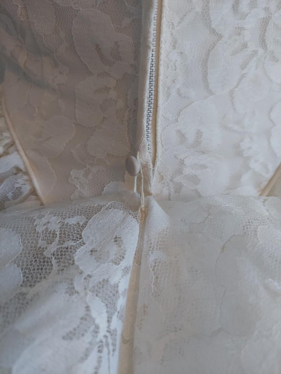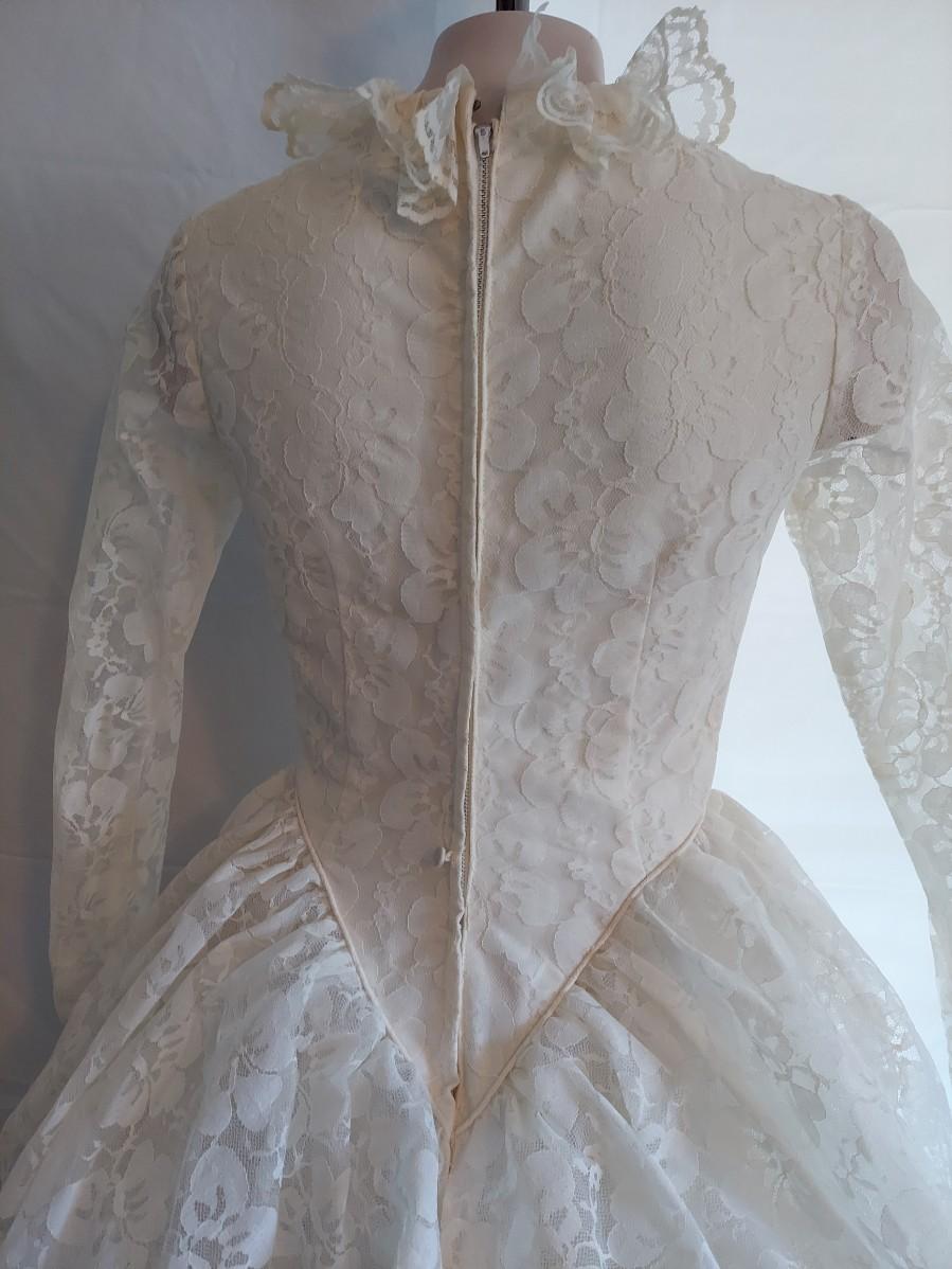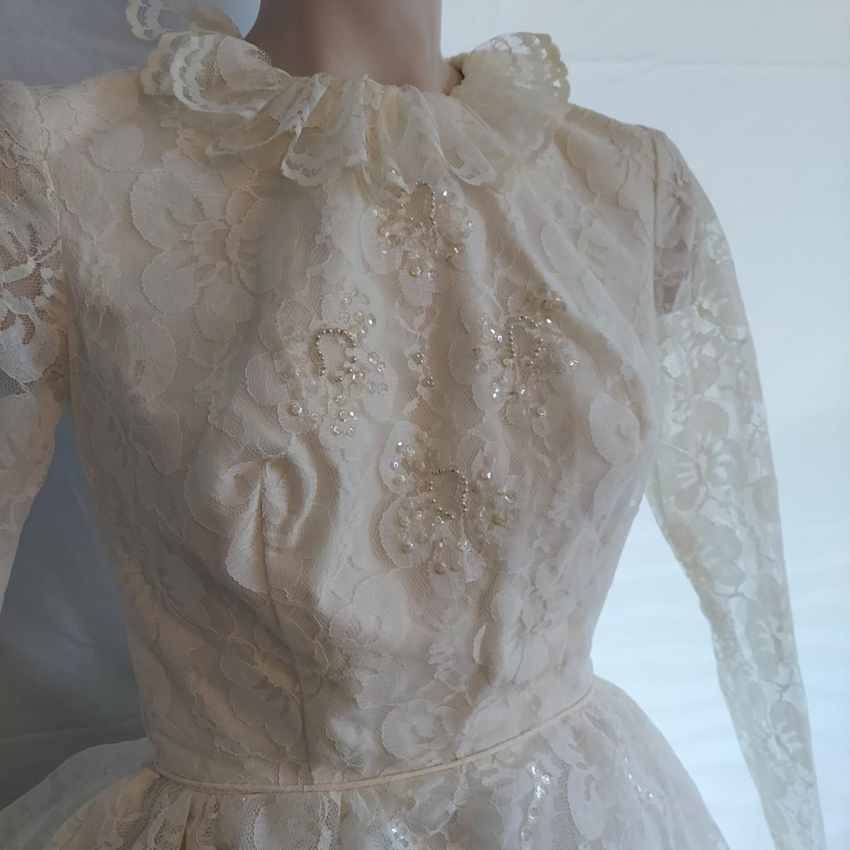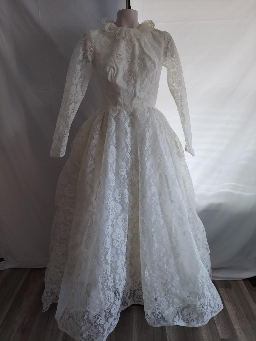 All lace vintage wedding dress. Appears to be synthetic materials. Has light beading and sequins. Train with two bustles. Abbot metal zipper. Approximate measurements are: Chest-33-34” Waist-25-26” Shoulder to cuff- 24” Train from bustle button to tip- 81”. Please see photos for details. Shipping available