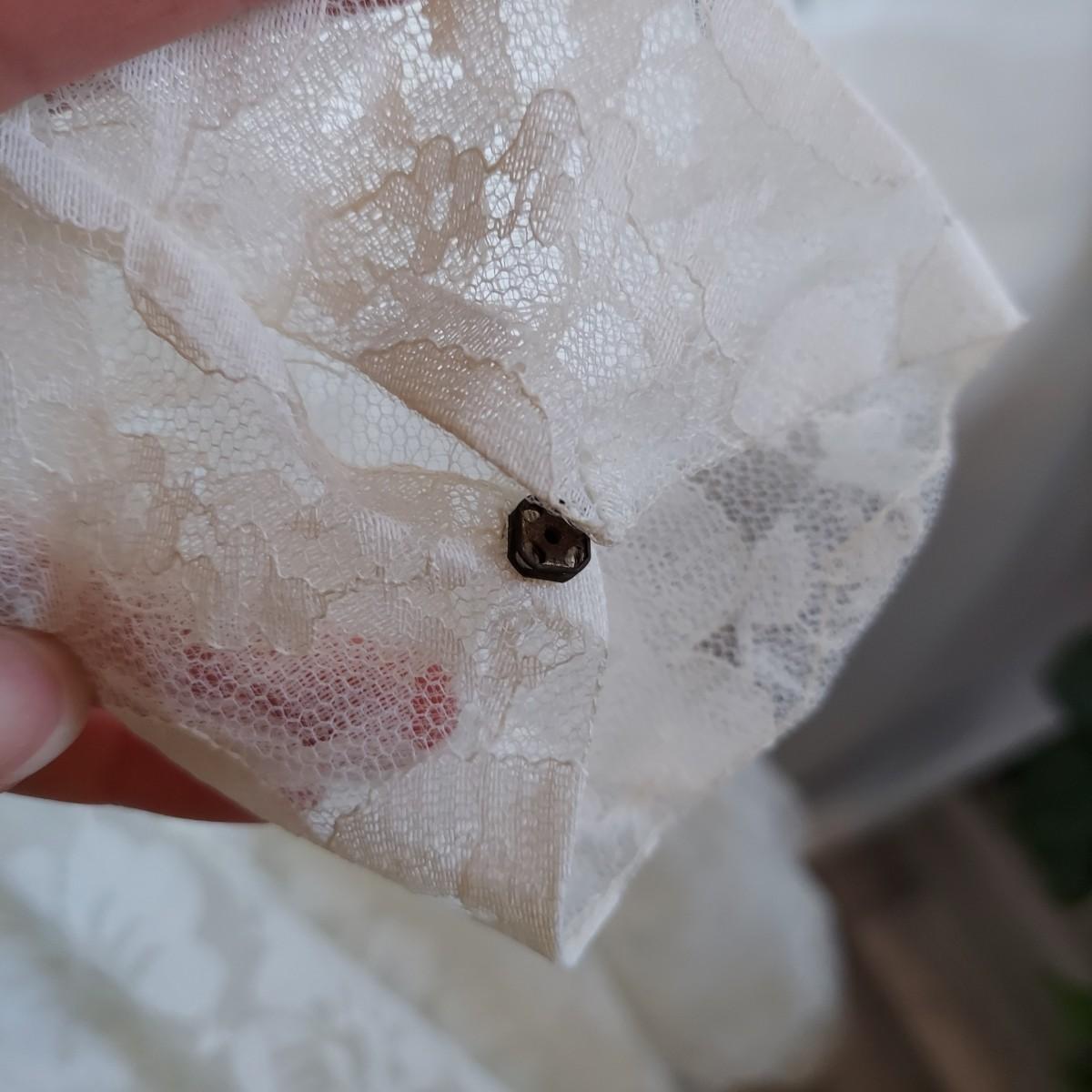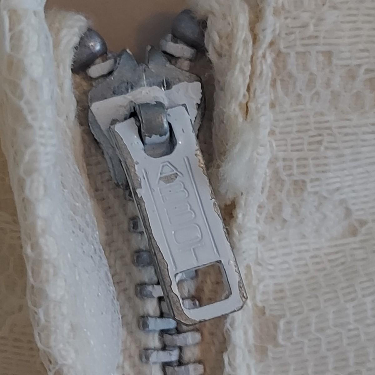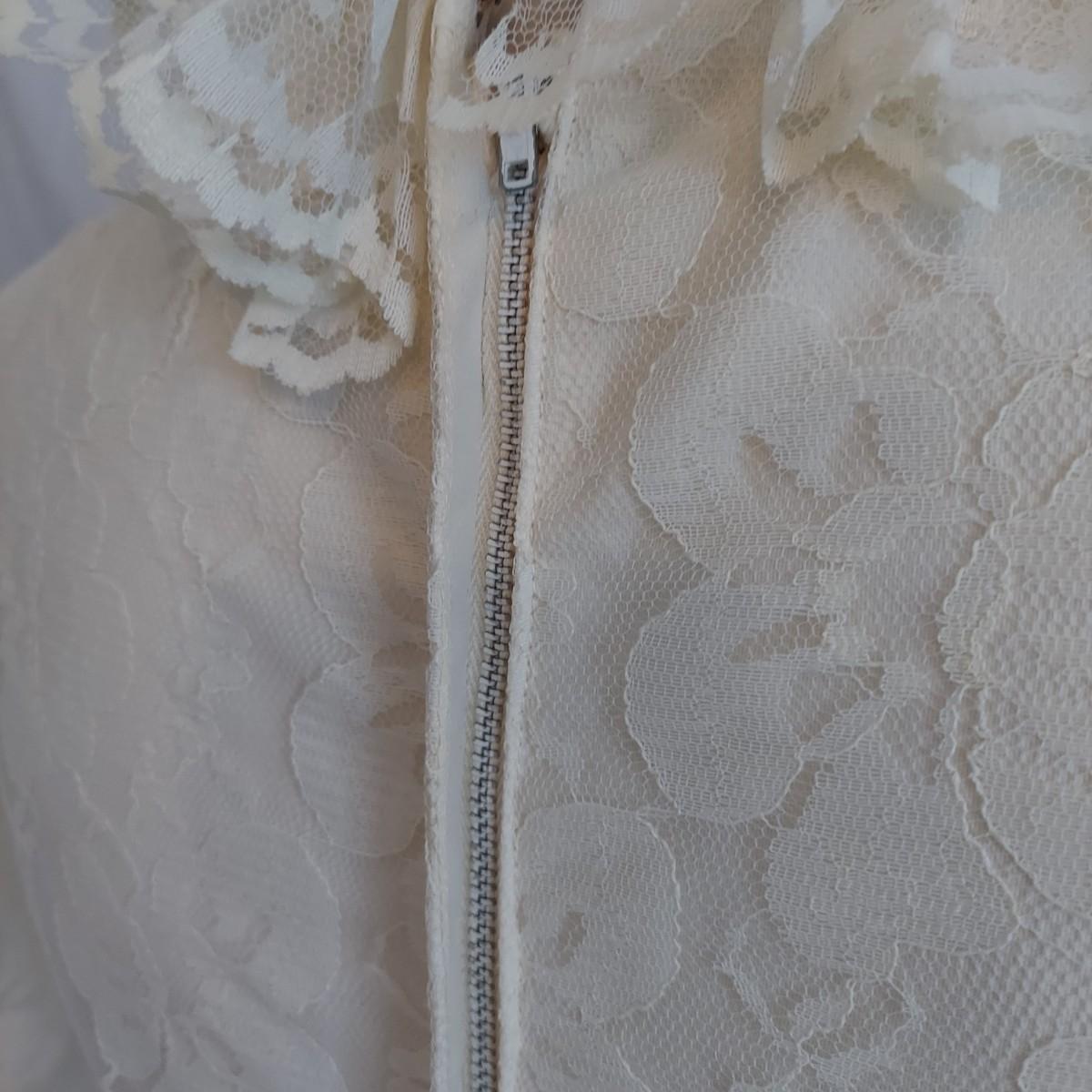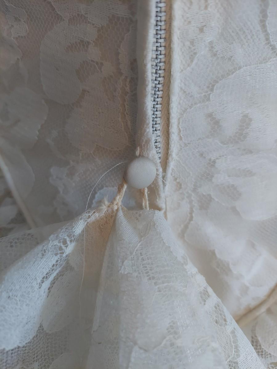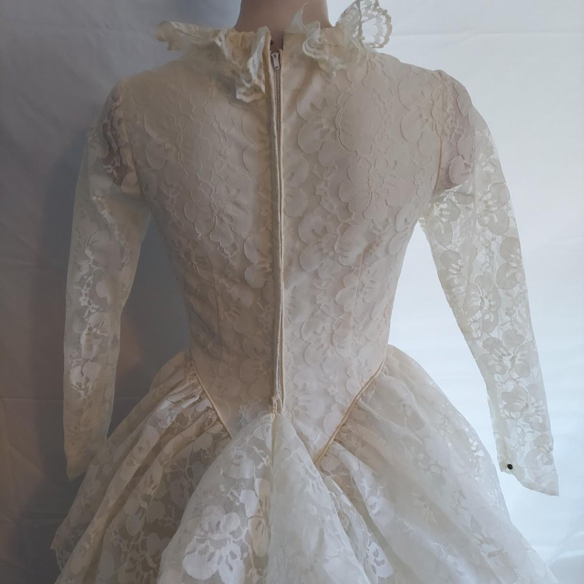 All lace vintage wedding dress. Appears to be synthetic materials. Has light beading and sequins. Train with two bustles. Abbot metal zipper. Approximate measurements are: Chest-33-34” Waist-25-26” Shoulder to cuff- 24” Train from bustle button to tip- 81”. Please see photos for details. Shipping available