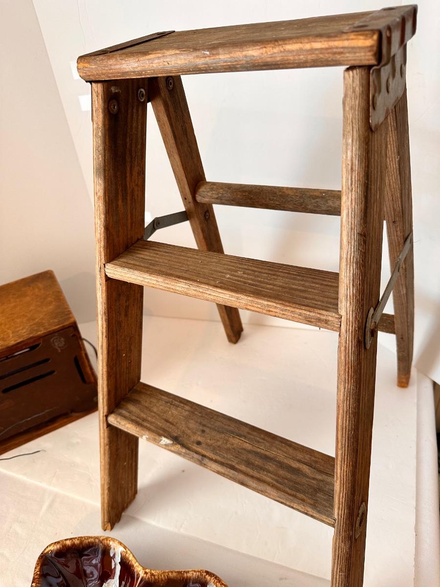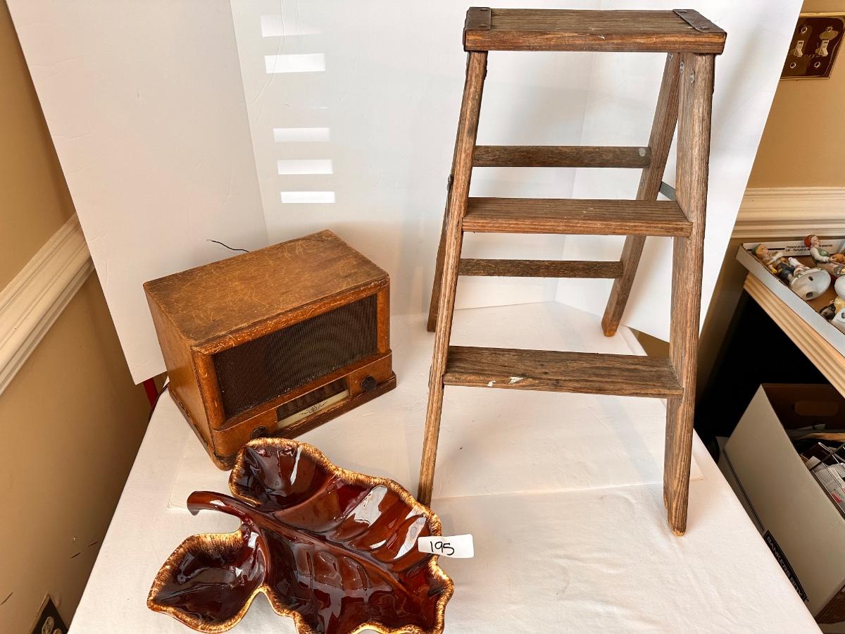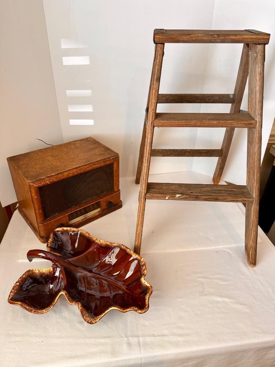 VINTAGE LADDER, RADIO, AND HULL (BROWN LEAF DISH) LOT AS PICTURED