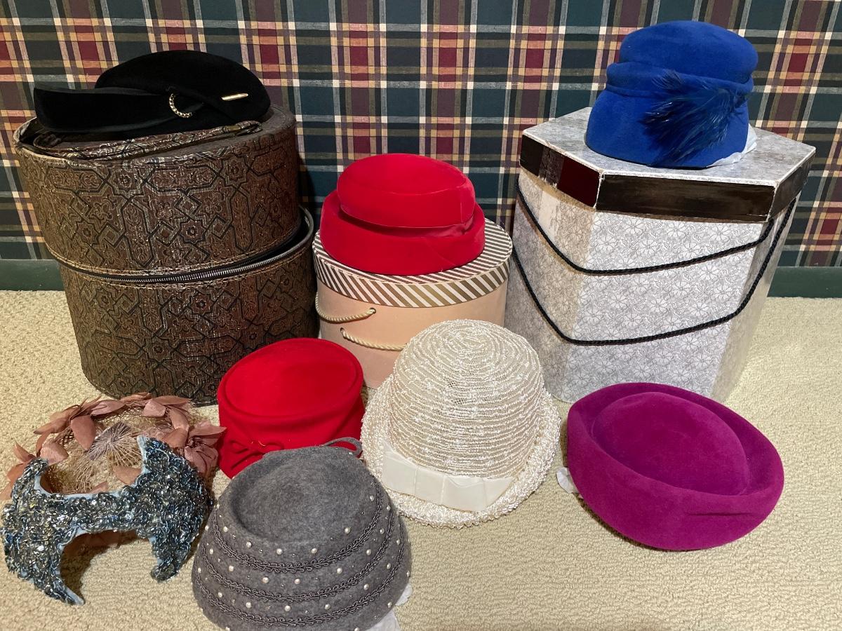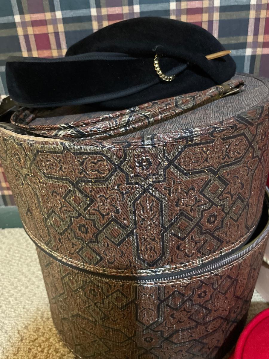 Beautiful felt and 1 sequin vintage hats with zippered hat box