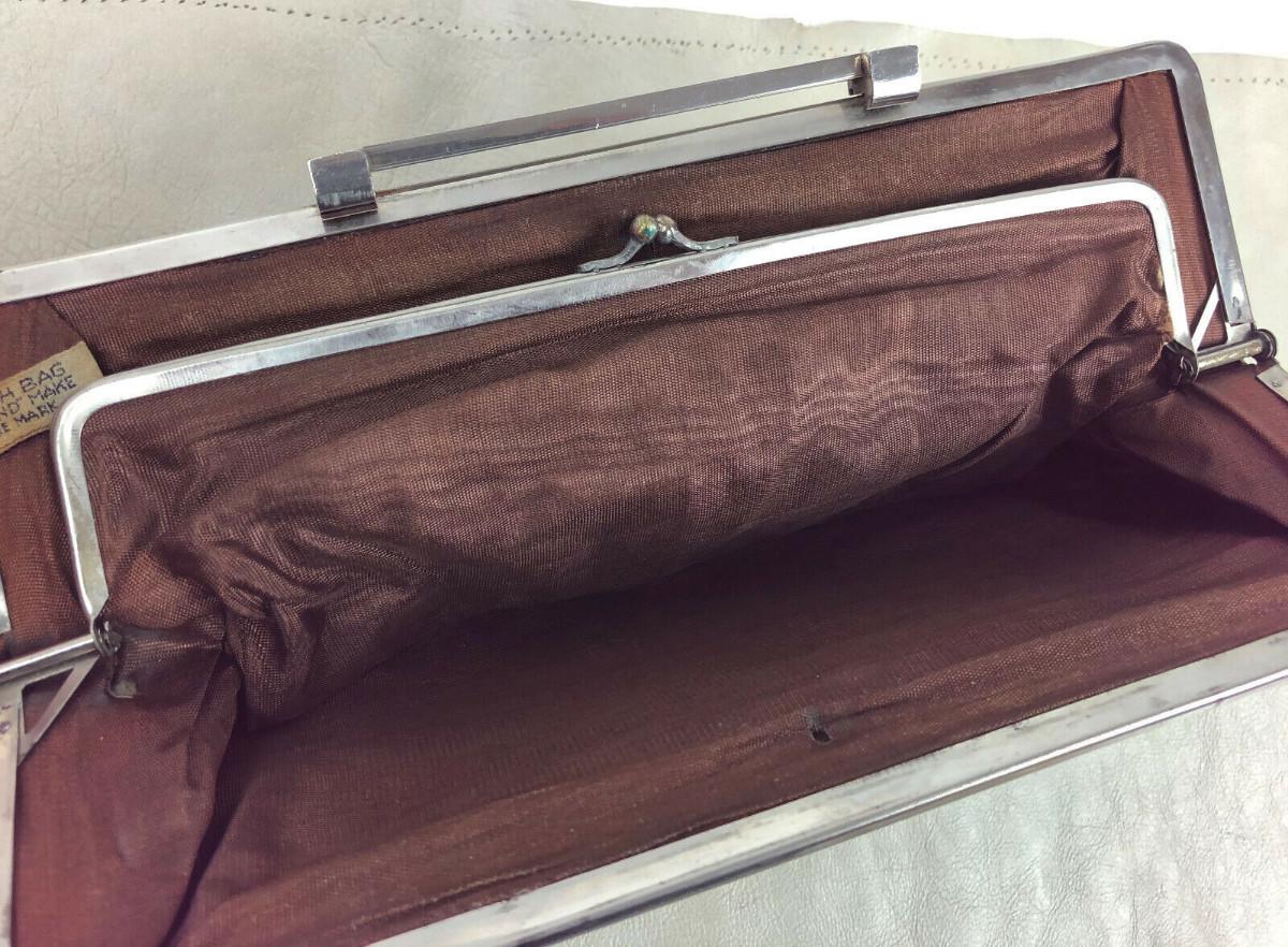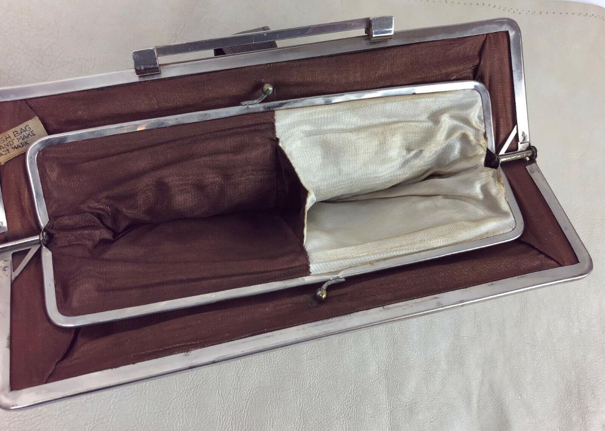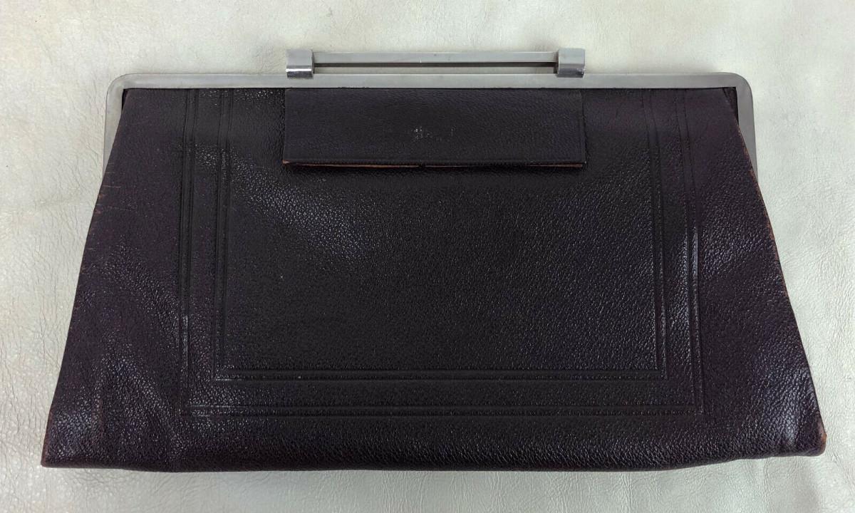 True vintage..Dark brown leather with silver tone trim and moiré silk fabric lining with interior compartment...Labeled BRITISH BAG OWNLAND MAKE TRADE MARK as shown...Light normal use..handle on back...approx 11.5 x 6.25"...Circa 1950's I believe...Offered with no reserve...