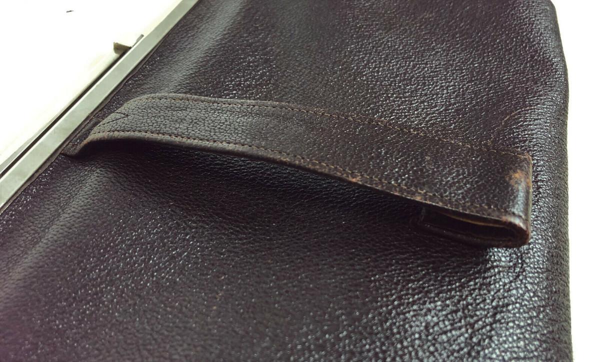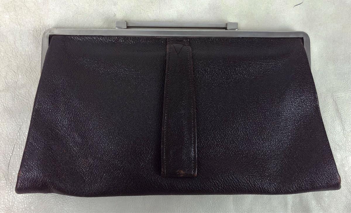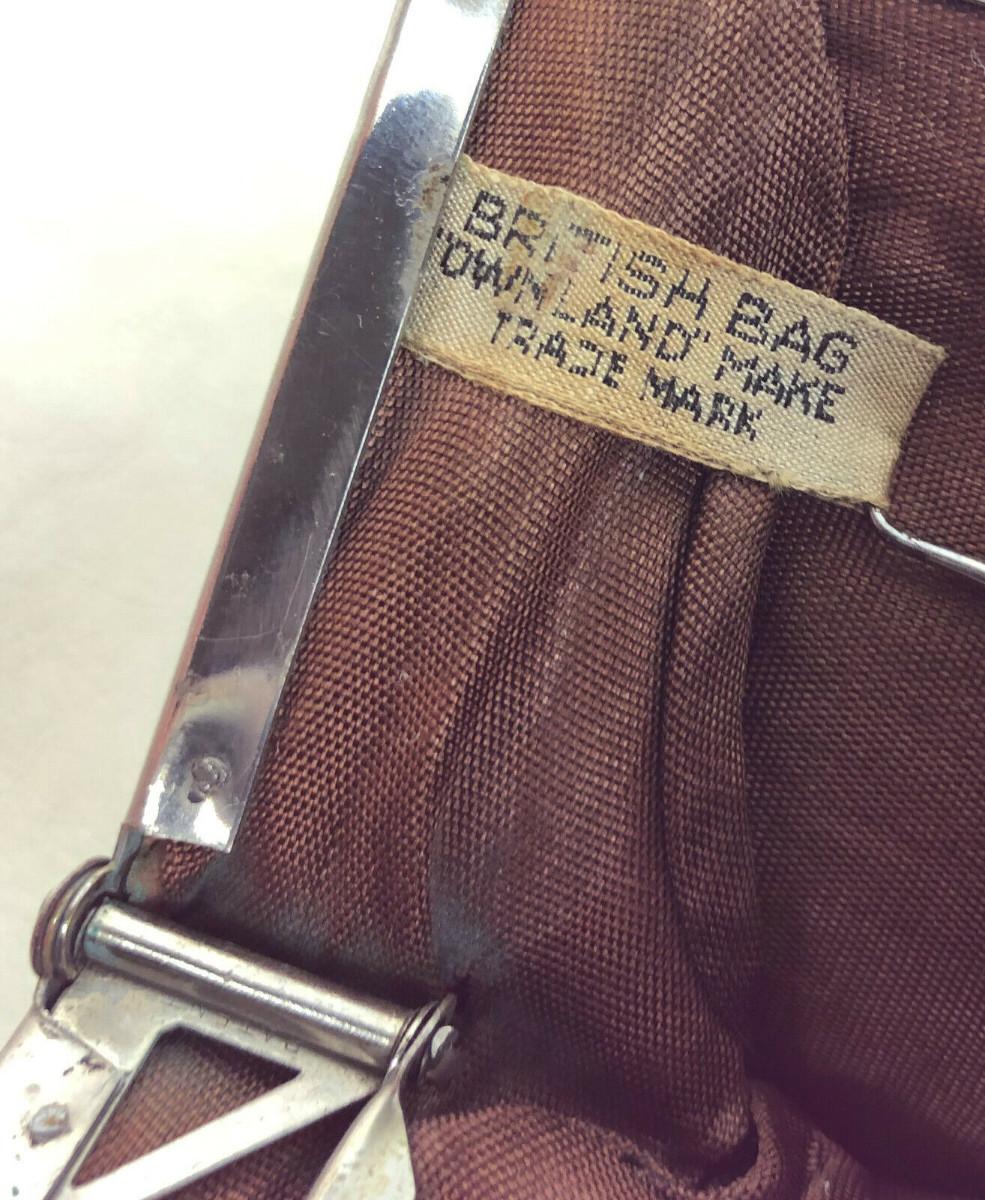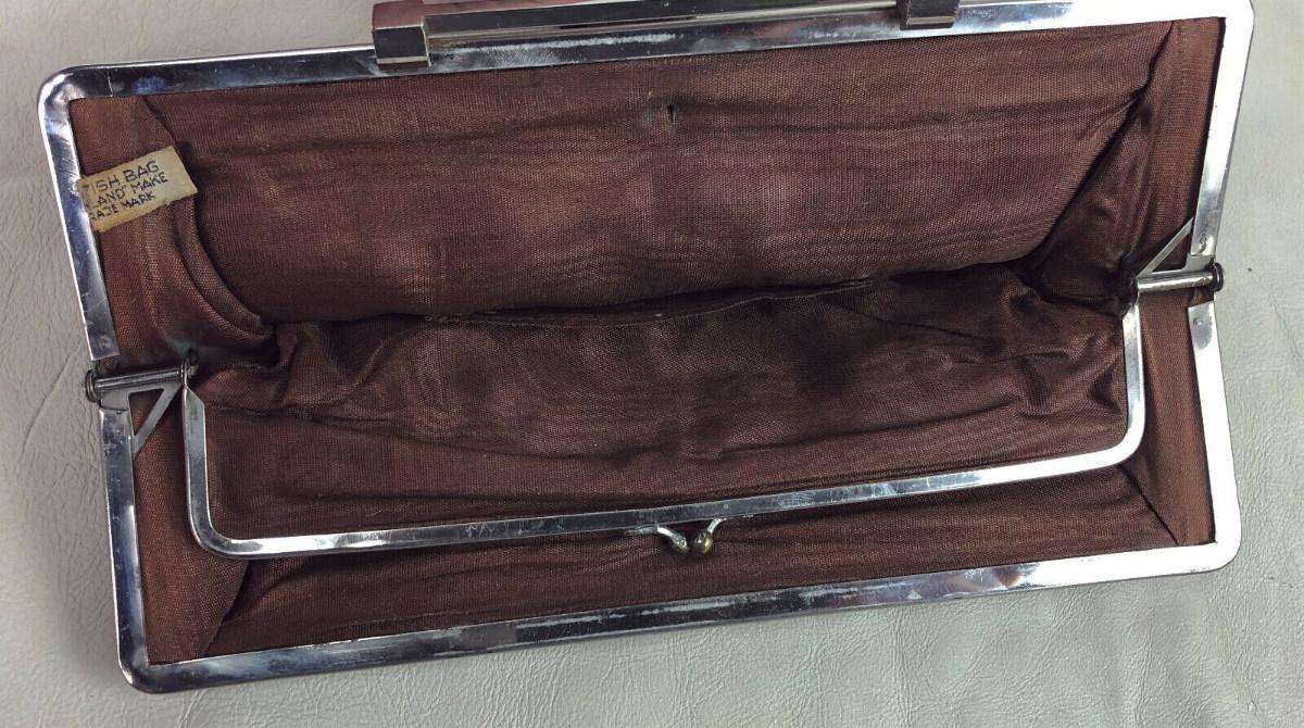 True vintage..Dark brown leather with silver tone trim and moiré silk fabric lining with interior compartment...Labeled BRITISH BAG OWNLAND MAKE TRADE MARK as shown...Light normal use..handle on back...approx 11.5 x 6.25"...Circa 1950's I believe...Offered with no reserve...