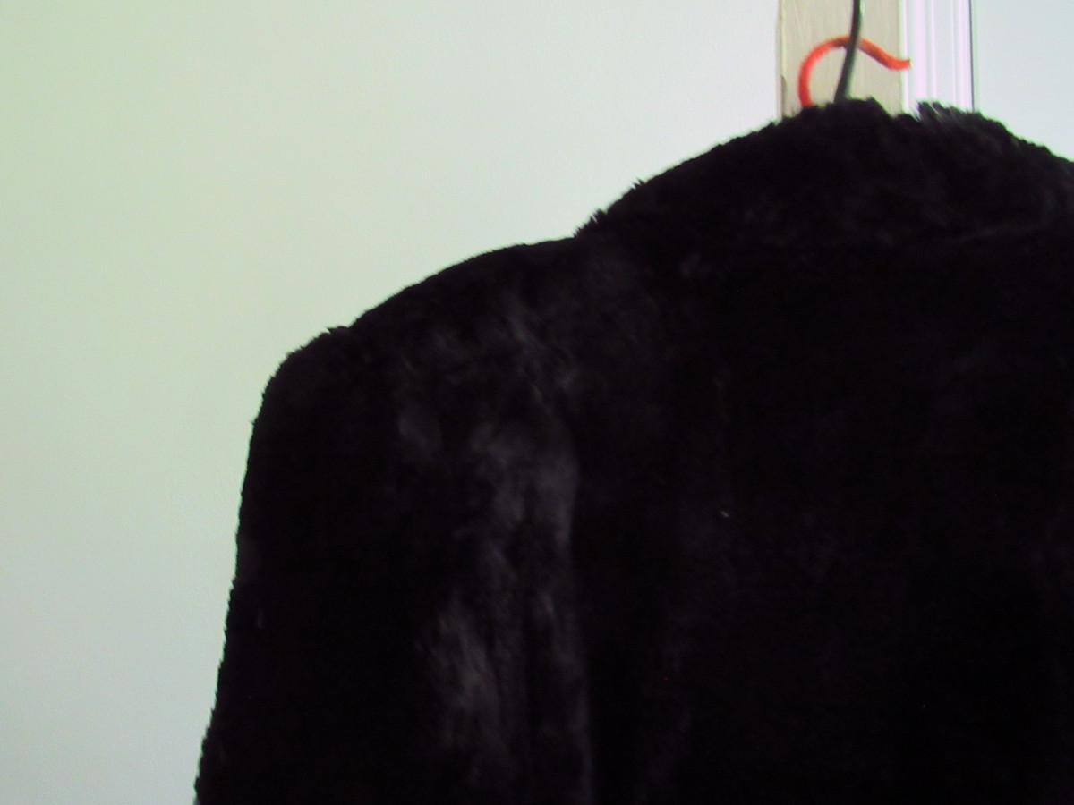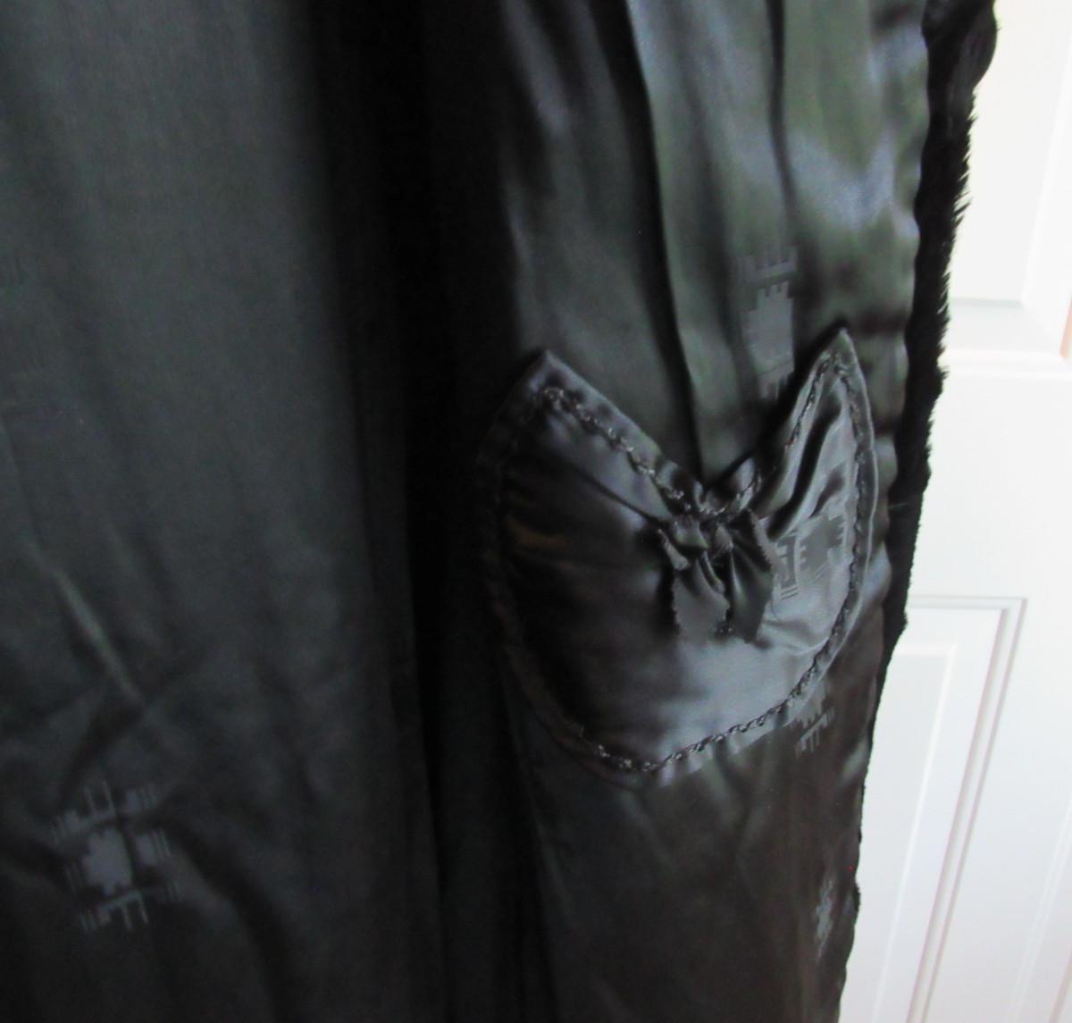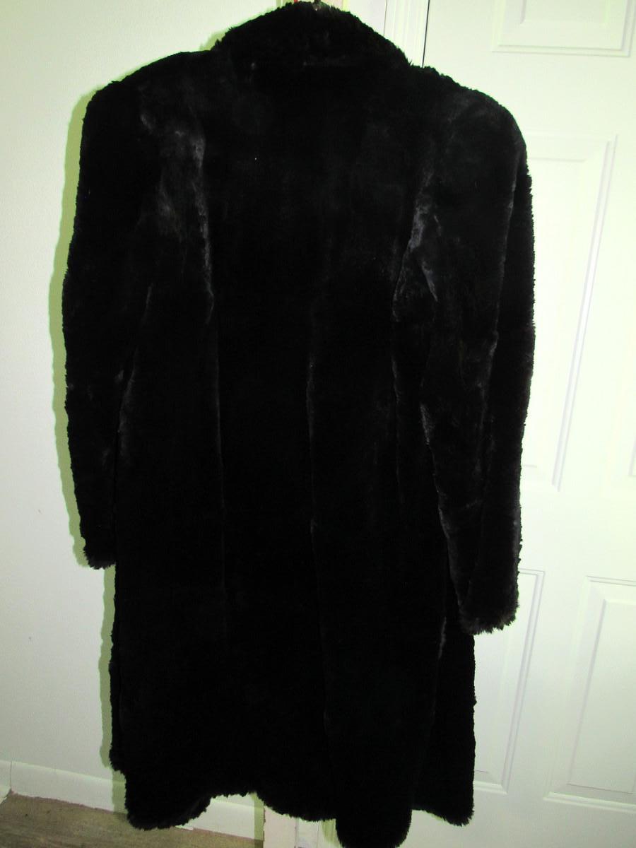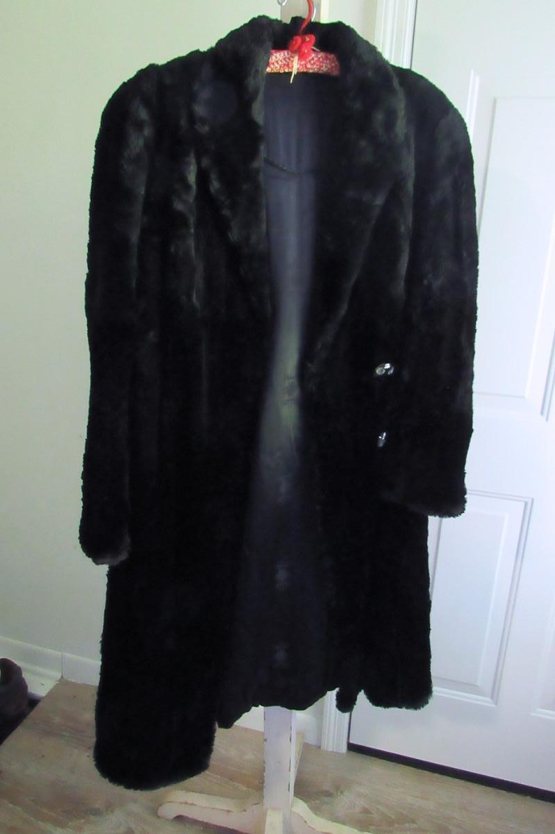 Very hard to photograph. I am not certain this is real fur, I am no expert in furs. It looks and feels like rabbit fur to me, but is all black, short maybe about 1/2" long and very soft. Very pretty dark black coat. Button and loop closure at neck with 2 large loop and buttons. The loops have been repaired. Padded shoulders. There is a small spot on one wrist where the fur is shorter, not really matted down, but maybe like shorter hairs on the end of a pelt maybe? The sleeve linings have an extra lining inside, have no idea why, again, I am not an expert. No labels. Don't know maker or size. Measures about 16 - 17" at shoulders and about 43" long. There is a pic where there is a safely pin, this spot needs mending, easy fix. I don't see any other issues at all. It is so pretty and soft and warm and heavy in person. Shipping is available at actual shipping cost plus $5.00 handling fee per box for supplies/labor. See our terms for details. All sales are final. Condition notes may not be all inclusive, we may miss some issues as most vintage items are not in mint condition and have some degree of wear, paint loss, etc, but we always try to note obvious damage.