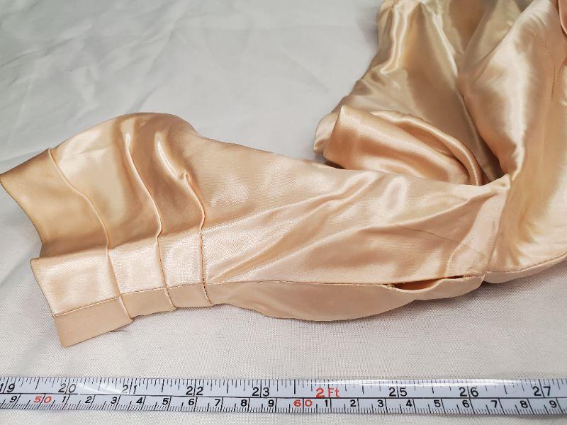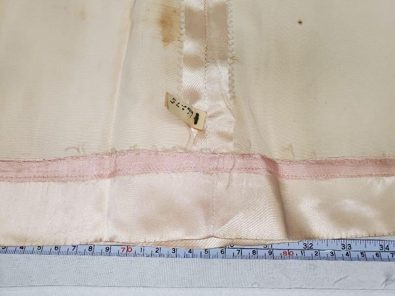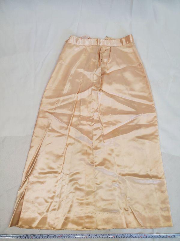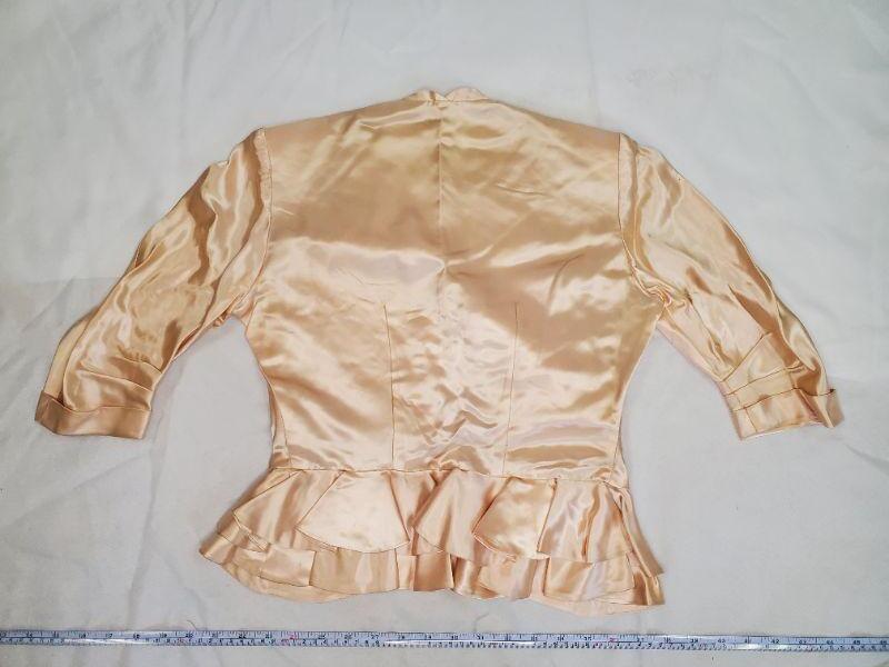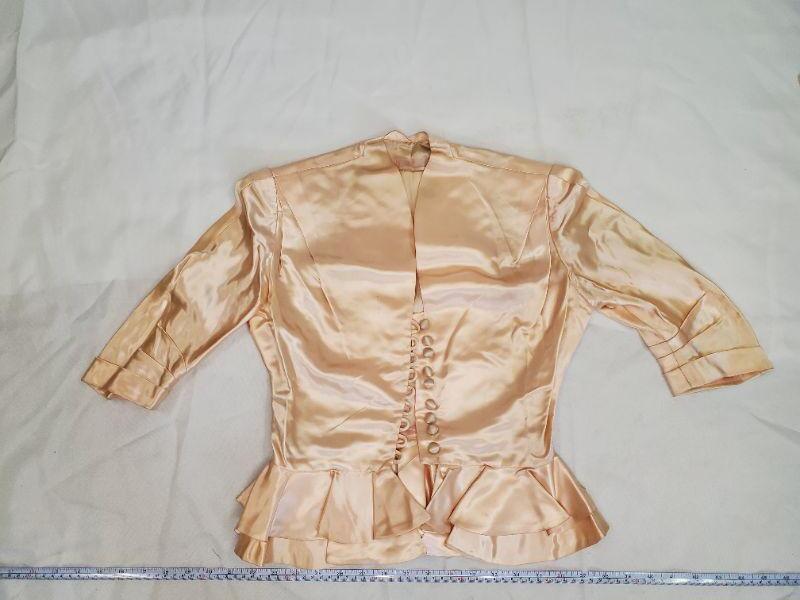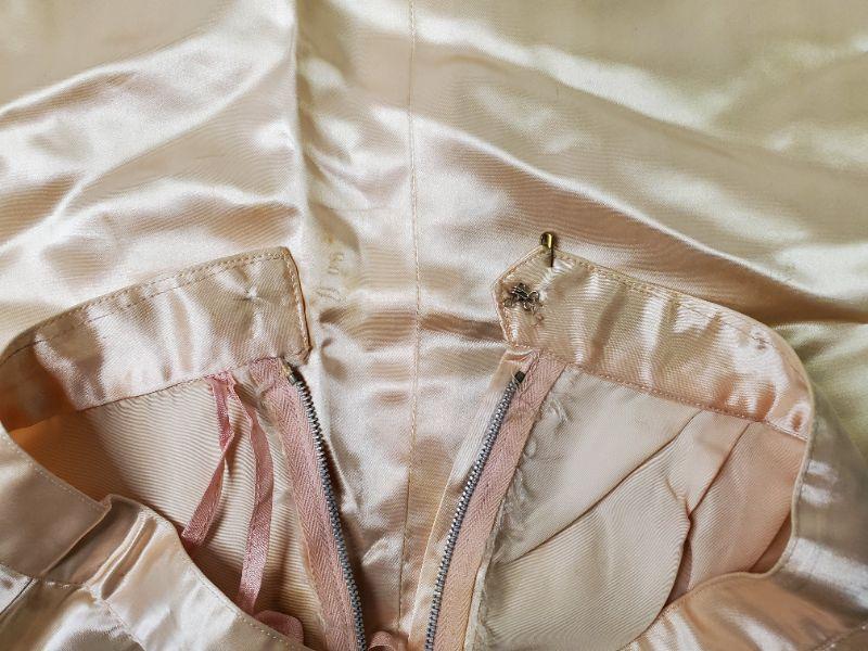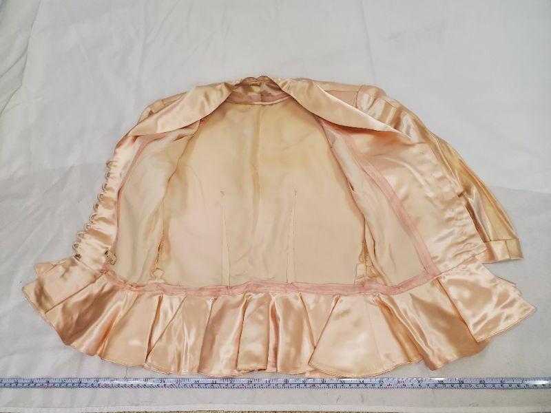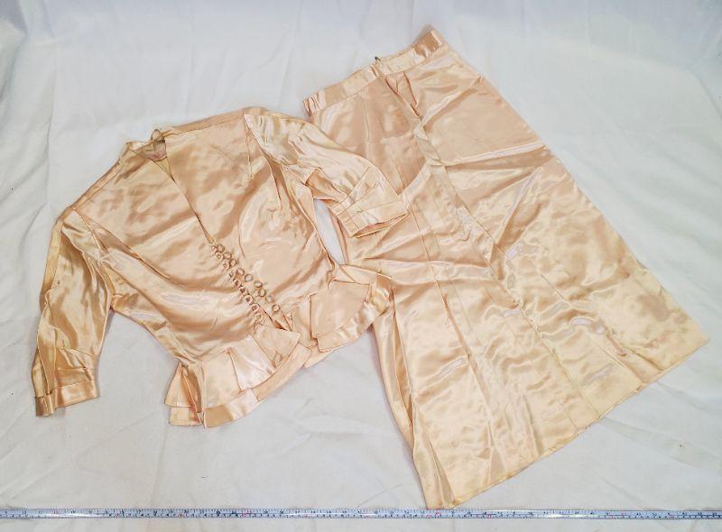 Very pretty, it is vintage and shows signs of being worn. There is a small hole on the underneath of one of the sleeves but it's on the seem. The skirt is missing the loop for the closure hook, zipper may be stuck...I didn't pull on it too hard as I didn't want to tear anything. Very awesome vintage outfit!! I did not find any brand tags or sizing anywhere.