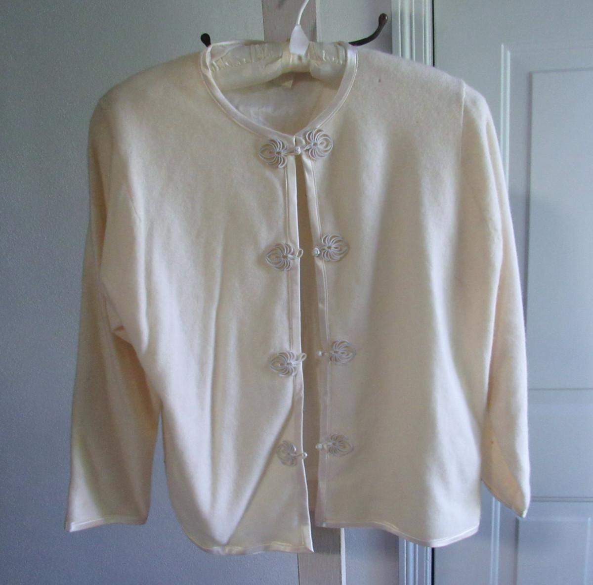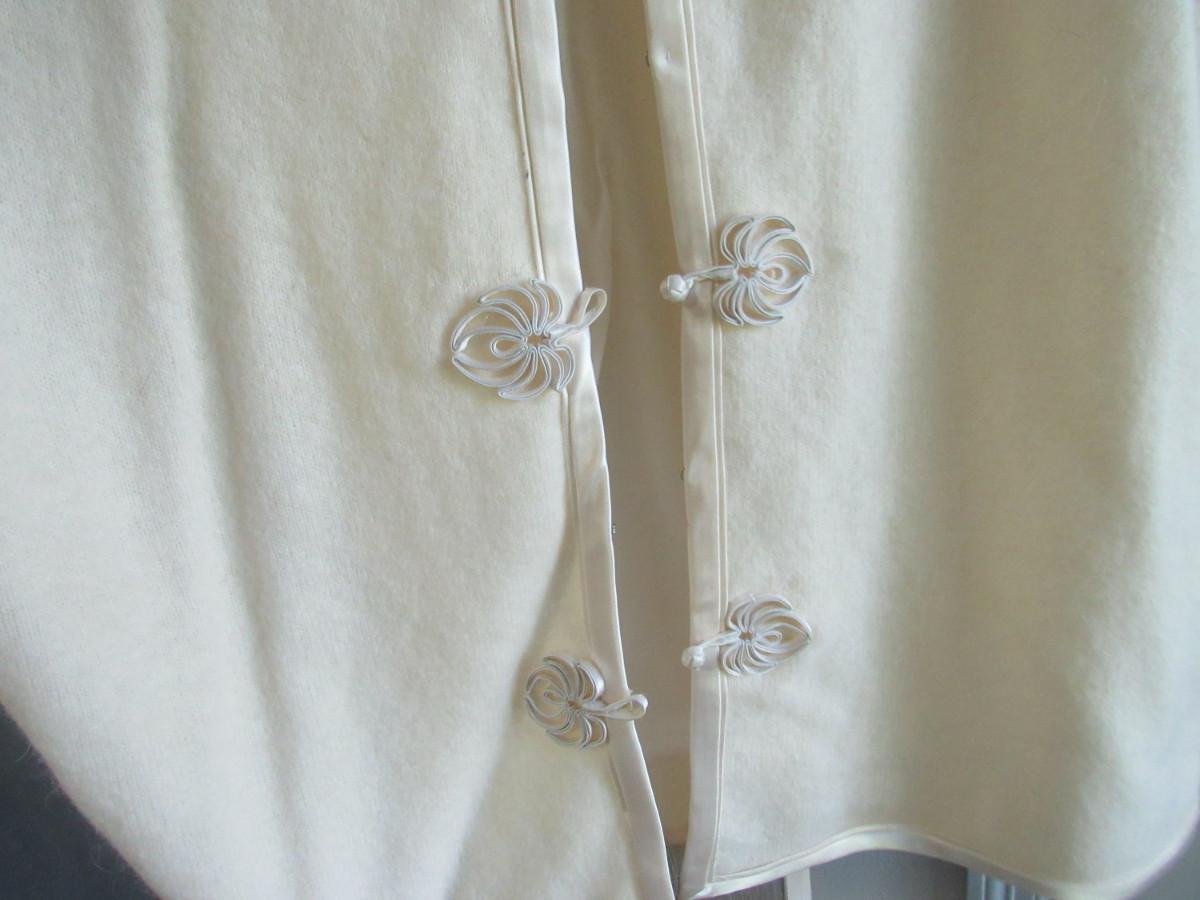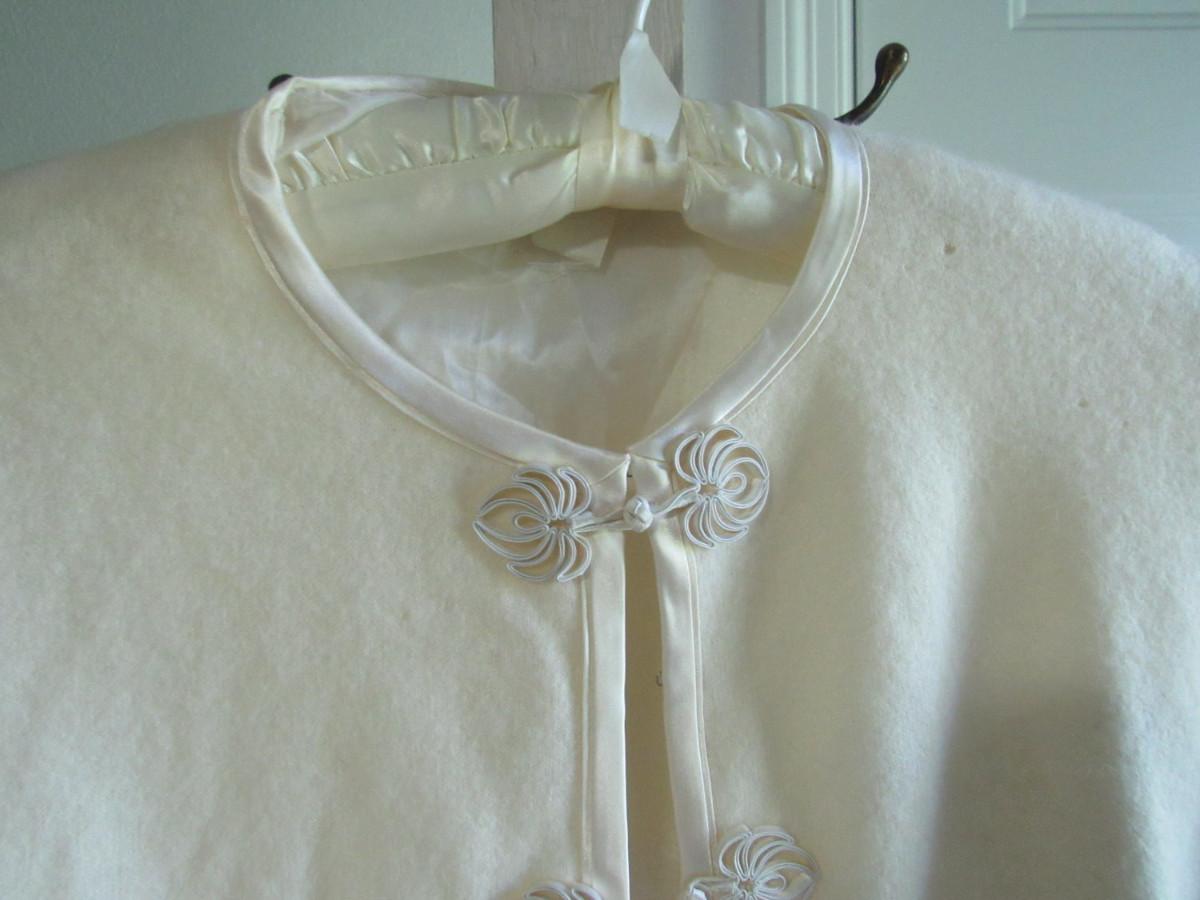 Label says size 40 but it is very small, must be a foreign measurement. It is 22 1/2" shoulder to hemline, about 19" at chest. It has formed leaf shaped ribbons for buttons with hook and eye closures. It is soft and fuzzy but I don't know fabrics very well, has 2 tiny holes on upper shoulder area. It may have more tiny holes, I couldn't see any, but due to the type of fabric, they may be there. Shipping is available at actual shipping cost plus $5.00 handling fee per box for supplies/labor. See our terms for details. All sales are final. Condition notes may not be all inclusive, we may miss some issues as most vintage items are not in mint condition and have some degree of wear, paint loss, etc, but we always try to note obvious damage.