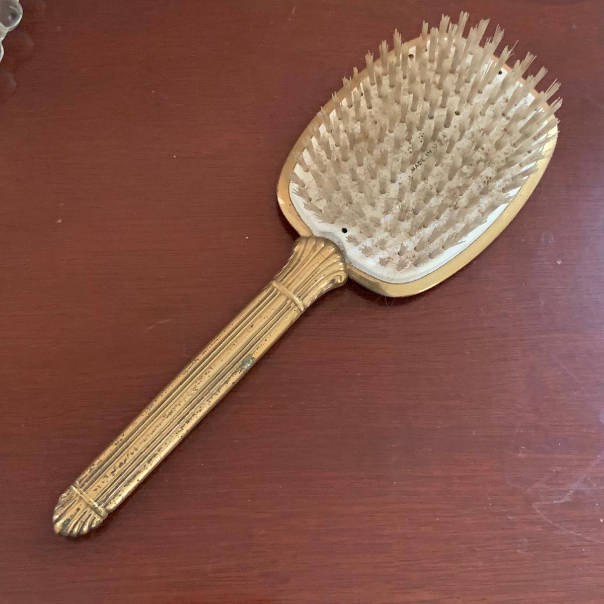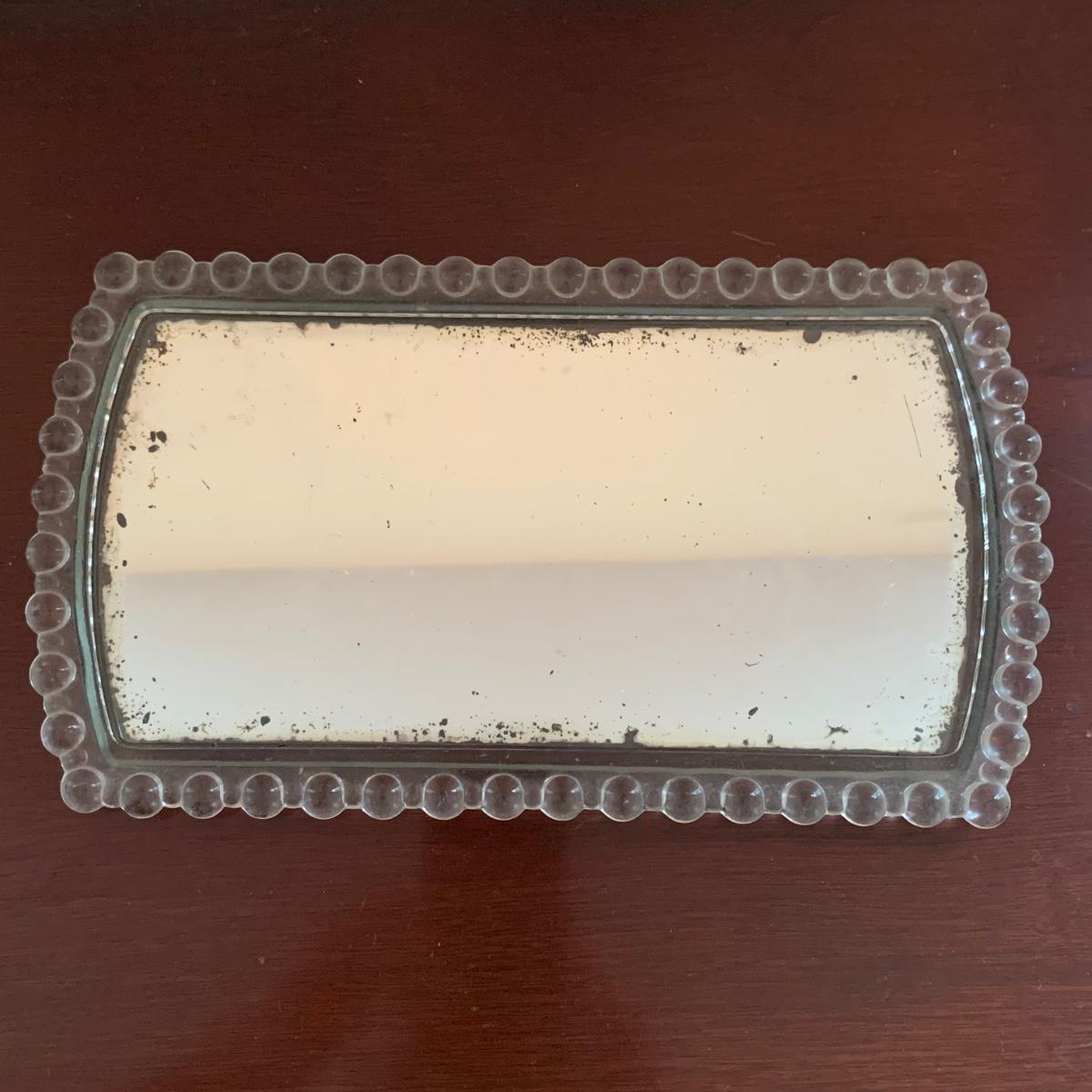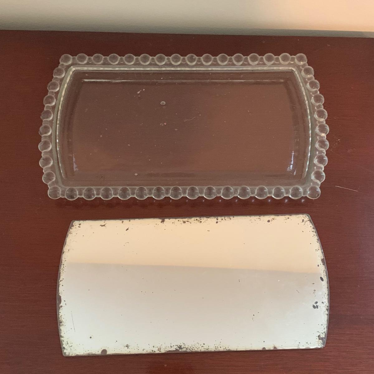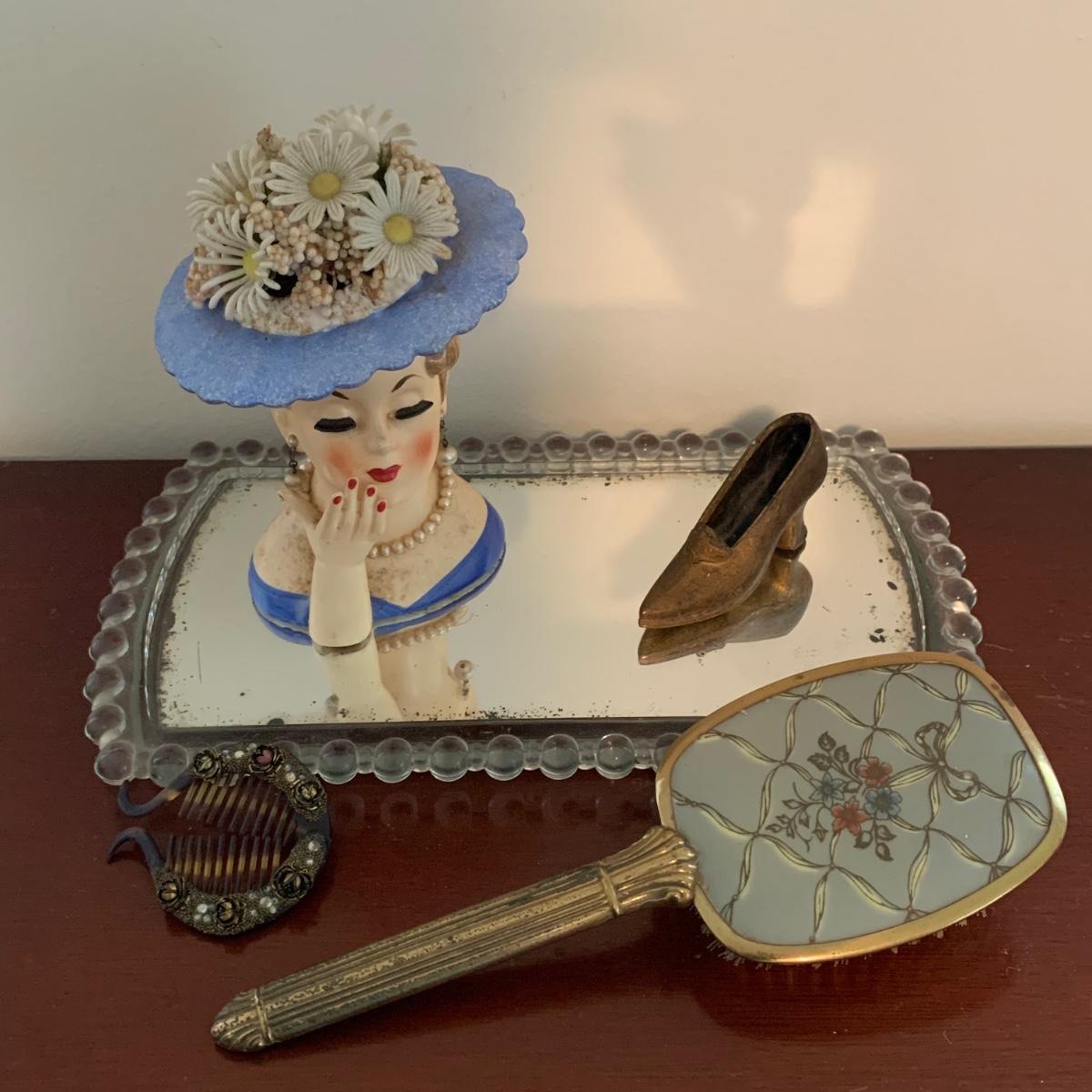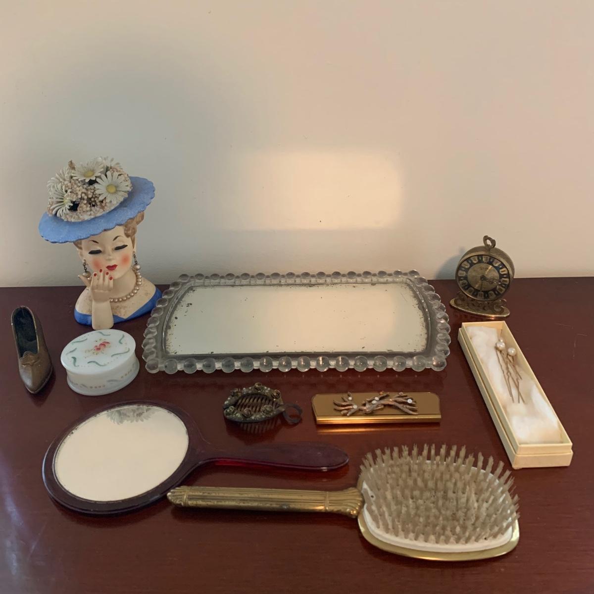 A collection of unique vintage ladies vanity items. Includes a bubble glass framed mirror-top tray, a ceramic lady with pearl jewelry, a little metal high heeled shoe, a round glass lidded container, a handheld mirror with a plastic handle, a metal hairbrush with soft bristles, a Swiss clock, and hair adornments. The tray measures 12” x 7”. Many items show wear, which adds to their vintage charm. Clock ticks when wound. Shipping available.