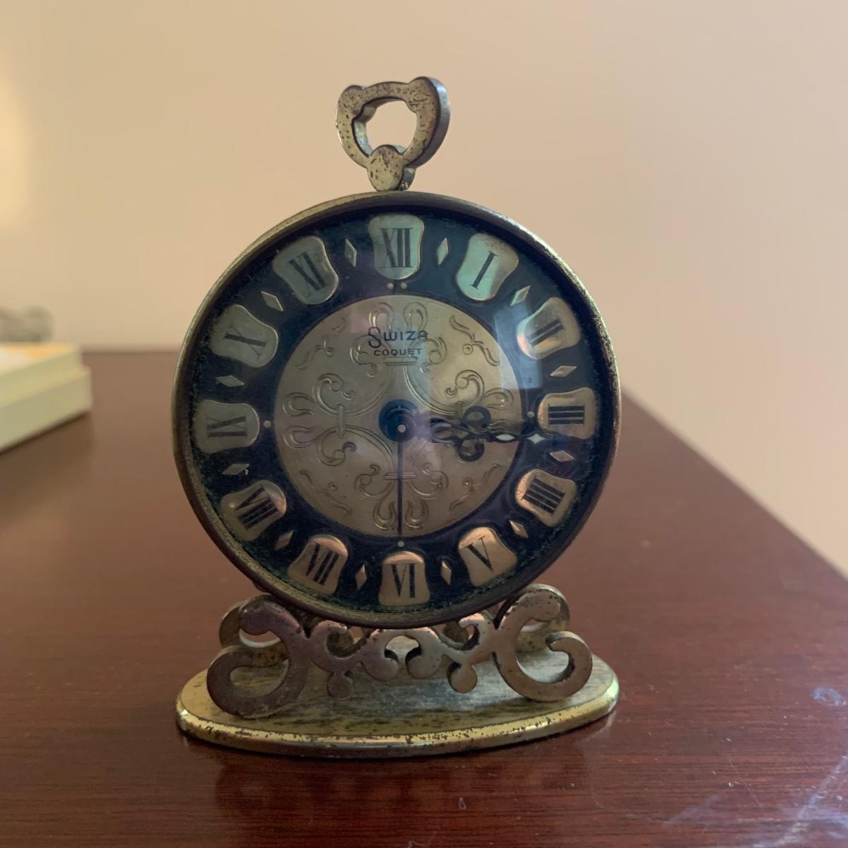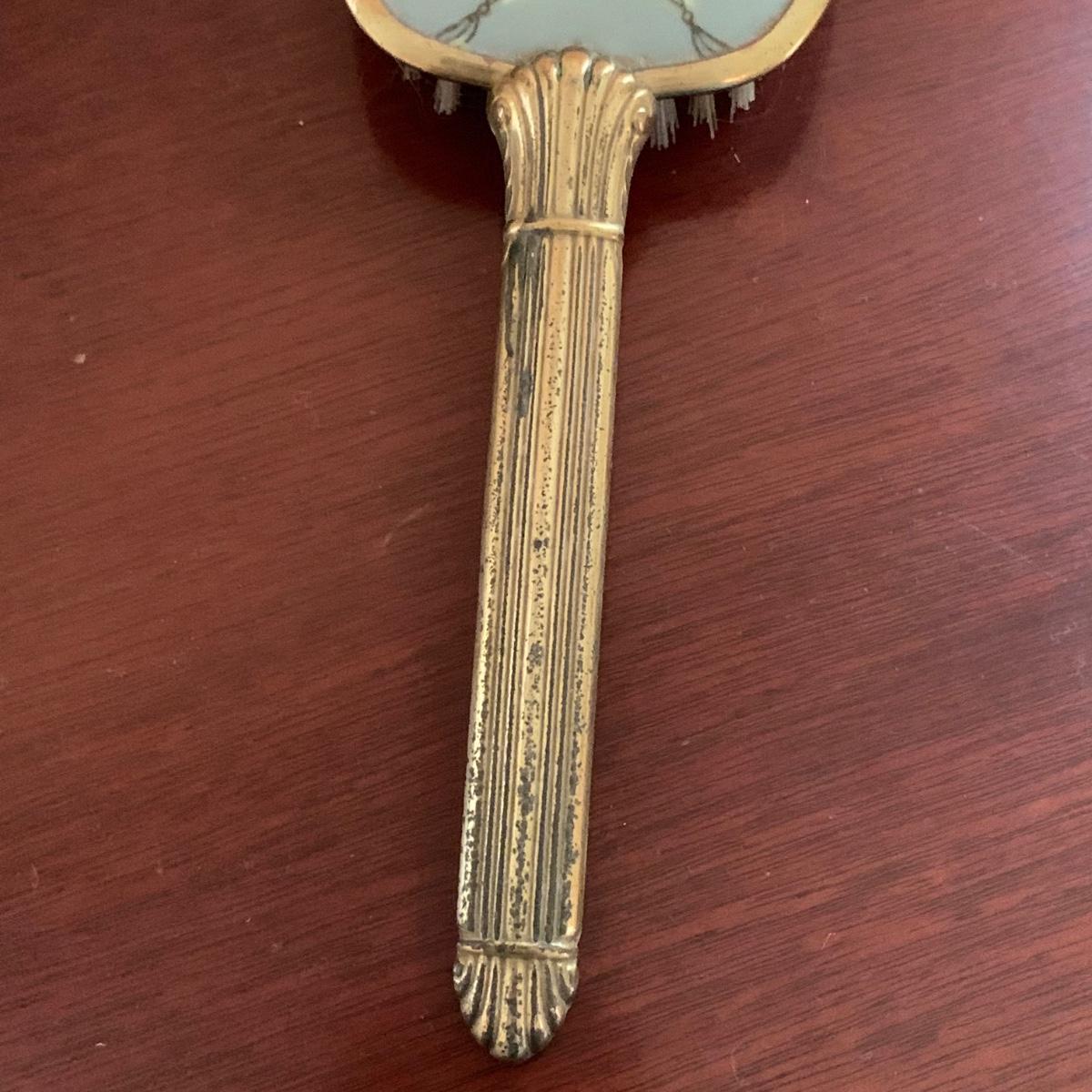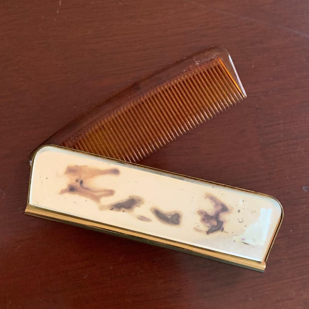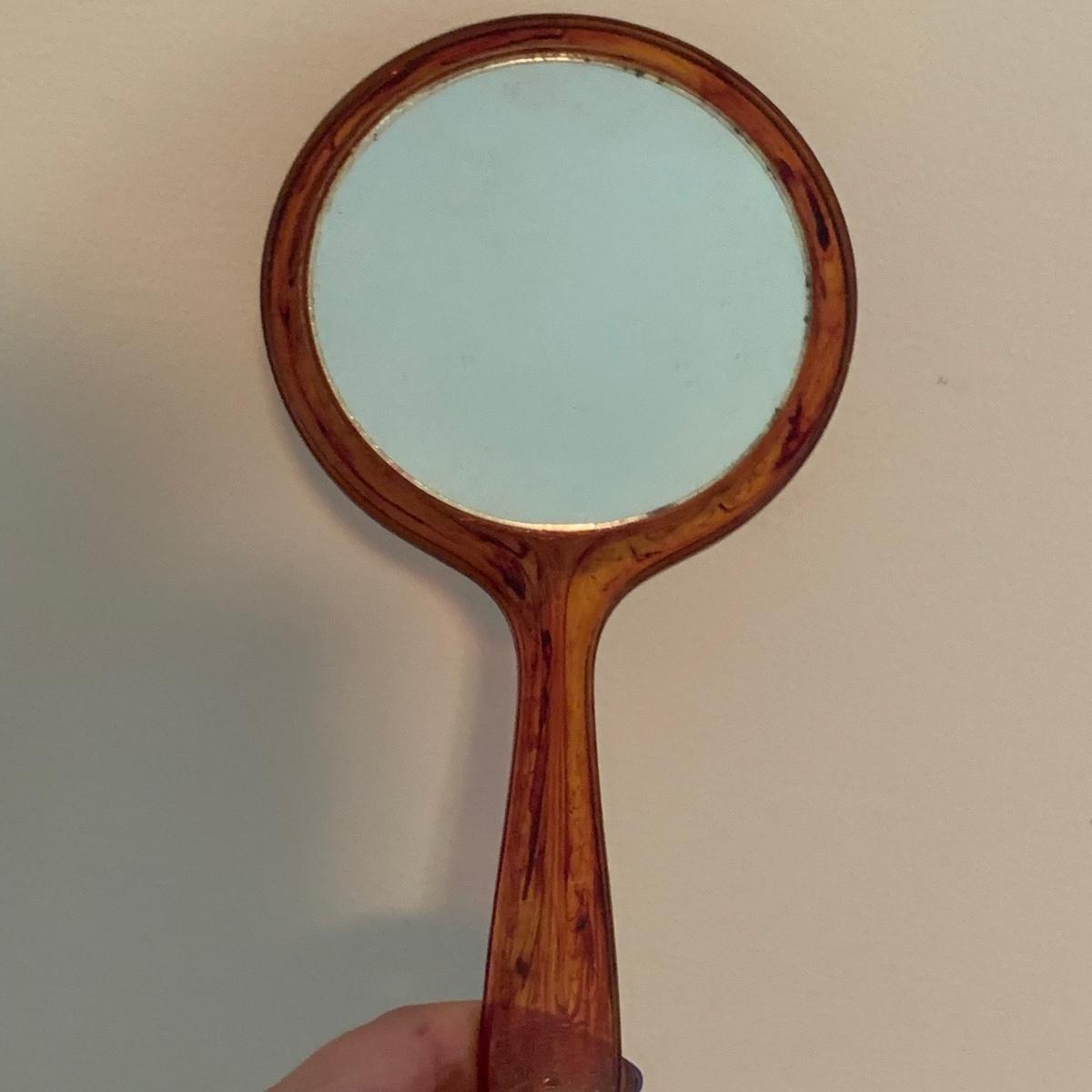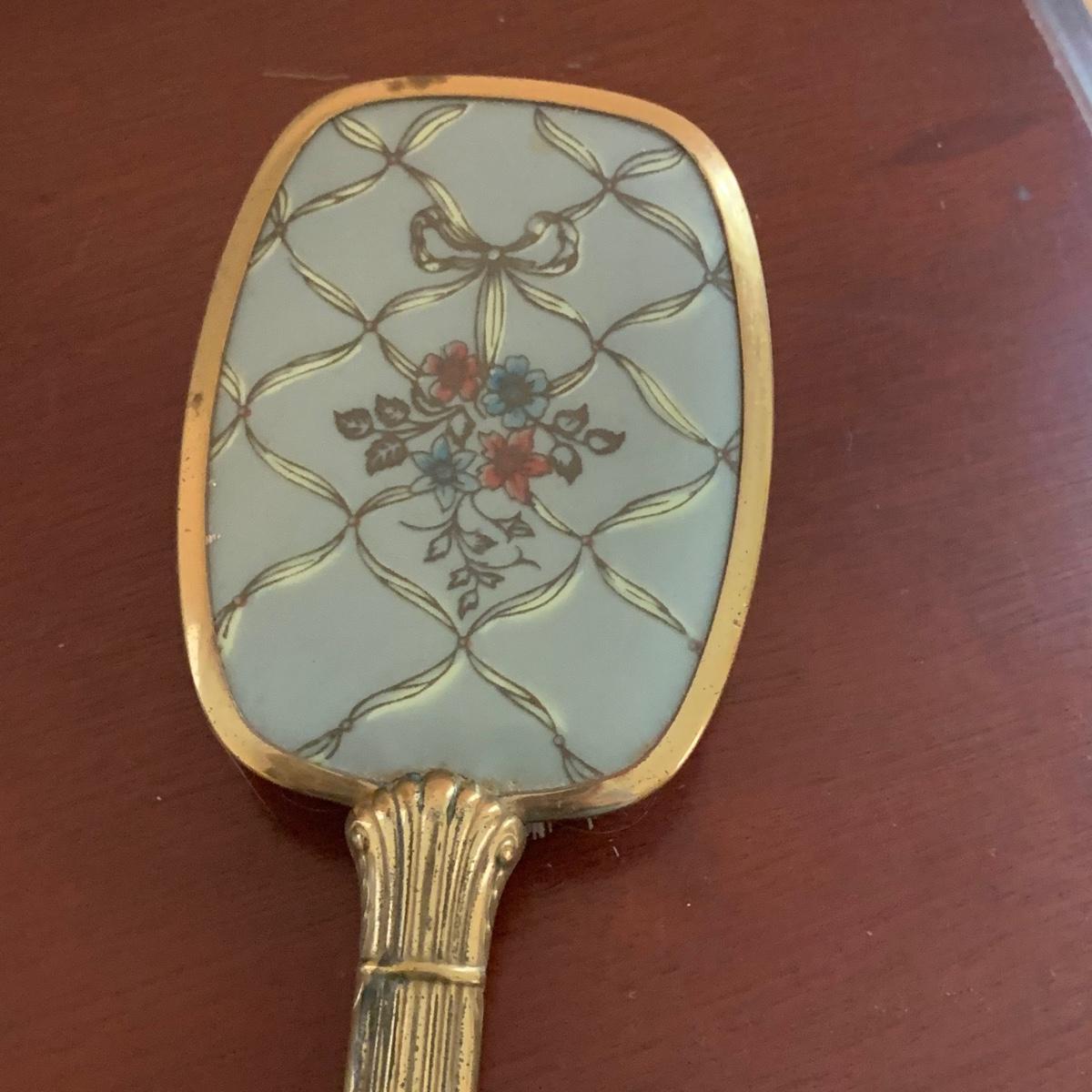 A collection of unique vintage ladies vanity items. Includes a bubble glass framed mirror-top tray, a ceramic lady with pearl jewelry, a little metal high heeled shoe, a round glass lidded container, a handheld mirror with a plastic handle, a metal hairbrush with soft bristles, a Swiss clock, and hair adornments. The tray measures 12” x 7”. Many items show wear, which adds to their vintage charm. Clock ticks when wound. Shipping available.