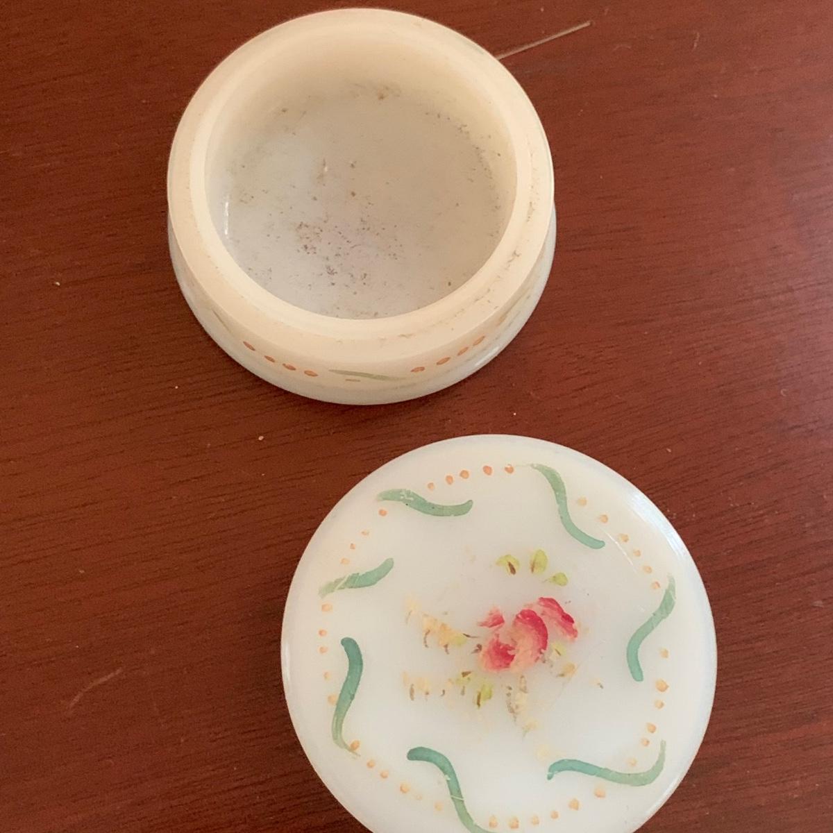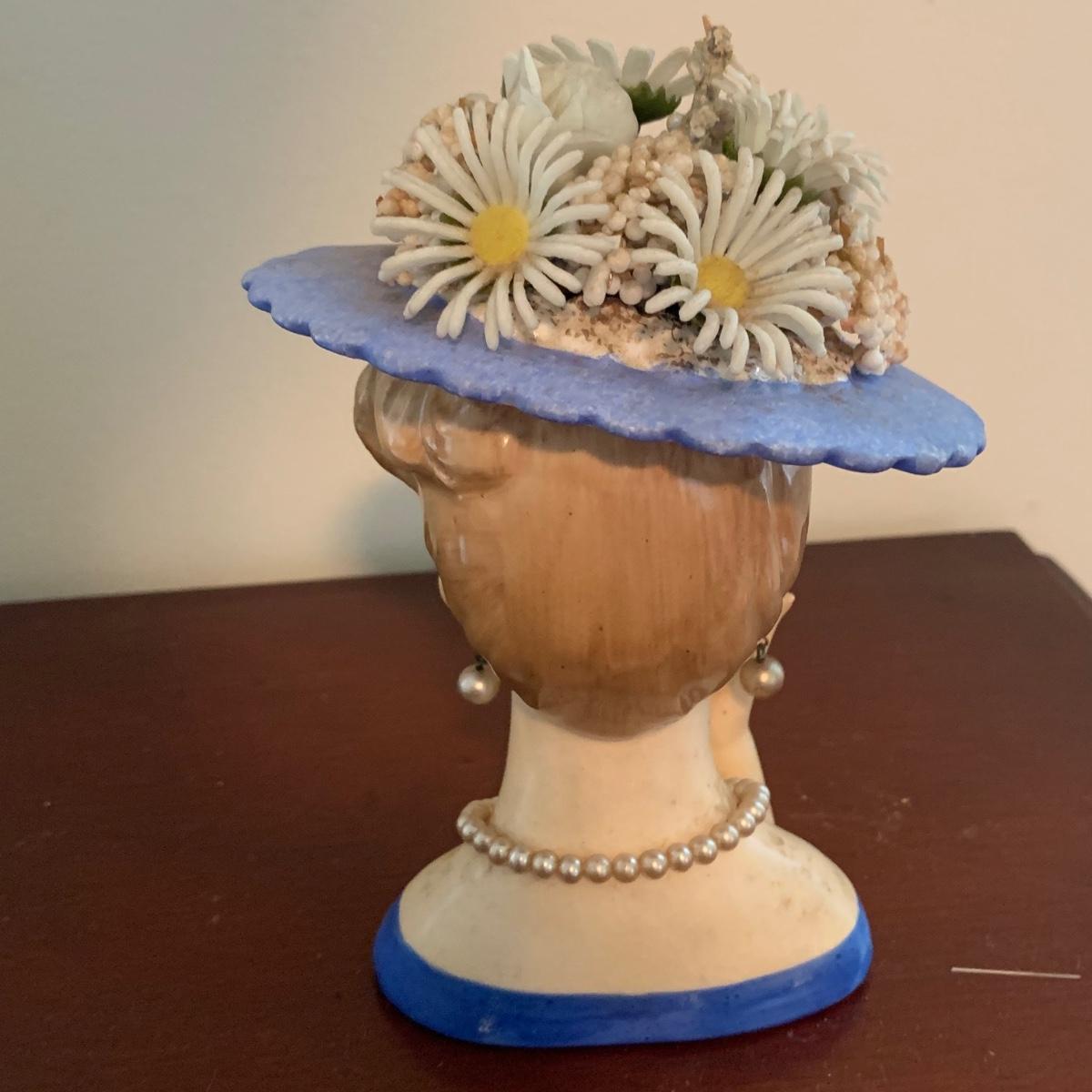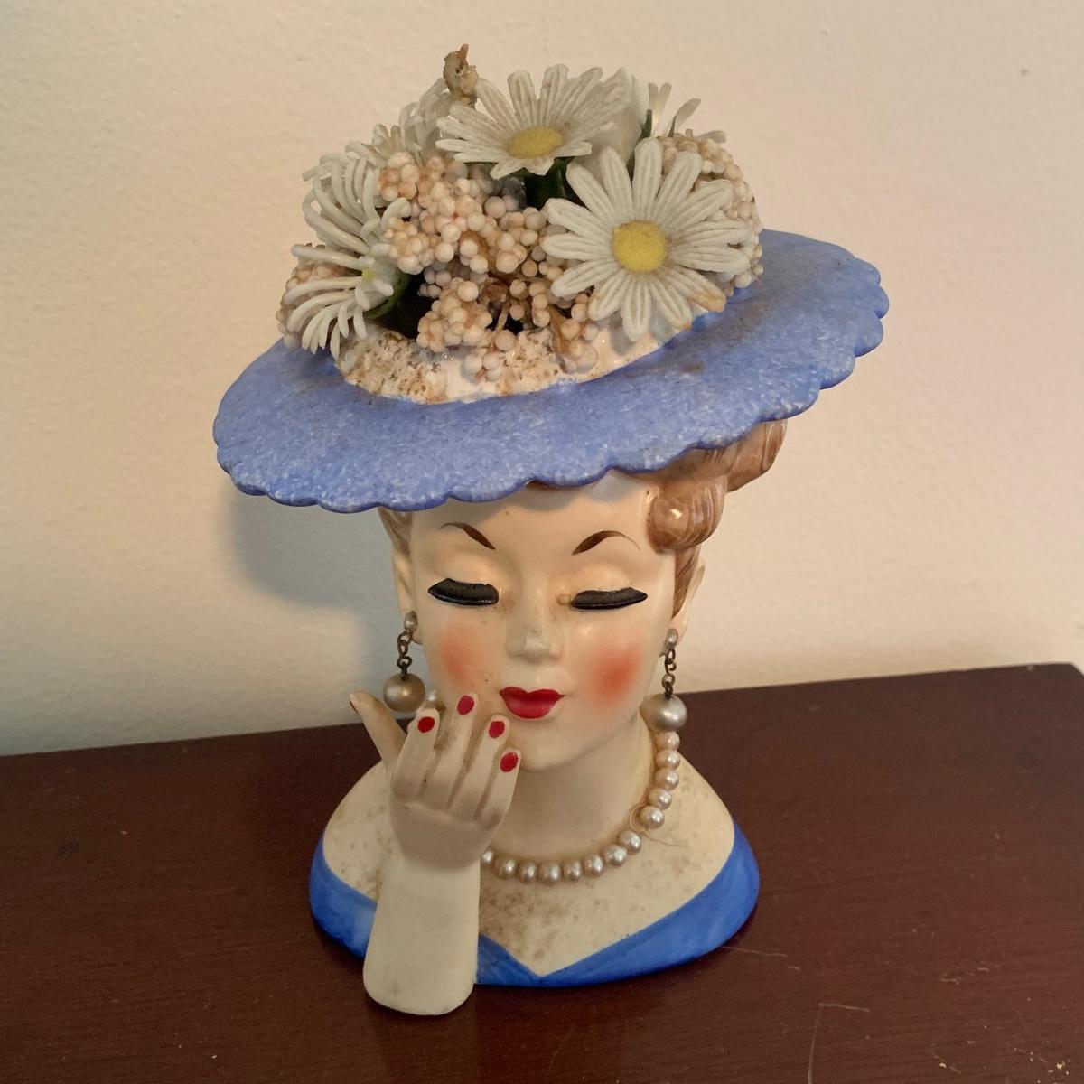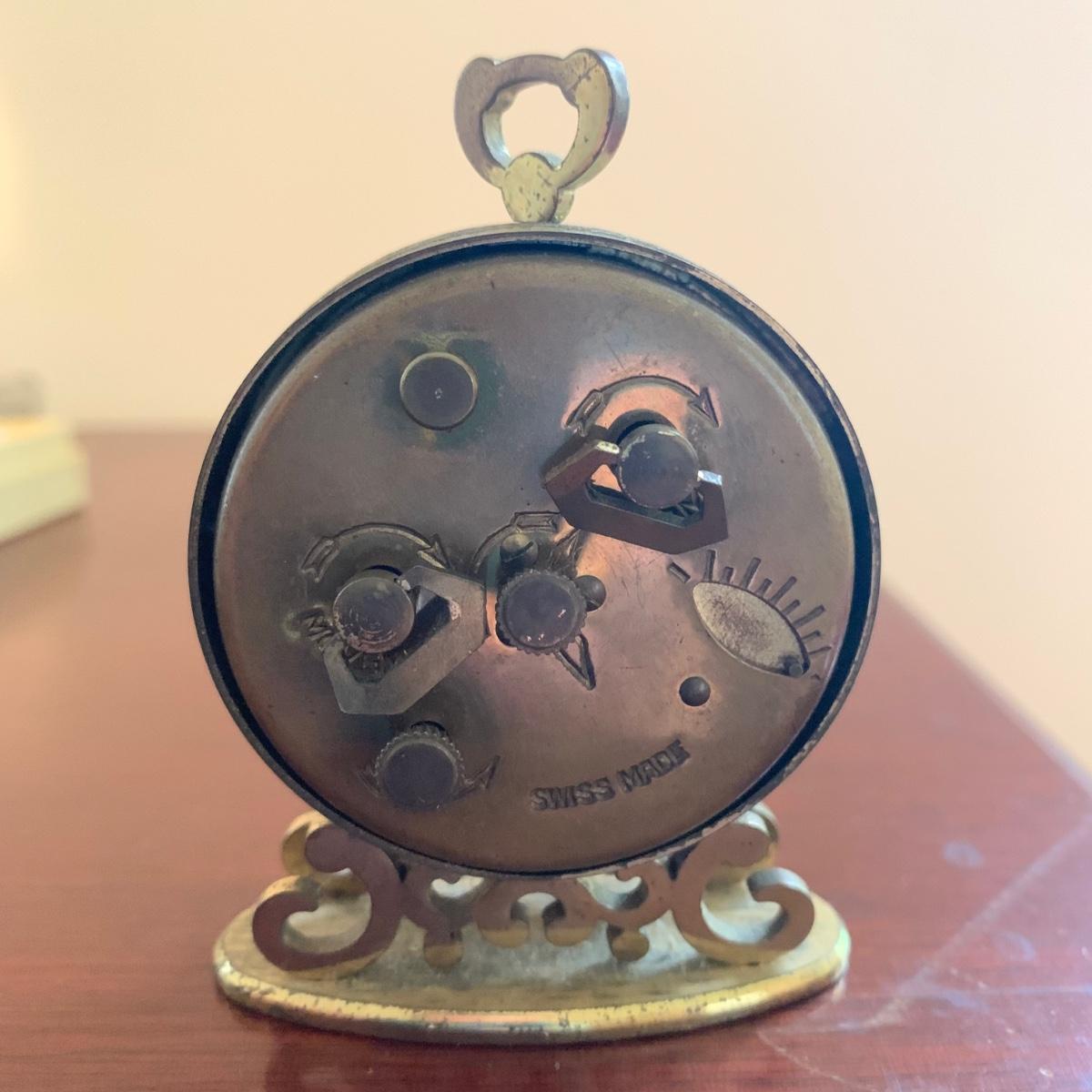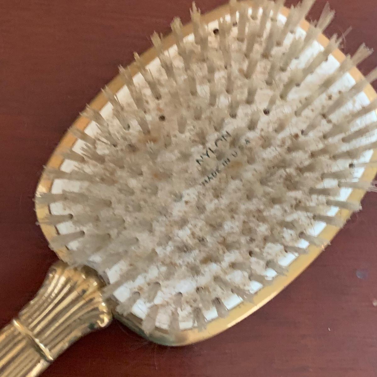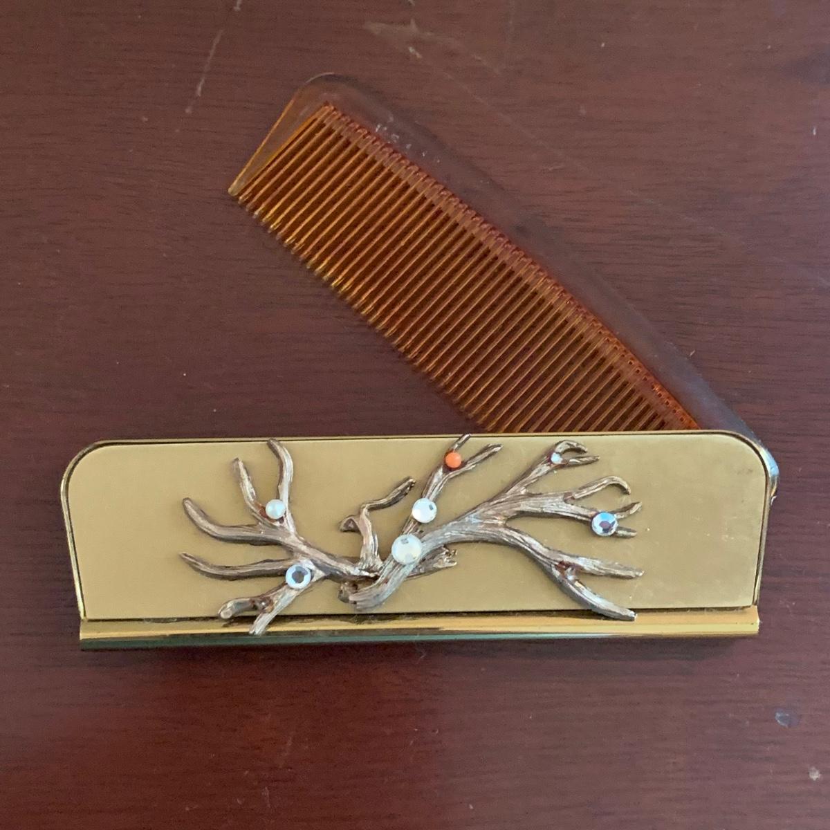A collection of unique vintage ladies vanity items. Includes a bubble glass framed mirror-top tray, a ceramic lady with pearl jewelry, a little metal high heeled shoe, a round glass lidded container, a handheld mirror with a plastic handle, a metal hairbrush with soft bristles, a Swiss clock, and hair adornments. The tray measures 12” x 7”. Many items show wear, which adds to their vintage charm. Clock ticks when wound. Shipping available.