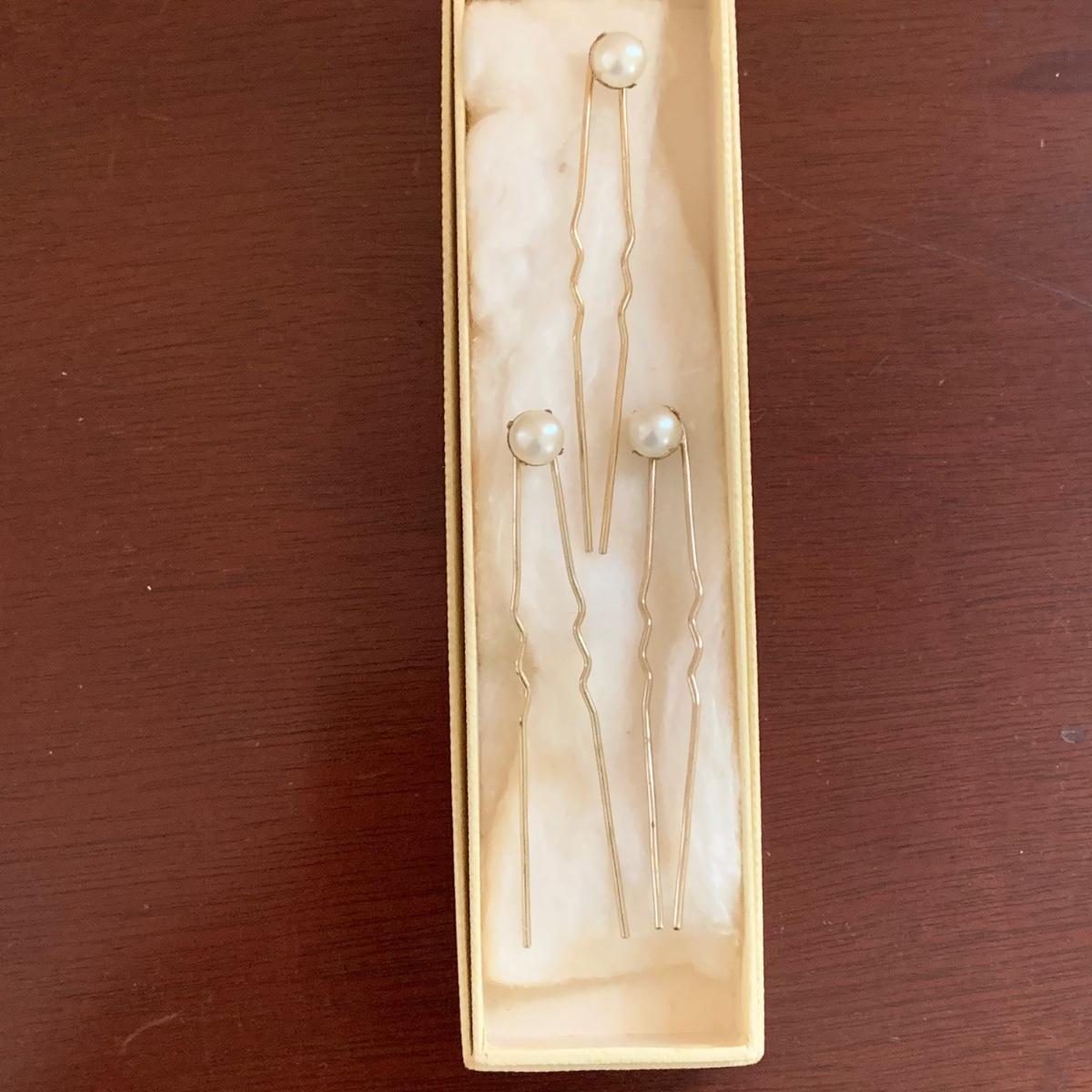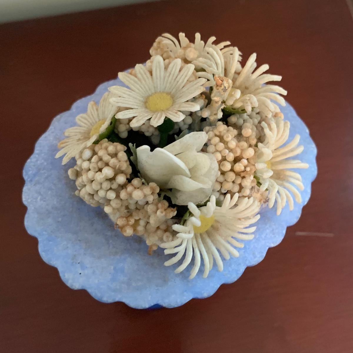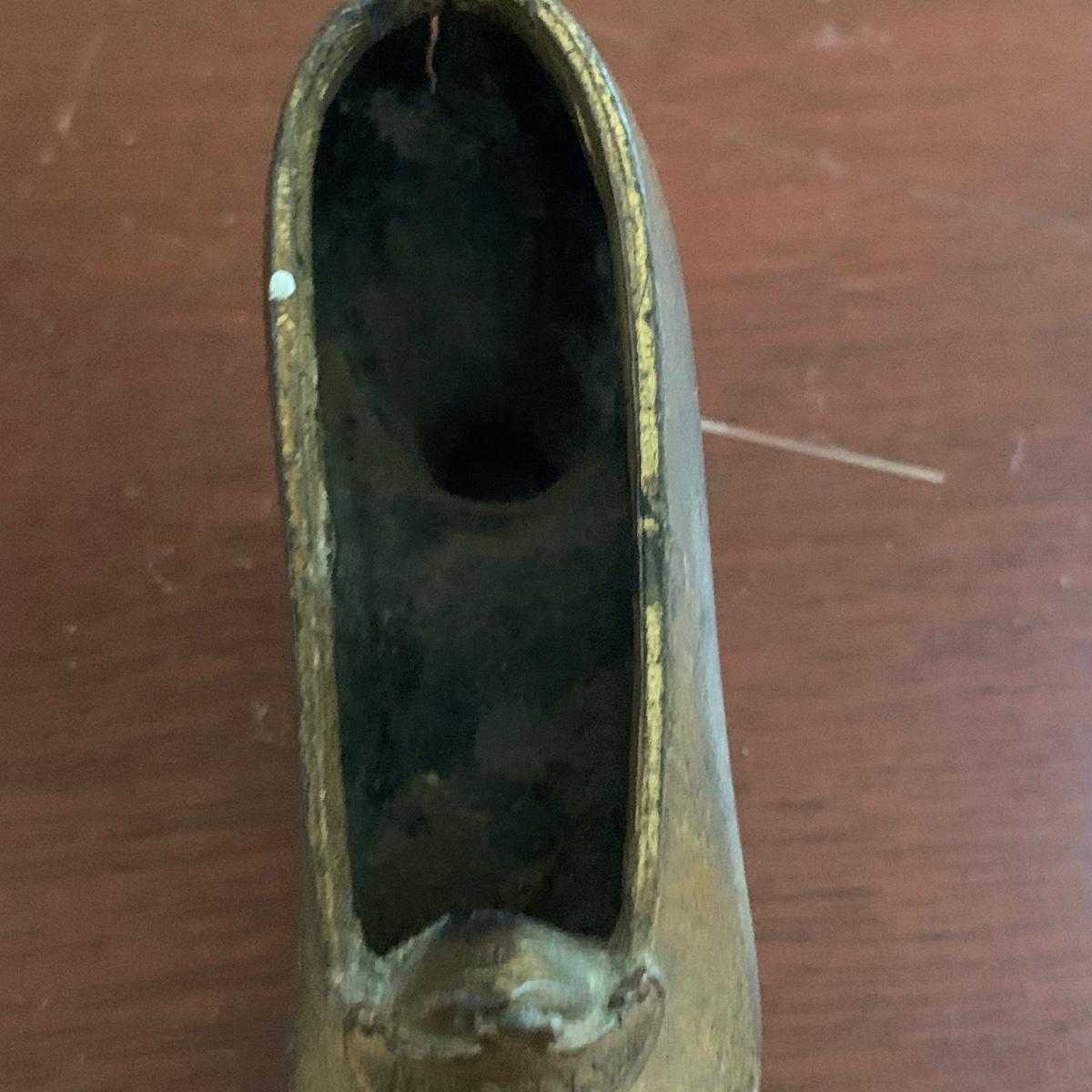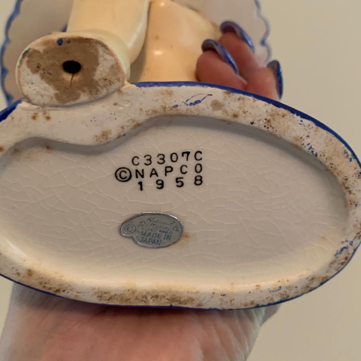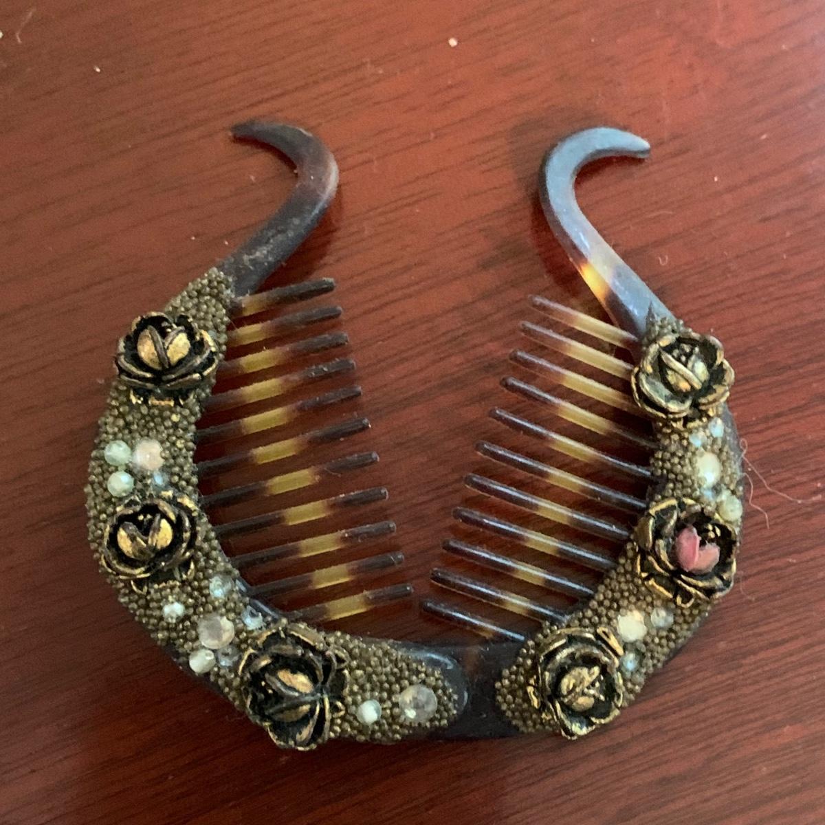 A collection of unique vintage ladies vanity items. Includes a bubble glass framed mirror-top tray, a ceramic lady with pearl jewelry, a little metal high heeled shoe, a round glass lidded container, a handheld mirror with a plastic handle, a metal hairbrush with soft bristles, a Swiss clock, and hair adornments. The tray measures 12” x 7”. Many items show wear, which adds to their vintage charm. Clock ticks when wound. Shipping available.