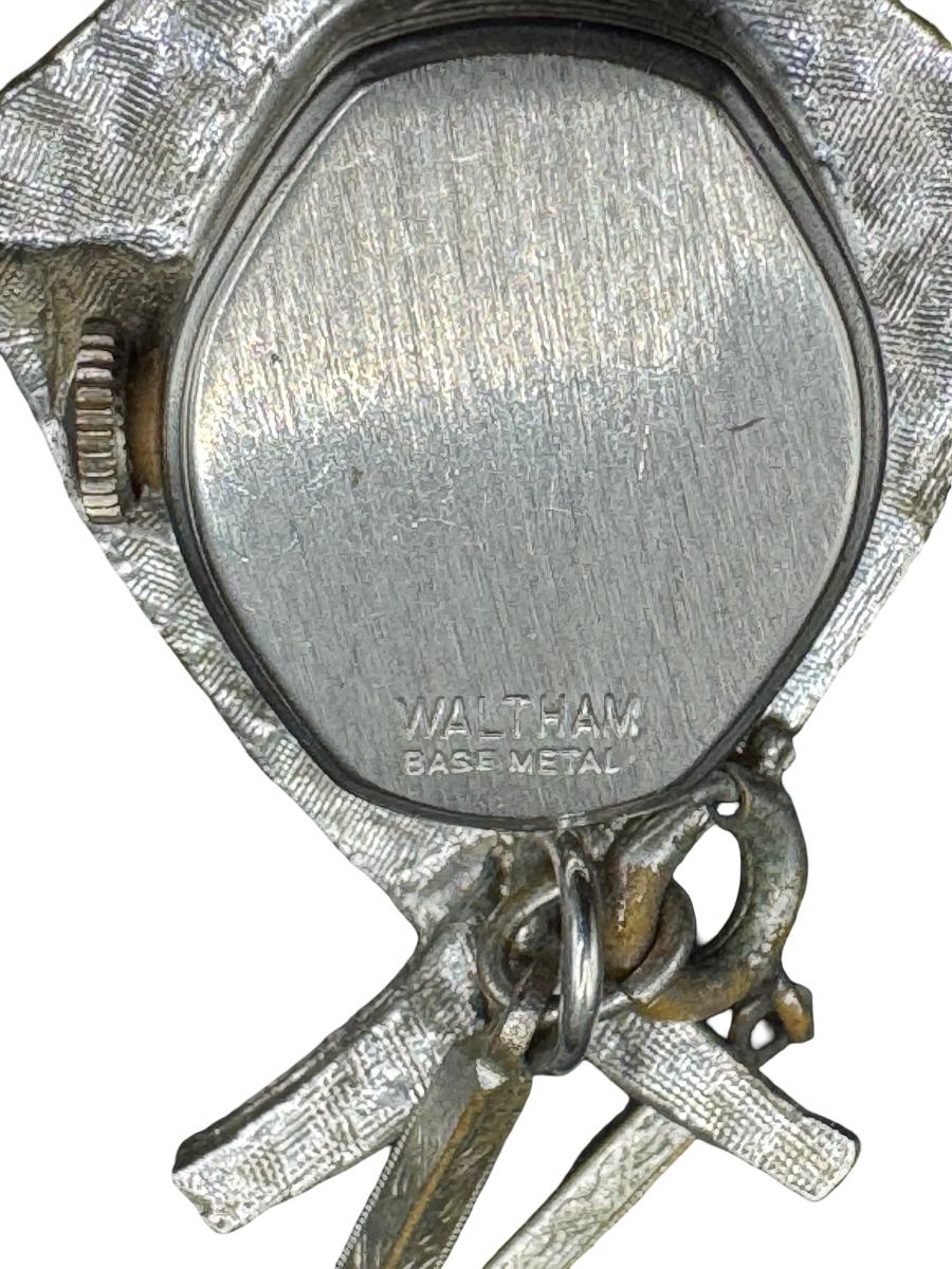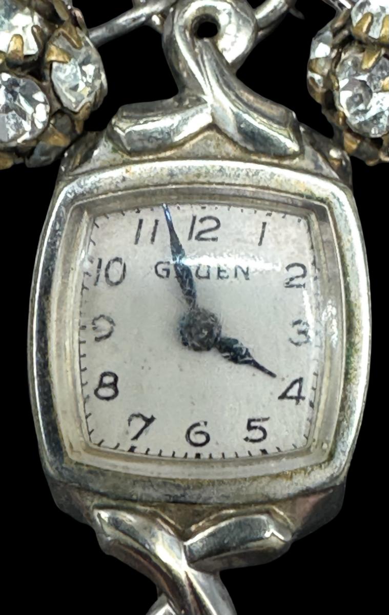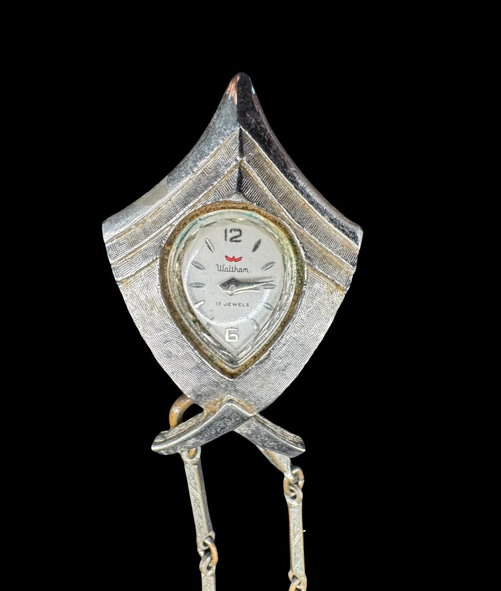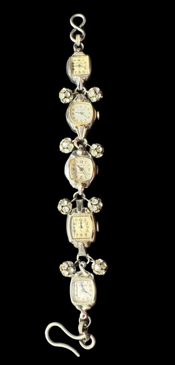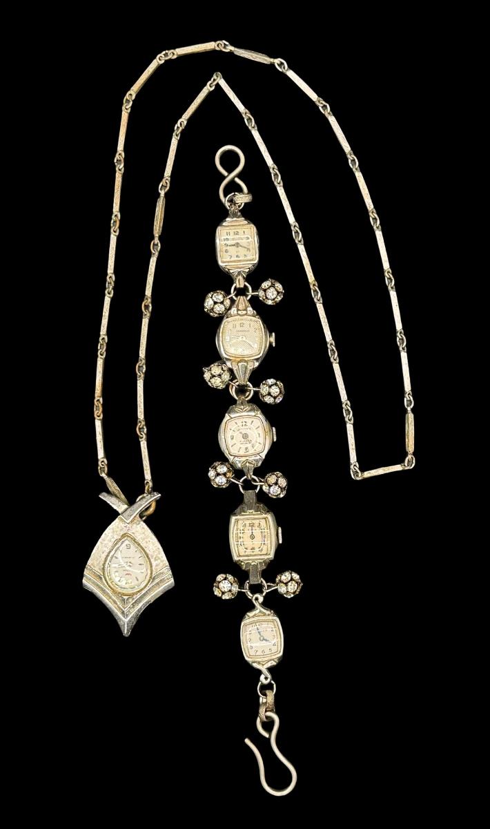 Includes a Waltham 17-jewel pendant watch on a chain; and a five-watch bracelet featuring Elgin (x2), Gruen, Caravelle, and Koury’s. Some are gold filled or rolled gold plate. Total of two pieces. Age related wear. Not tested. [JL]