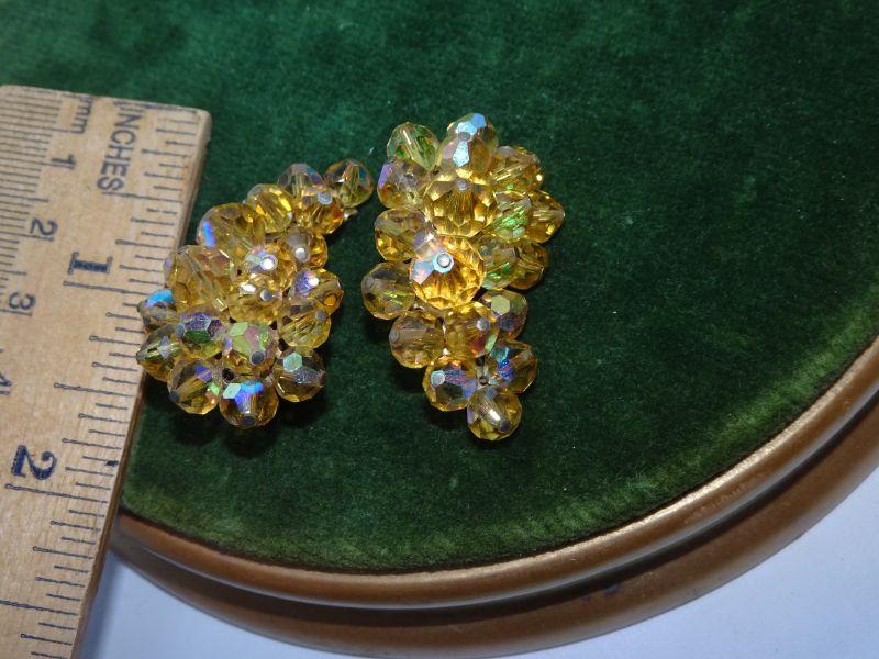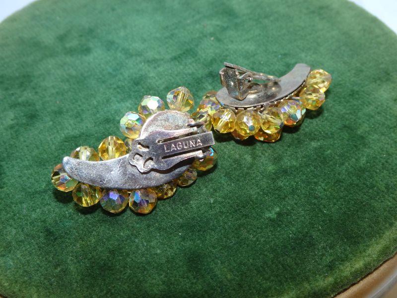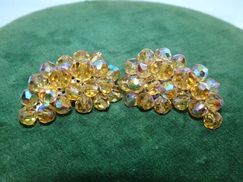 Vintage LAGUNA Clip On Earrings, Unique Beaded Crescent Shaped Clusters, Mid Century Glamour, Golden Rod Multicolor Beads AB Finish