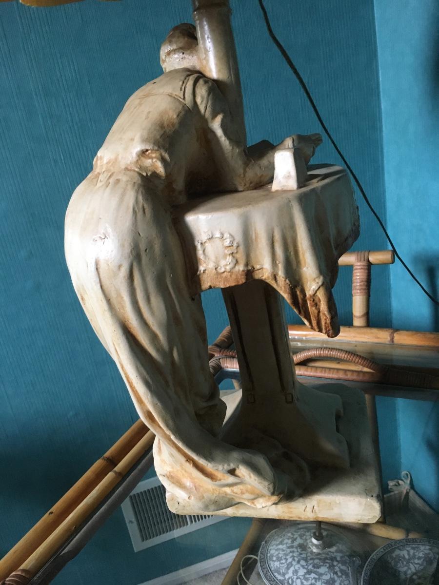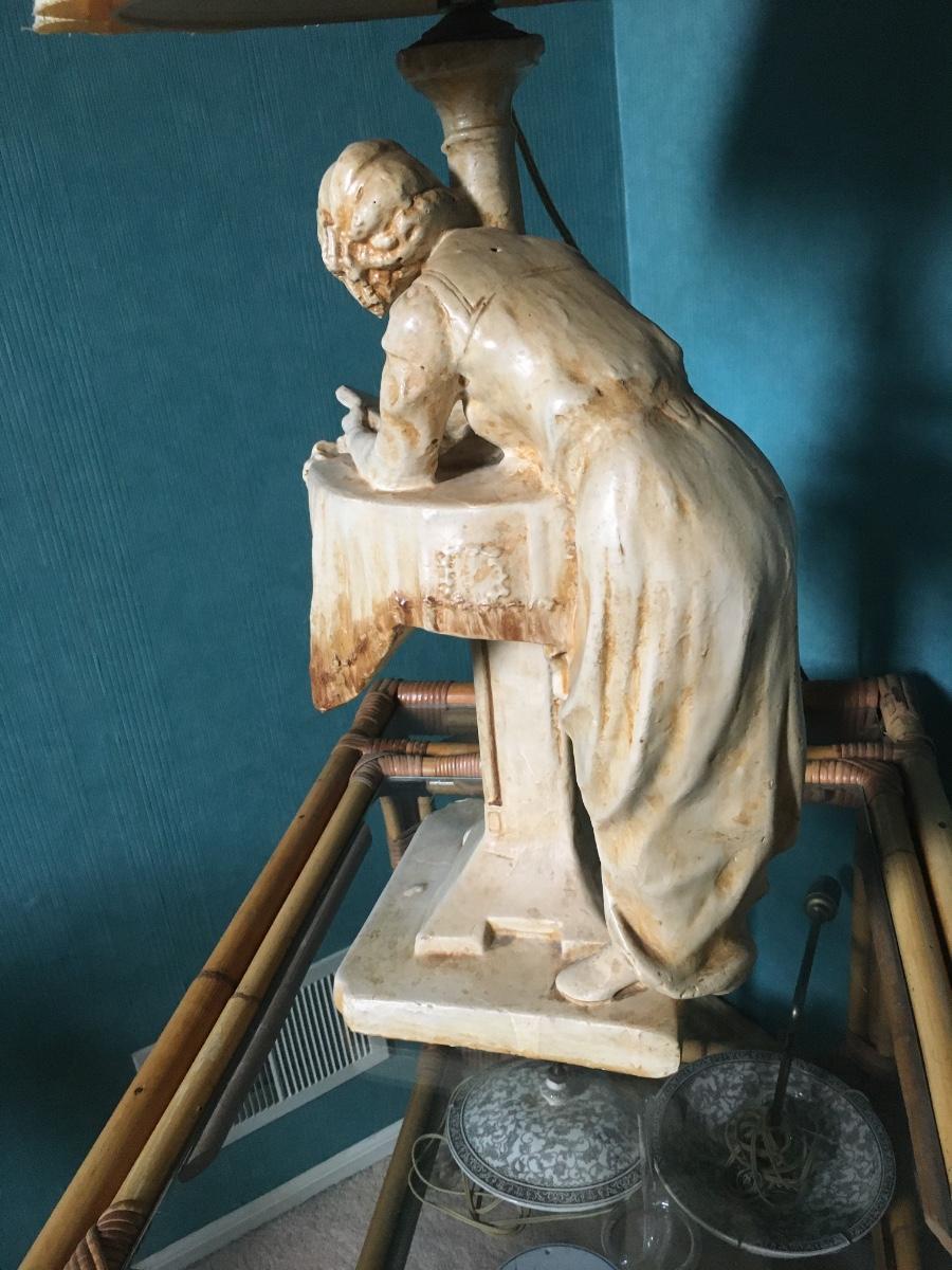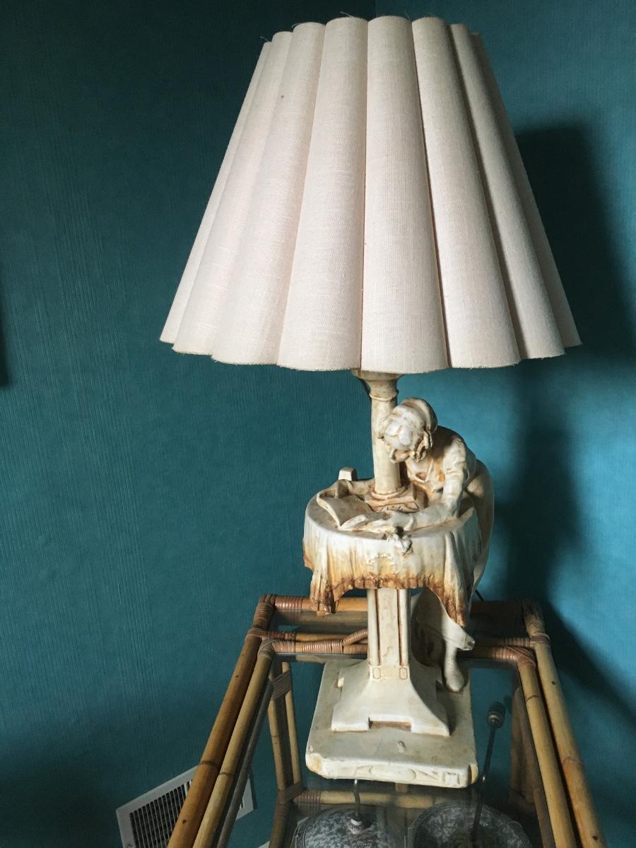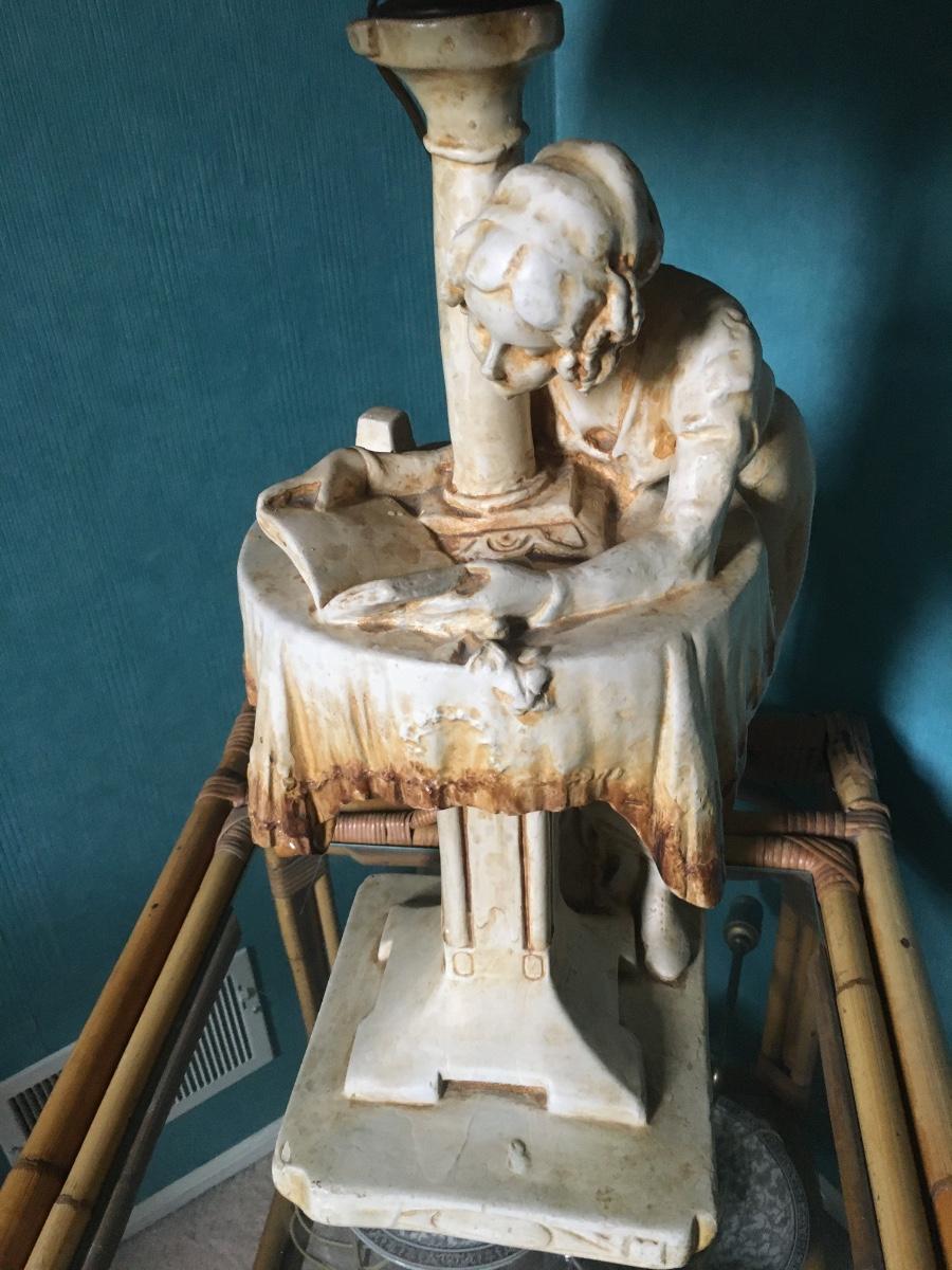Unique lamp has lady leaning over table reading book.. Measurmeents in photos indicatehow large a lamp this is. In excellent condition.