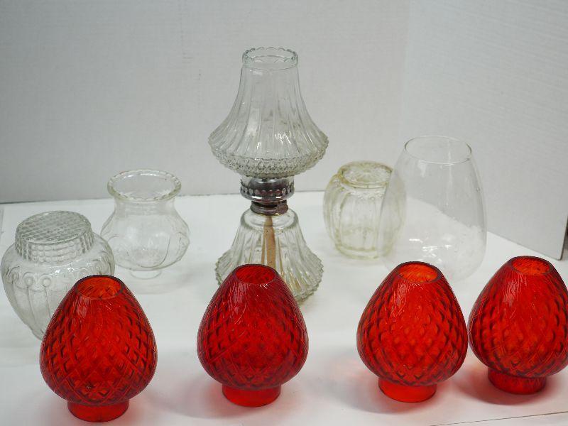 Lot 121 Lamp Light Farms oil kerosene lamp red quilted light globes. Lot 21 Lamp Light Farms oil kerosene lamp red quilted light globes Vintage clear glass Lamp Light farms oil kerosene lamp and red quilted light globes, 4 other clear glass light covers antique. The flat wick lamp is not in working order, needs new burner and wick. Glass globes are in great condition for age. The reds are a fabulous color! can be shipped kit is over 24 lbs so cost is about $100 to the East Coast