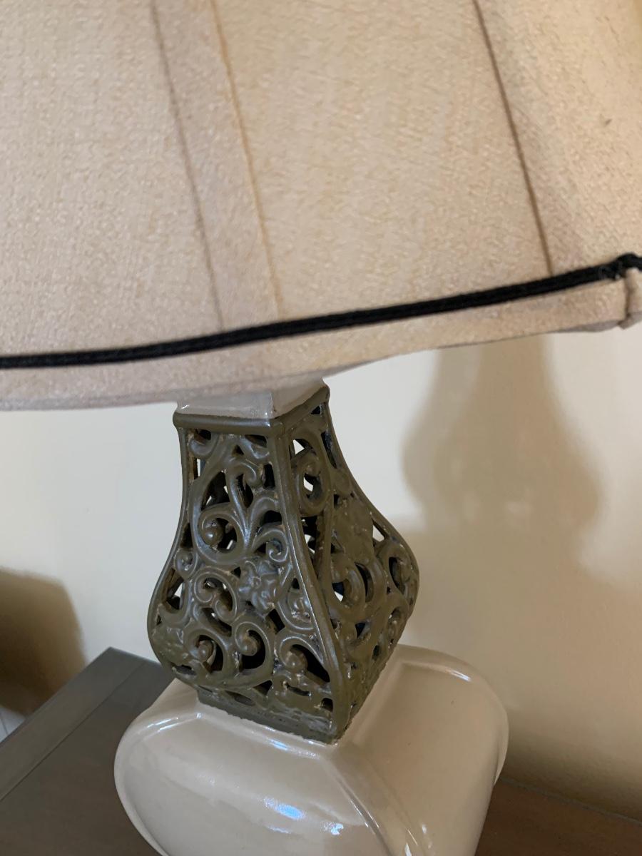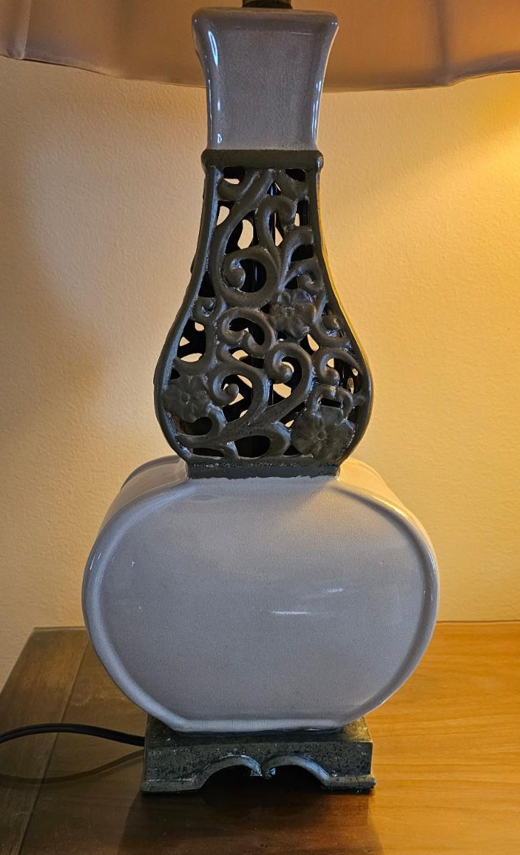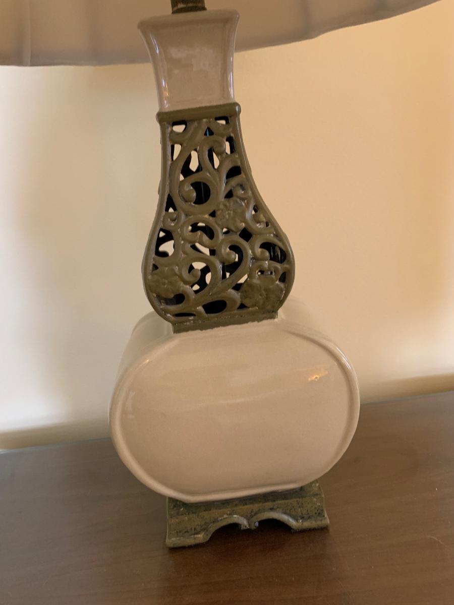Ceramic lamp, 2 colors, with lacy cut out center design. Trim accent on shade