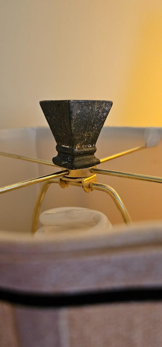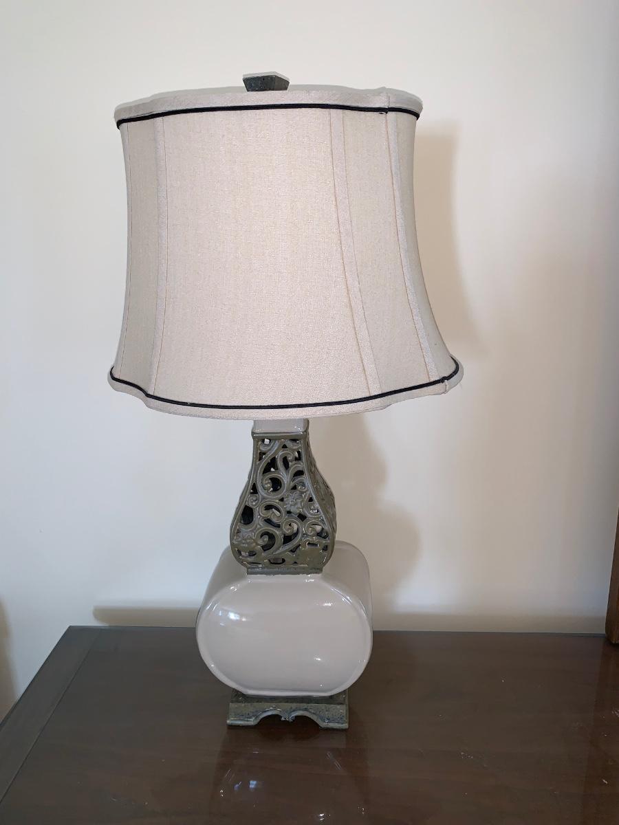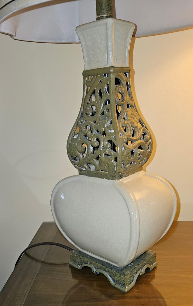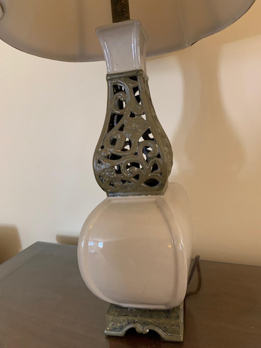Ceramic lamp, 2 colors, with lacy cut out center design. Trim accent on shade
