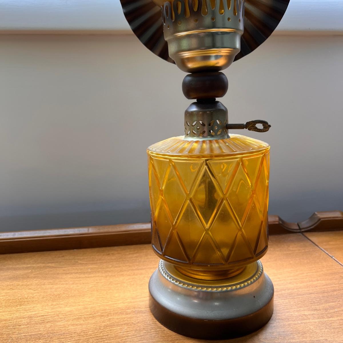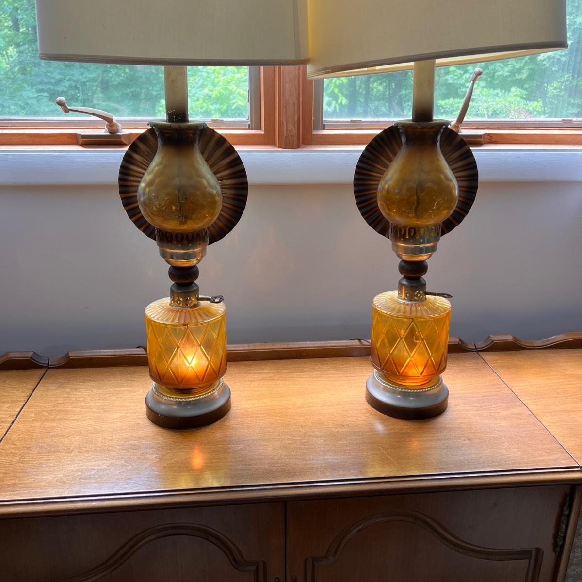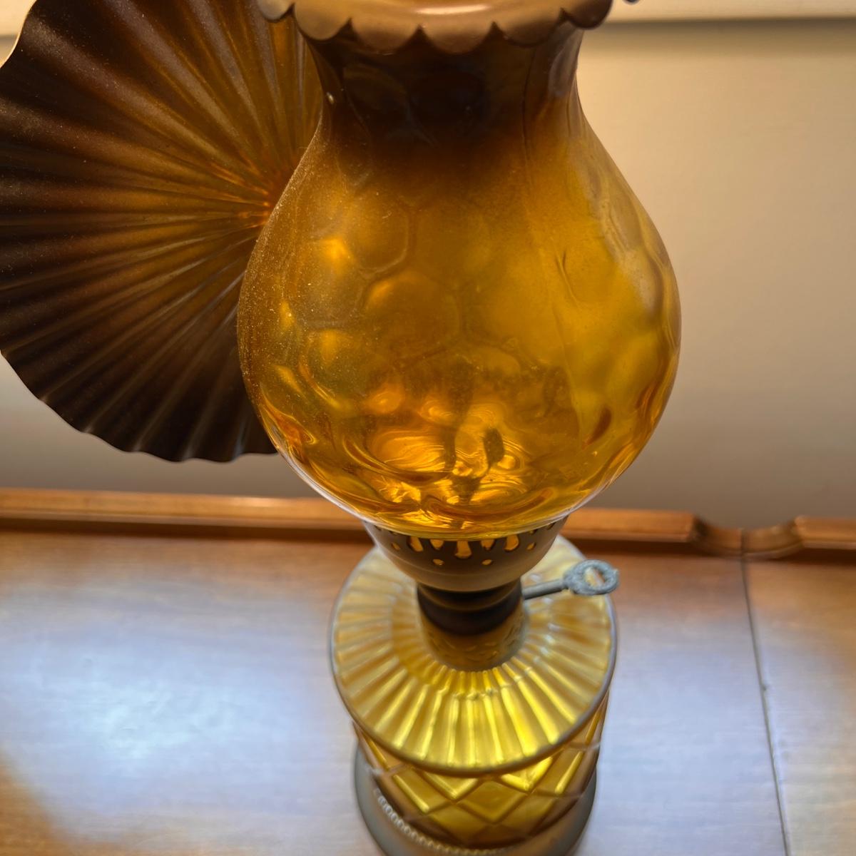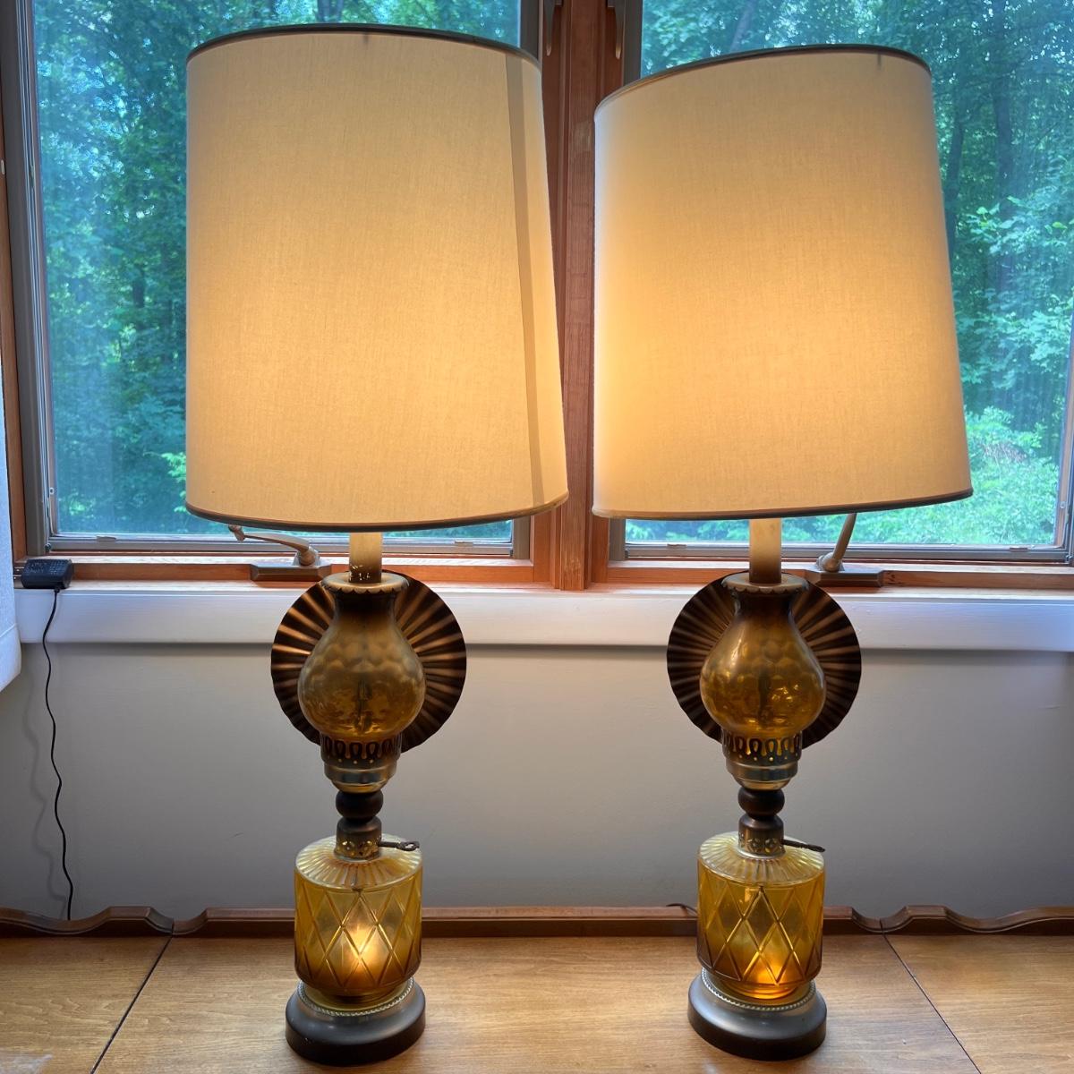 Both are working. 3 way light - base, top or base and top. Great condition. Yellow amber glass and metal.