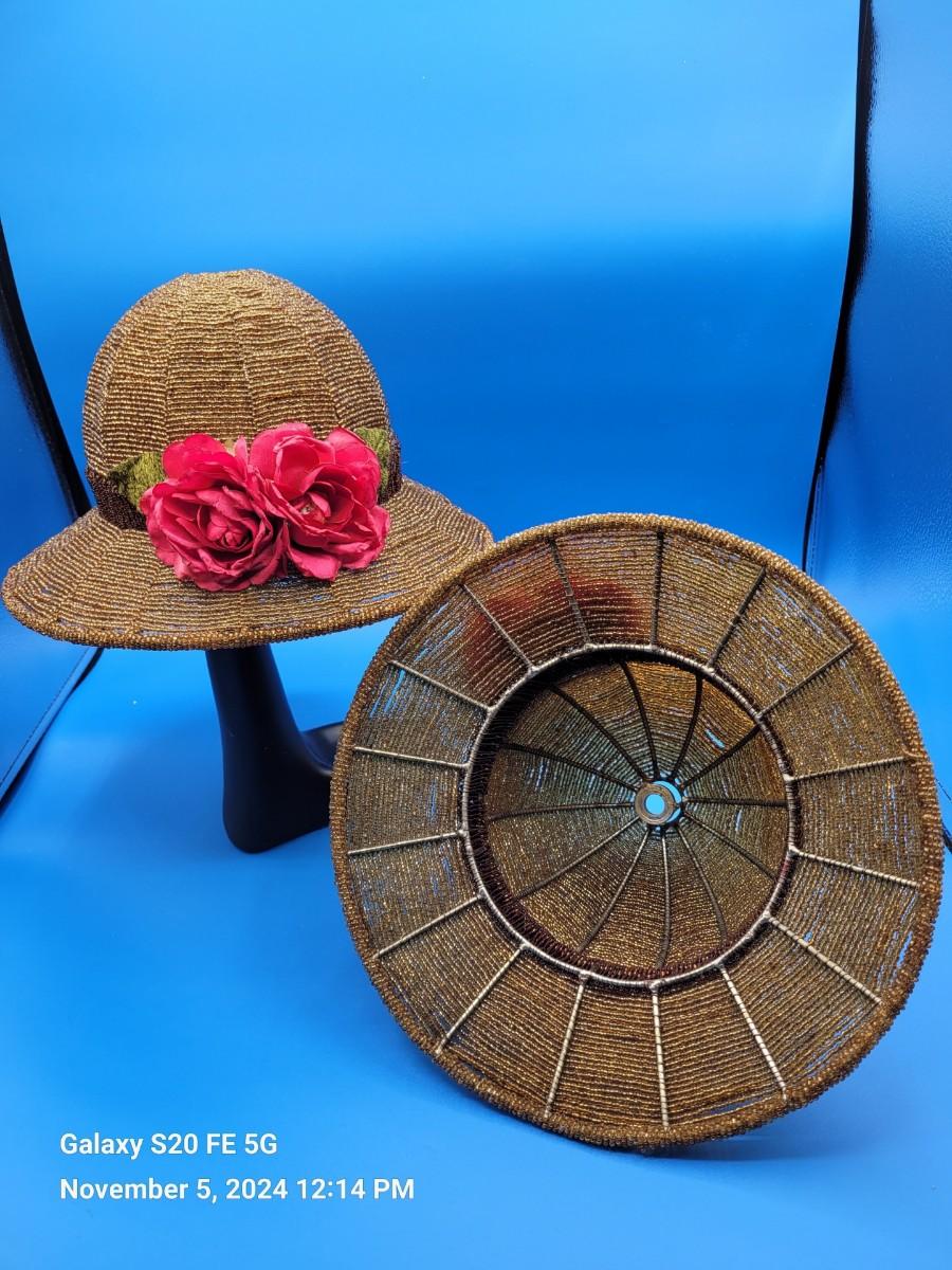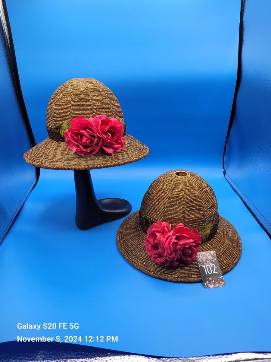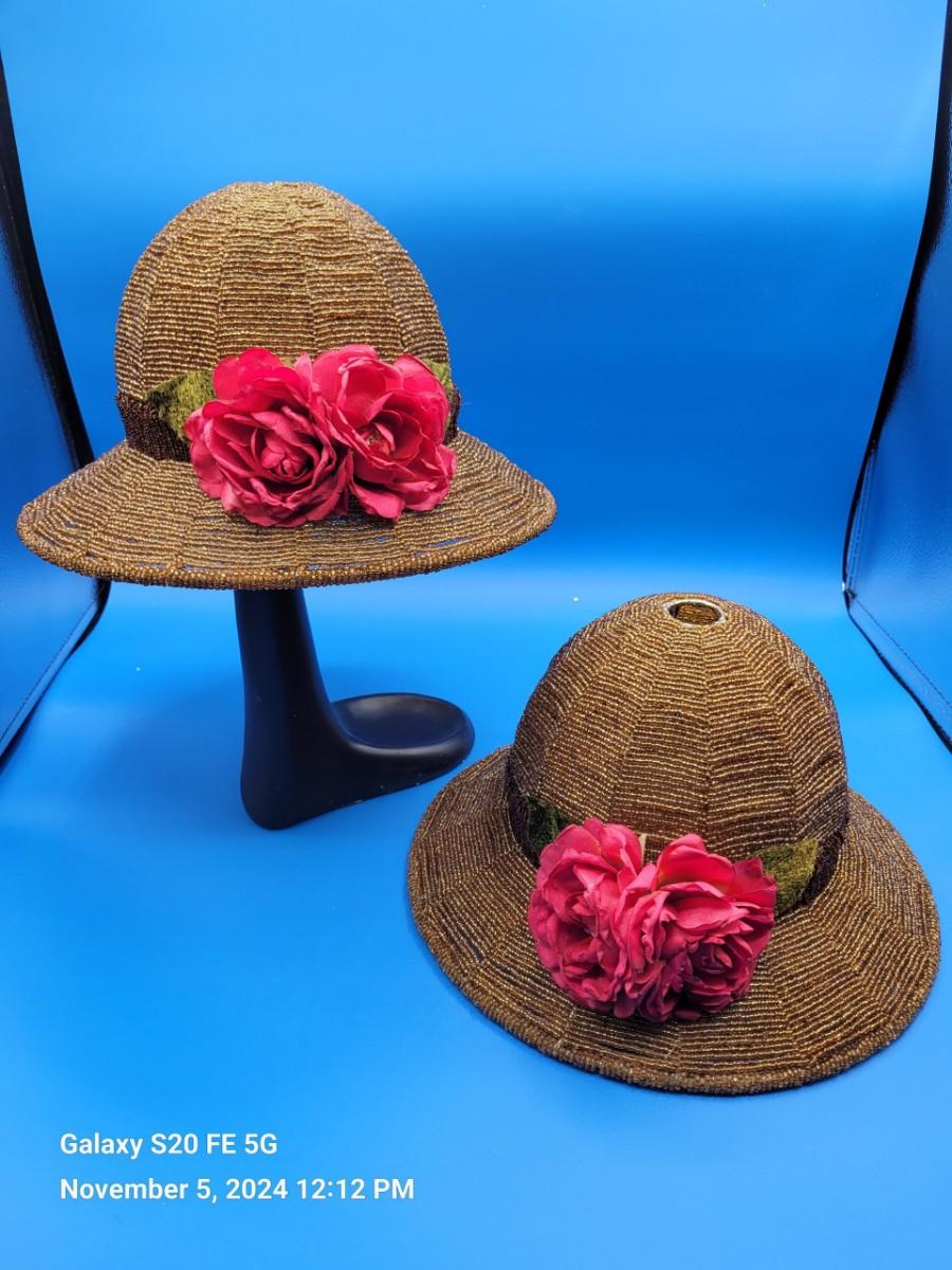 Hat shaped beaded lampshades, 2, with rose trim.